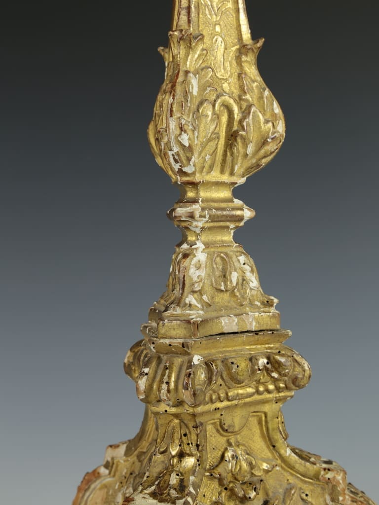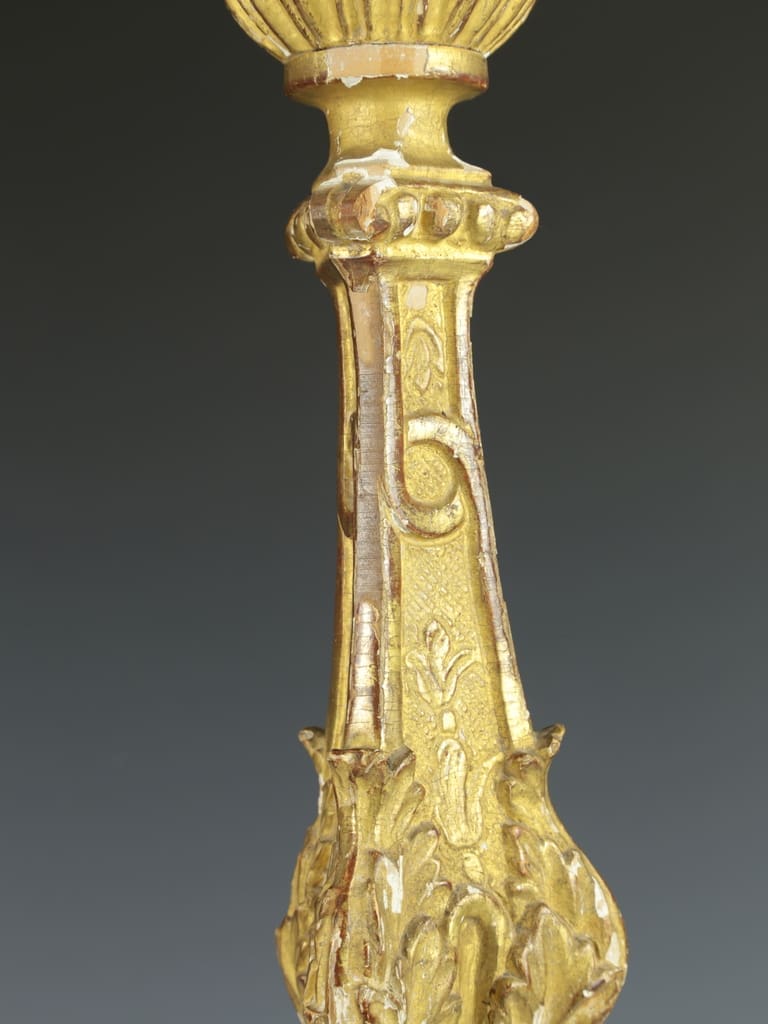 This decorative Italian altar candlestick, dating from the late 17th to early 18th century, is a remarkable piece of history. Hand-carved in wood and adorned with gesso and gilding, it would have originally graced a Palazzo or church altar.