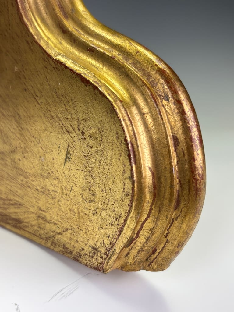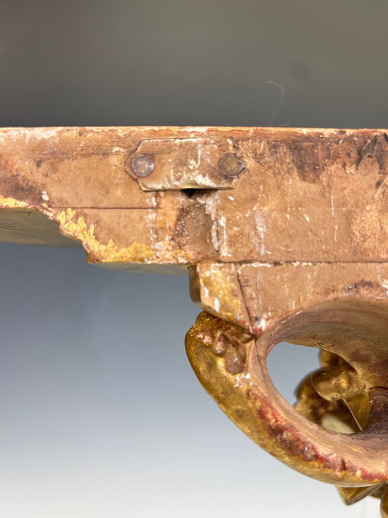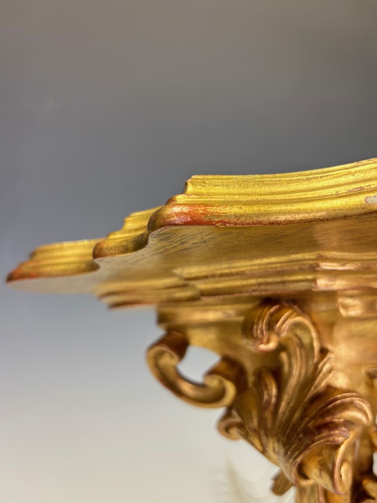 The shaped top, designed to display a vase, clock, or objet d’art, is supported by a deeply undercut framework of C-scrolls and flowers. The surface is gilded throughout, enriched with traces of red bole glowing through in areas of natural wear, giving warmth and depth to the carving.