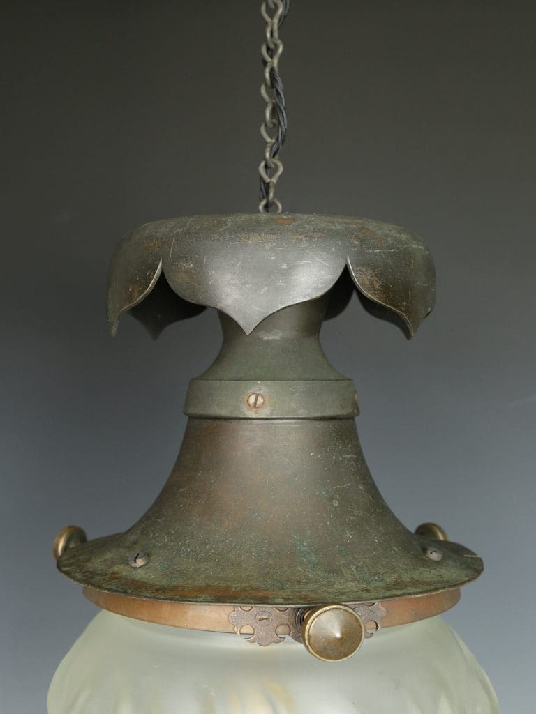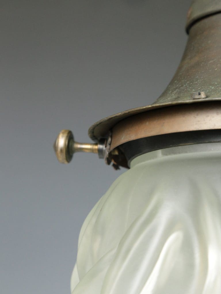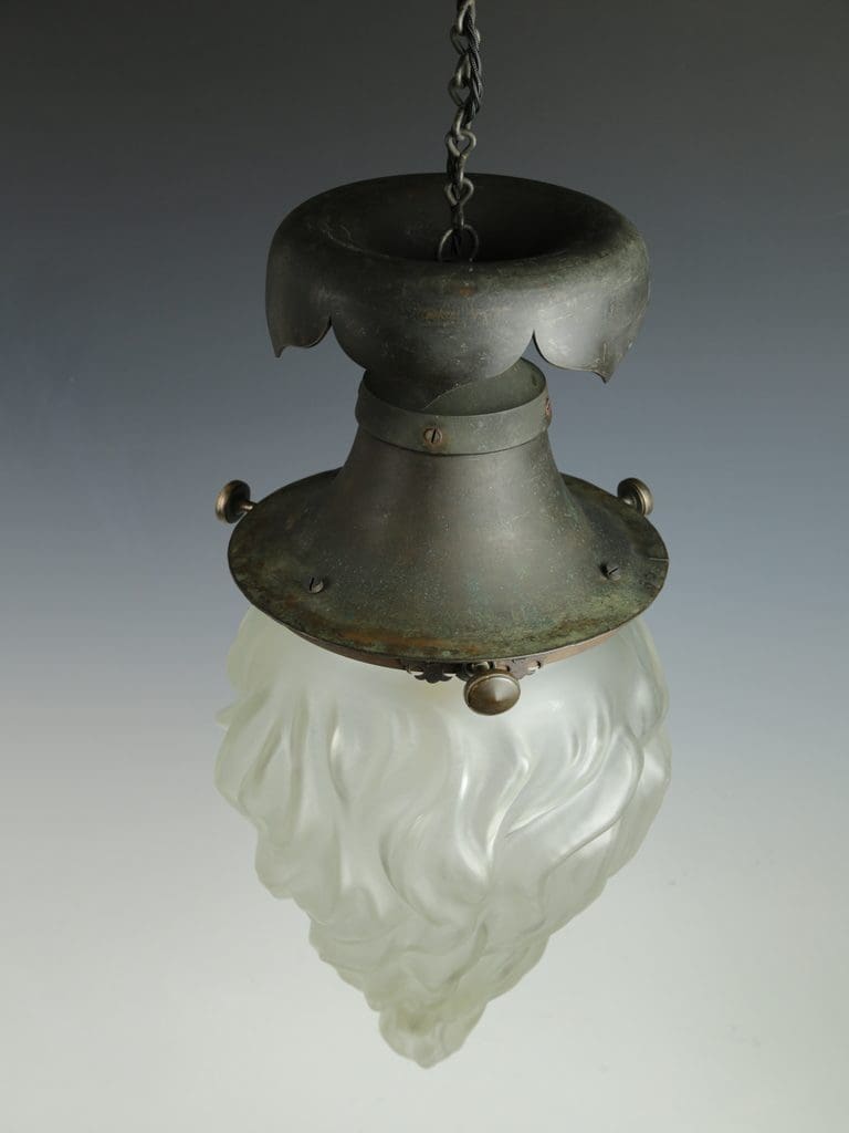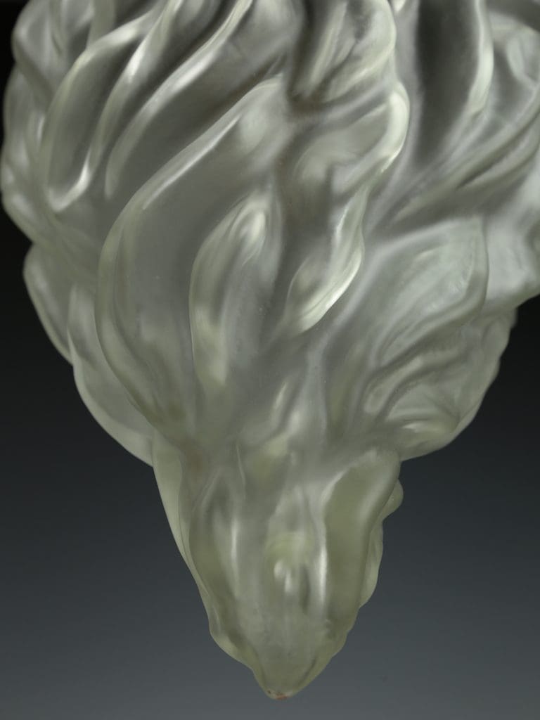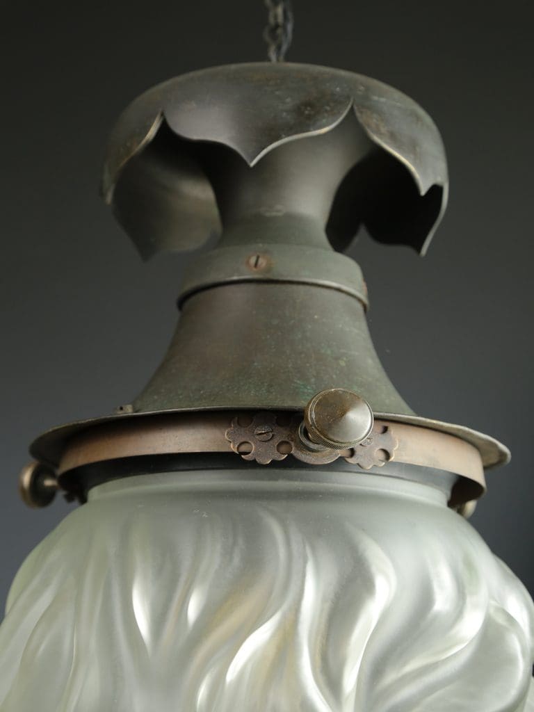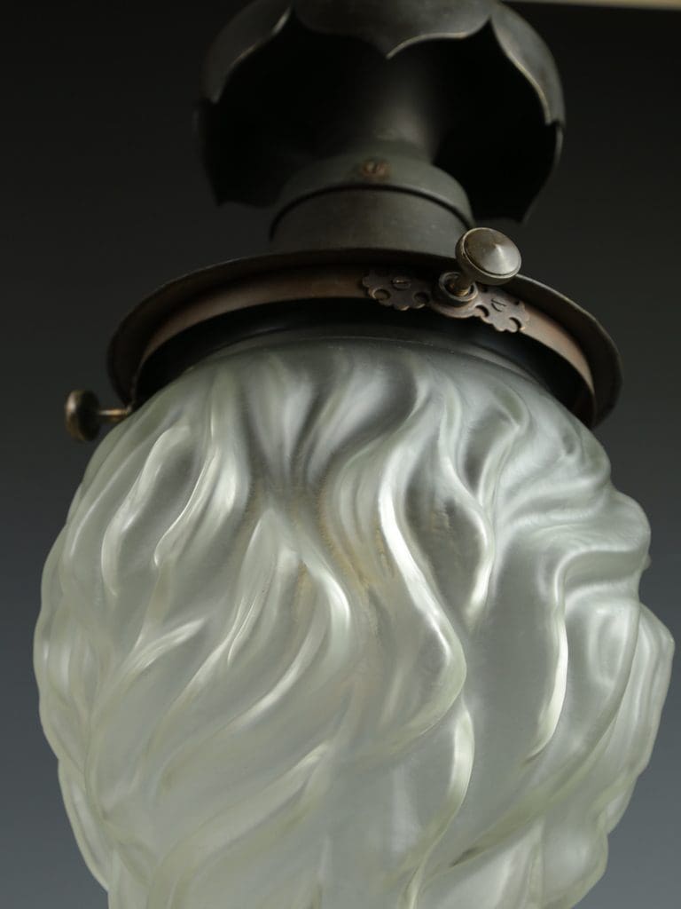 This remarkable and rare flame globe pendant boasts an impressive size and is supported by an exquisite bronze gallery. Its unique and unusual design makes it a captivating focal point in any setting.