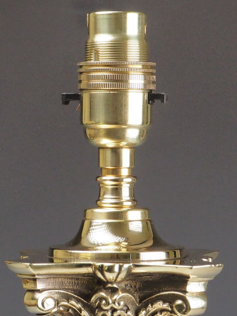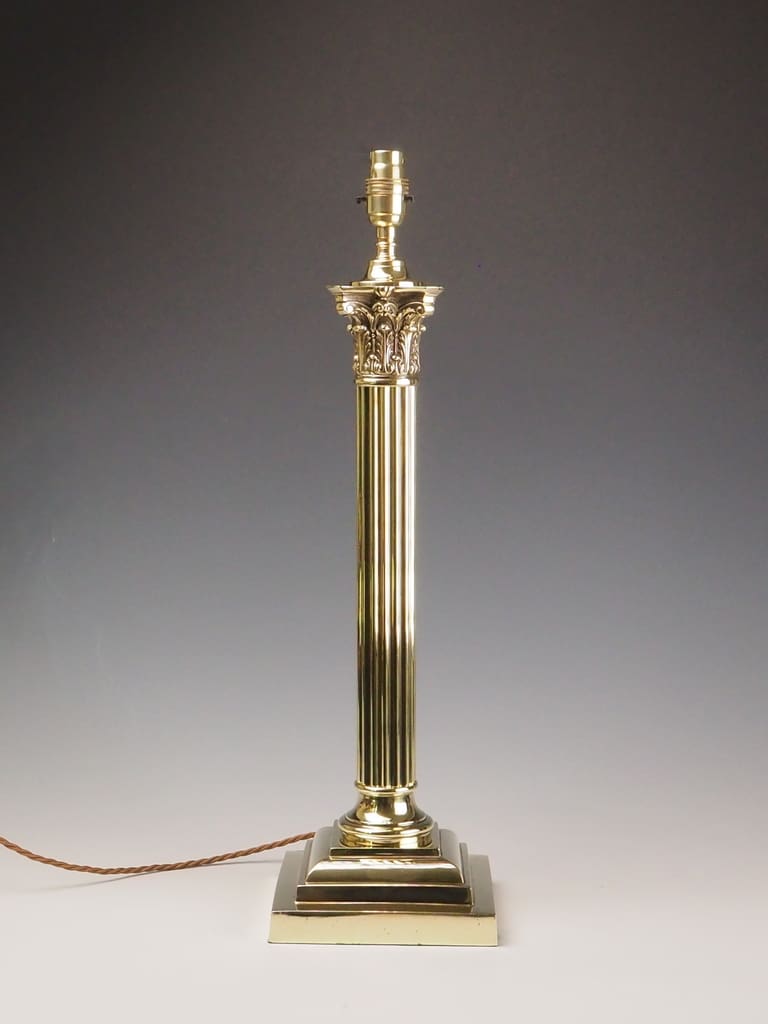 Exquisite Neoclassical brass Corinthian columnar table lamp stands as a stunning example of late 19th-century opulence and refined artistry. Originally crafted to house an oil lamp, it has been expertly adapted to modern living with an electric conversion, seamlessly blending antique elegance with contemporary convenience.