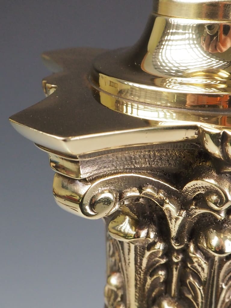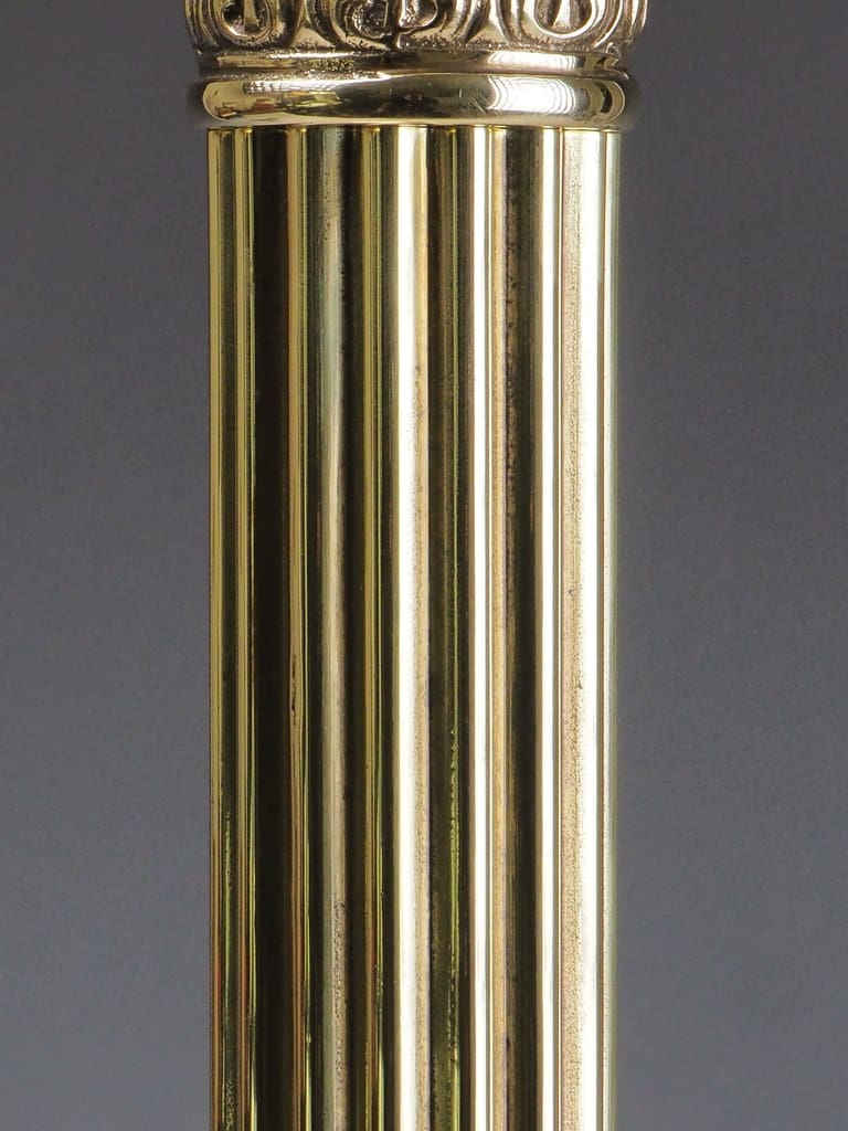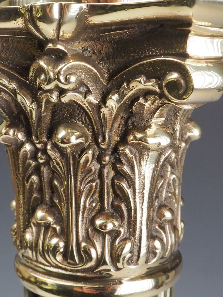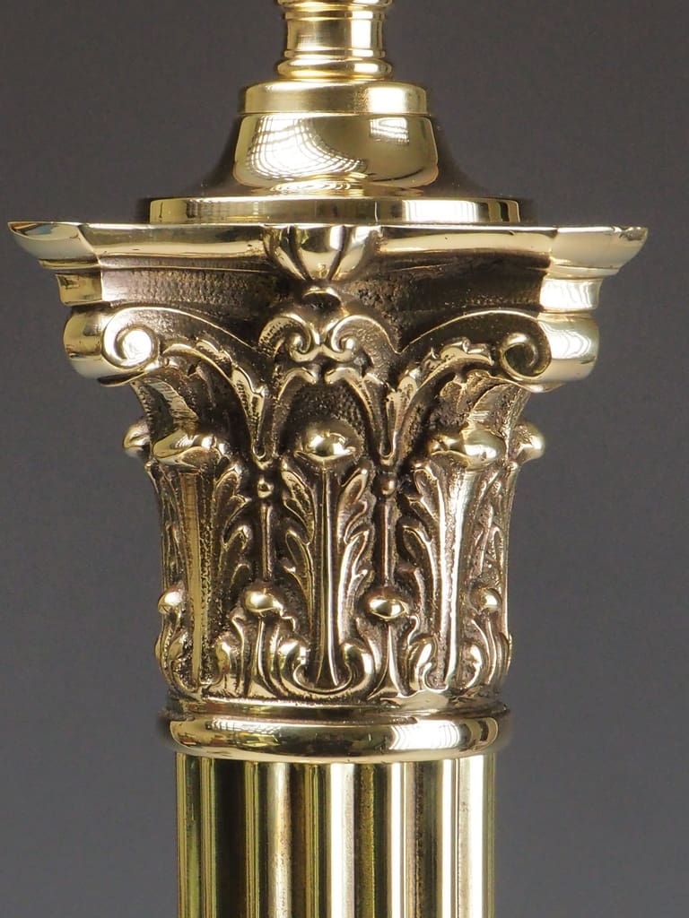The centerpiece of this remarkable lamp is its Corinthian capital, adorned with intricate acanthus leaf motifs—an iconic symbol of classical architecture originating from ancient Greece and Rome. The Corinthian order, celebrated as the most ornate of the three classical orders, became synonymous with luxury and sophistication. This timeless design, embraced during the Victorian era, symbolized a revival of classical influences in home decor and decorative arts.