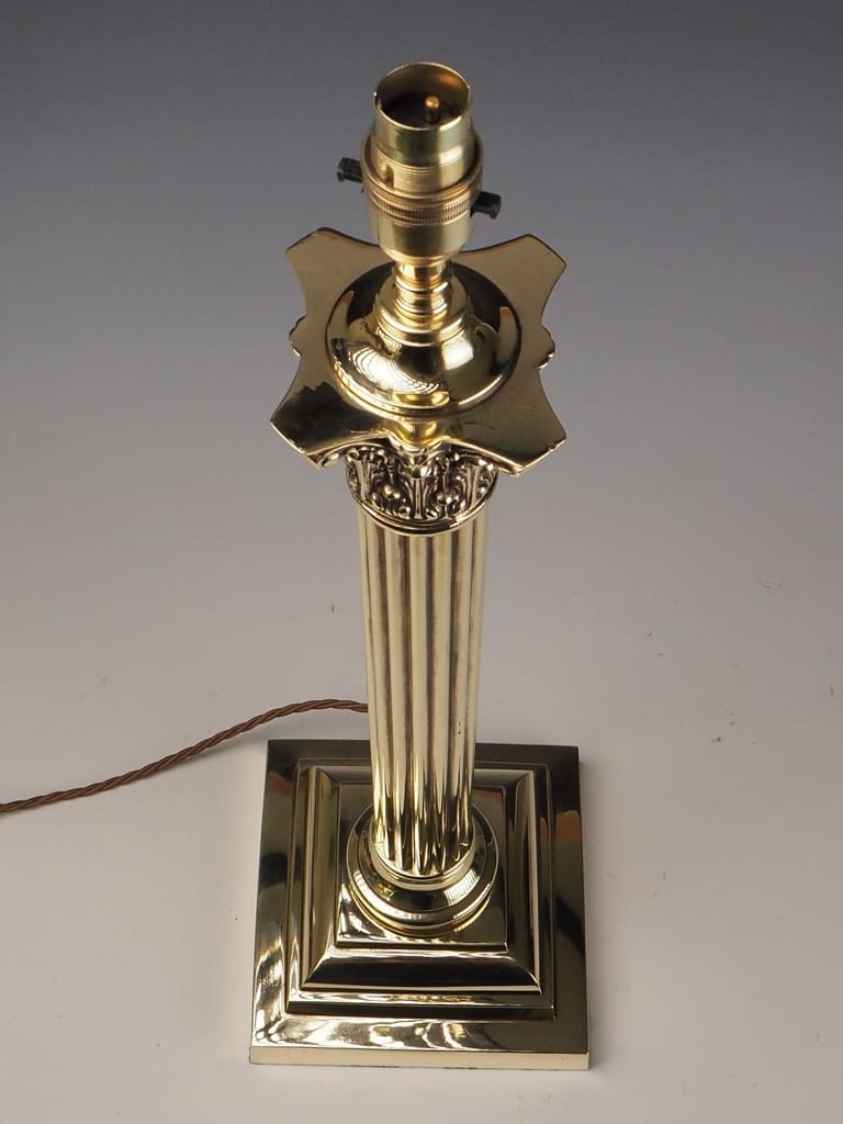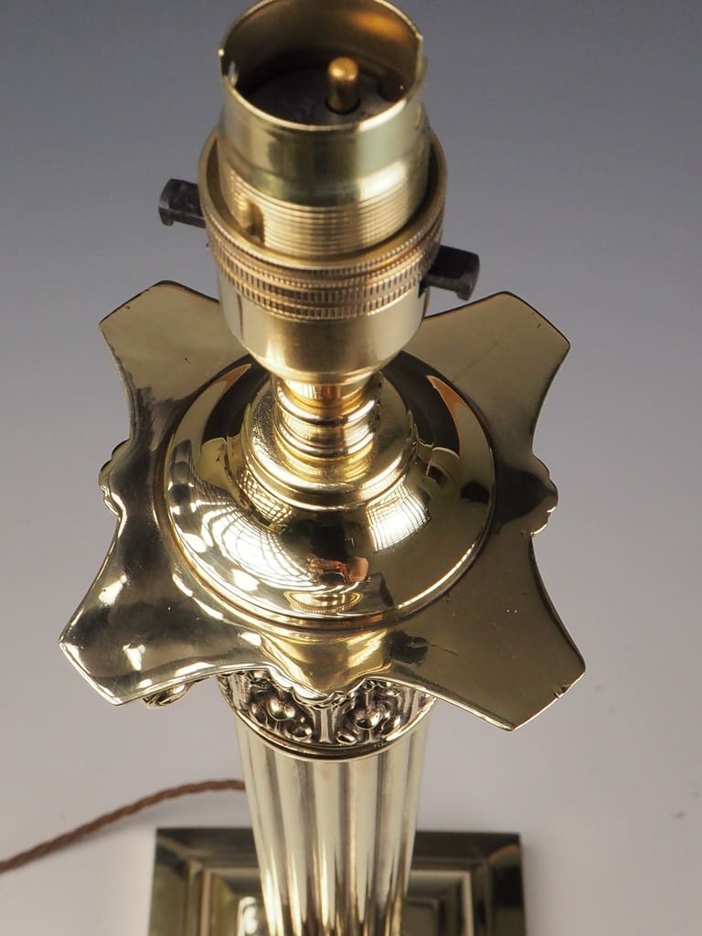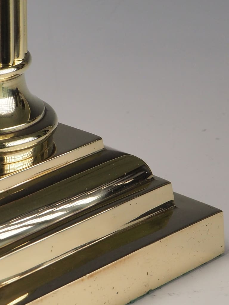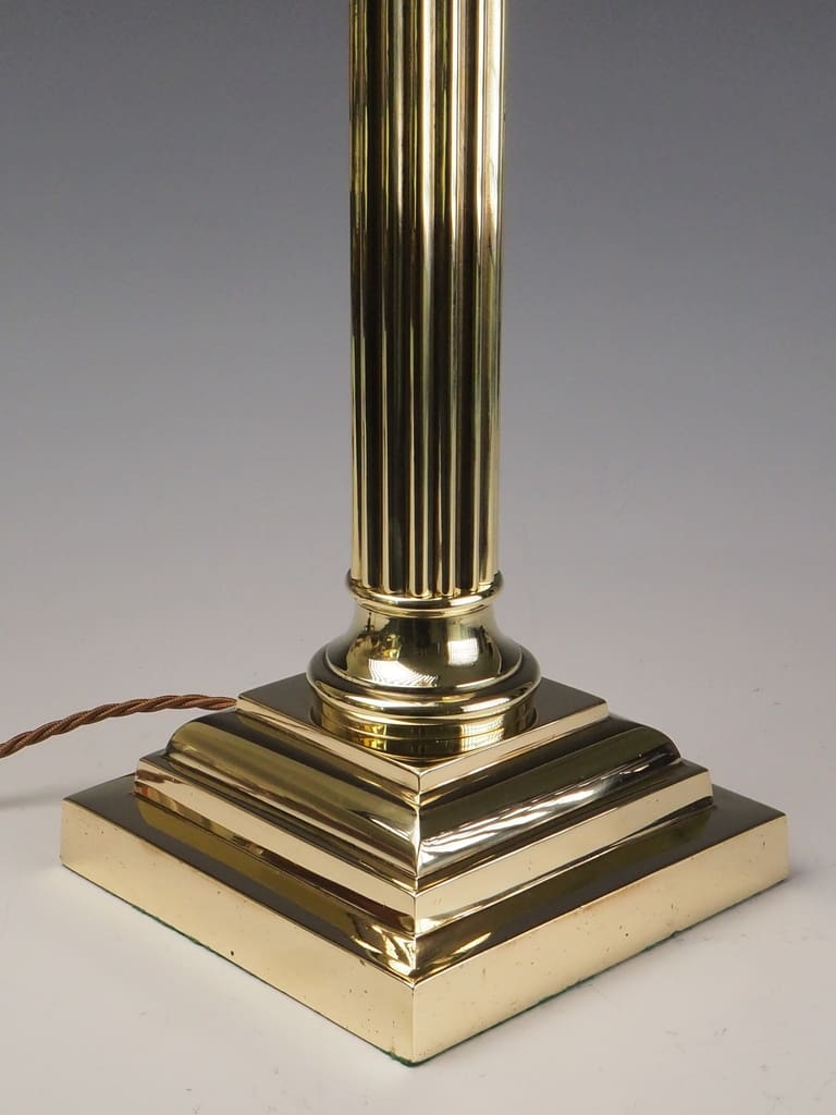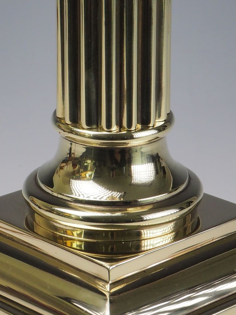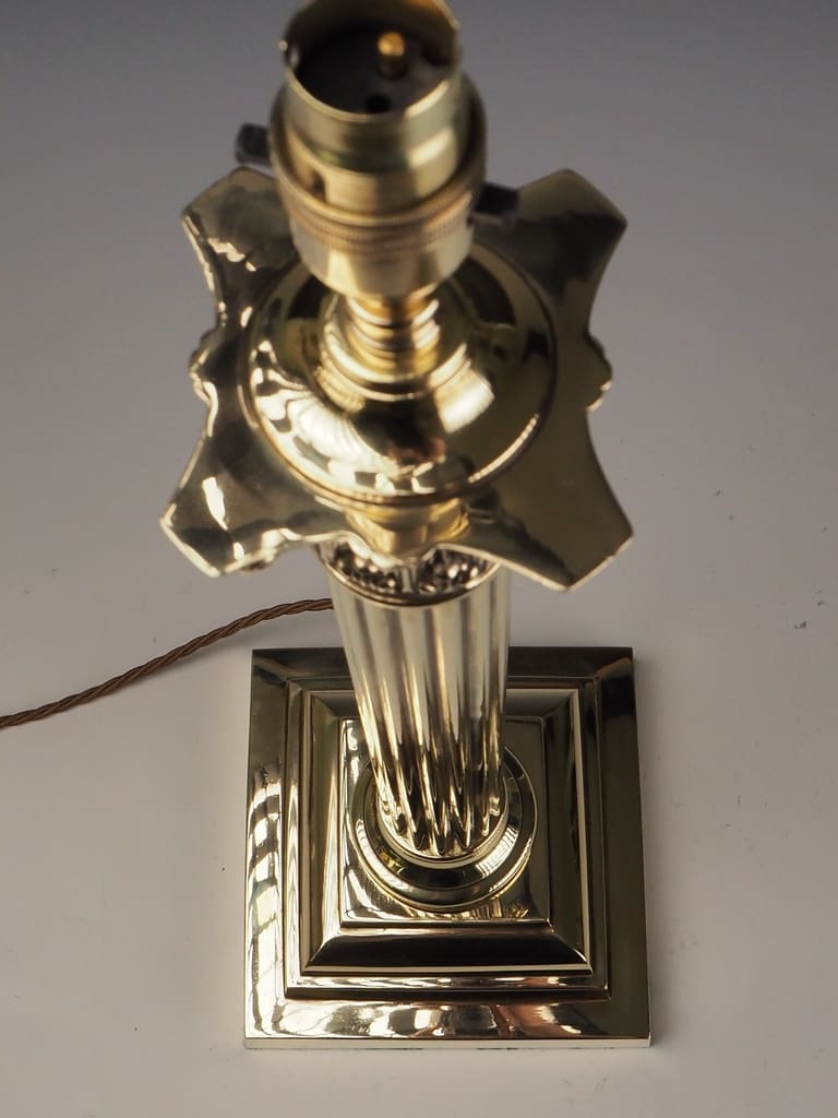 This Antique Neoclassical brass Corinthian columnar table lamp is in excellent overall condition, considering its age and historical significance. The brass body displays a rich patina, characteristic of its Victorian era craftsmanship, with minor wear and tarnish that enhance its antique charm. The intricate Corinthian capital remains intact, showcasing the stunning acanthus leaf detailing without signs of damage. The stepped square base is heavy and stable, showing no structural concerns.
