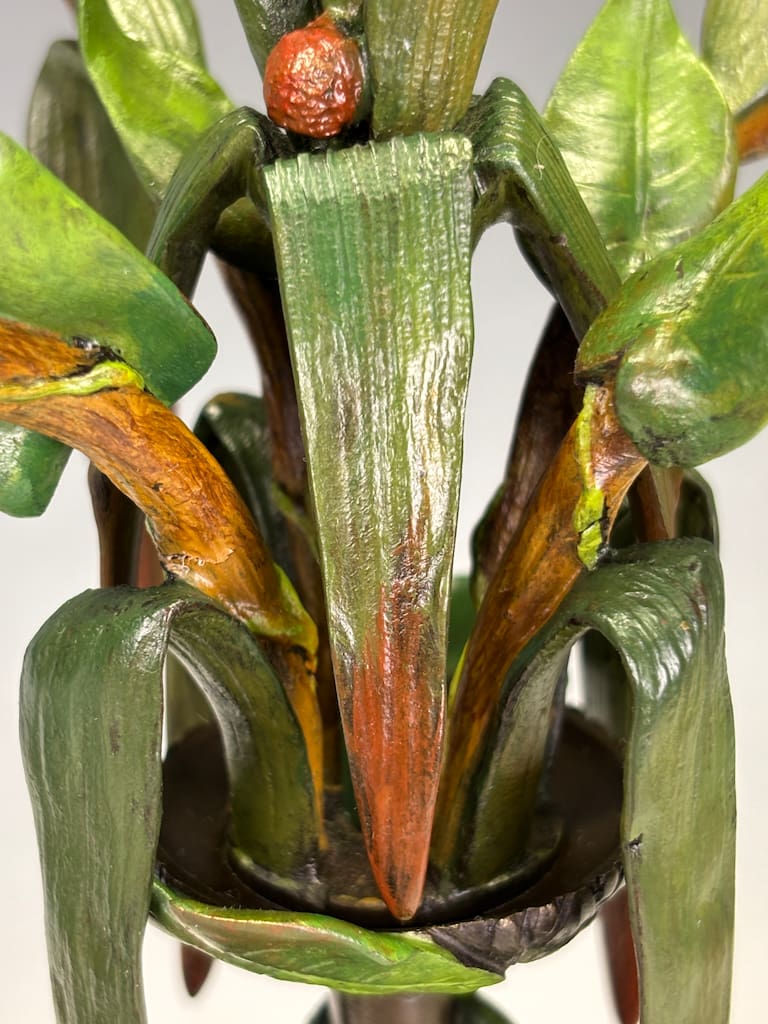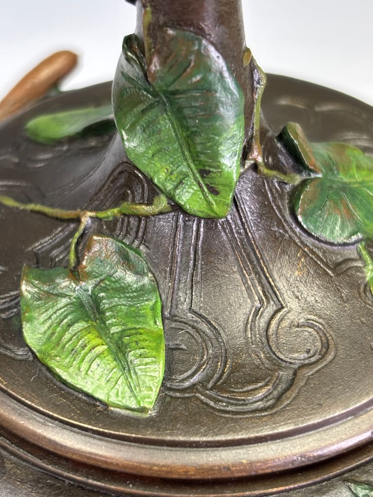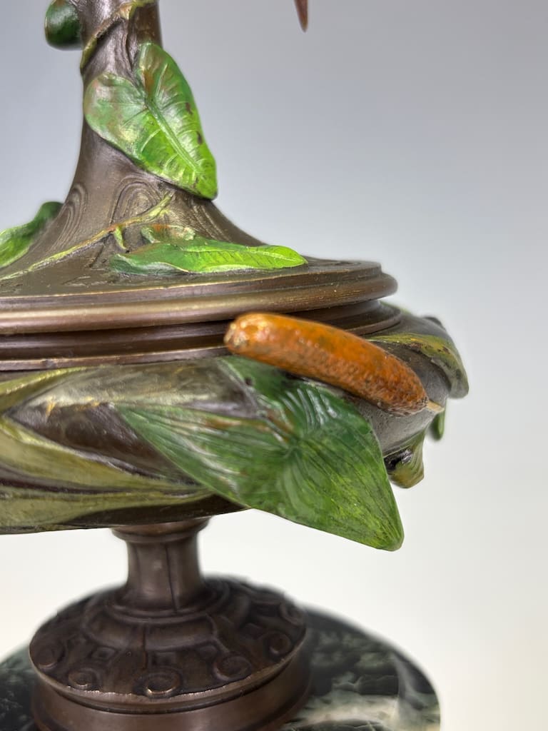 The cold-painted surface retains a rich, even patina with minimal rubbing. The painted finish remains stable, with only the slightest surface wear visible under close inspection.