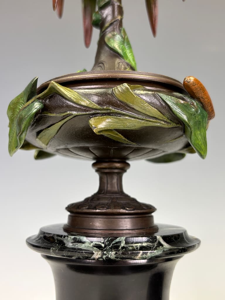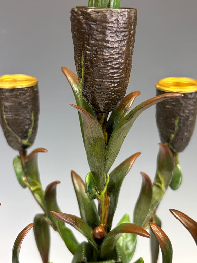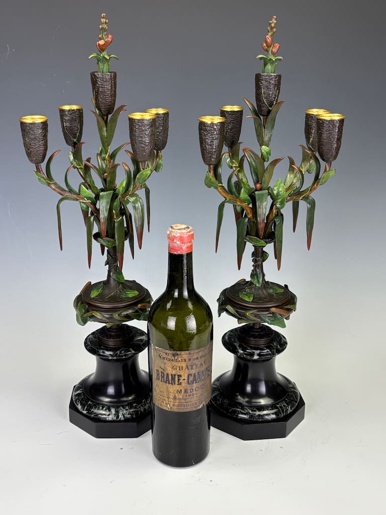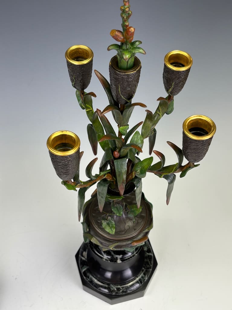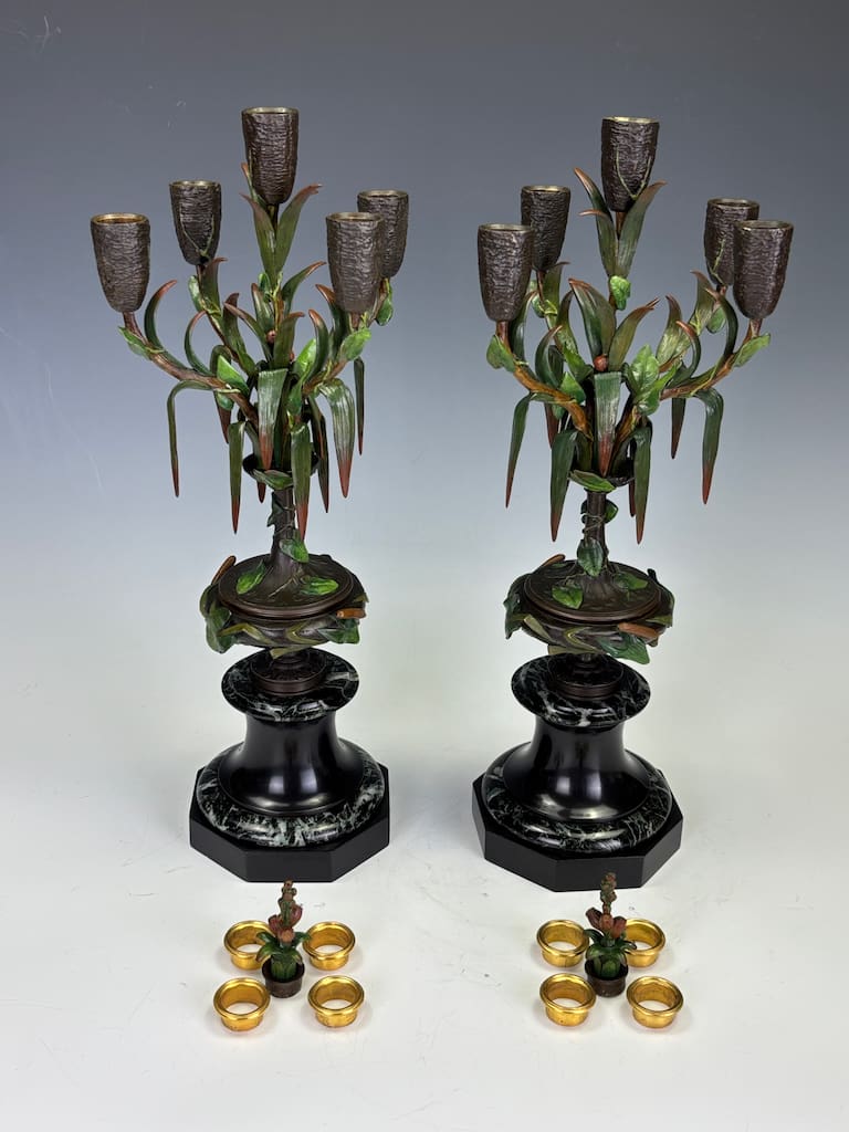 These candelabra exemplify the sophistication of his decorative output. Cast in bronze and finely cold-painted—a laborious technique that imparts subtle polychrome tonality to the surface—they achieve a richness of effect unattainable in plain patination. The design takes inspiration from nature: botanical stems rise elegantly from classical plinths, sprouting finely chased leaves and buds that support six candle arms apiece. Each nozzle is highlighted with gilt-rimmed detail, catching the light in striking contrast to the deeper patinated bronze.