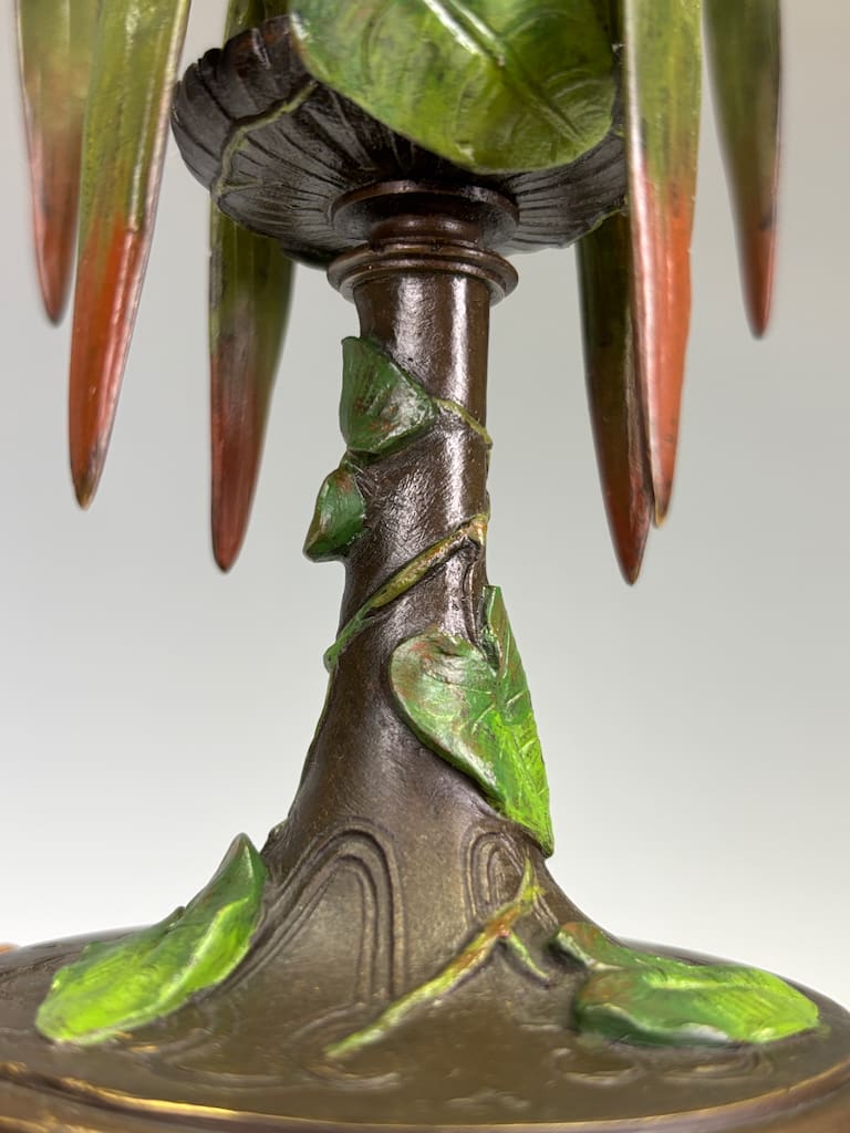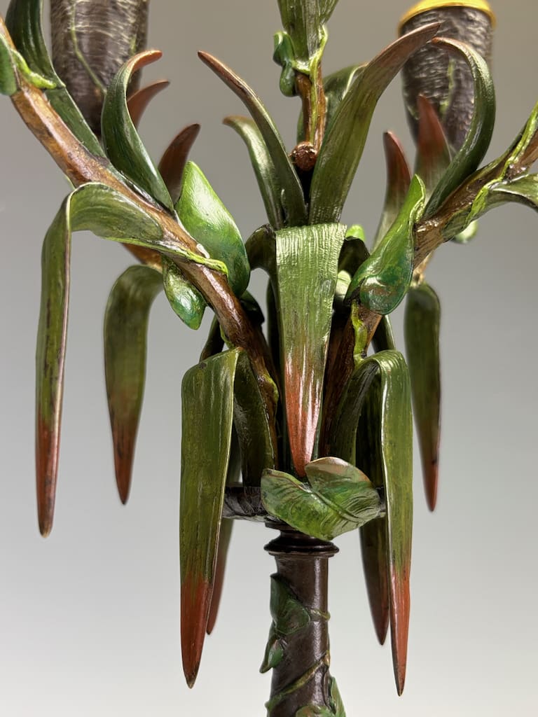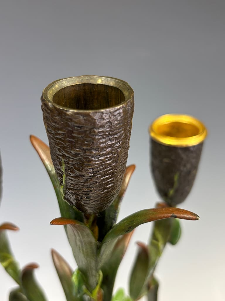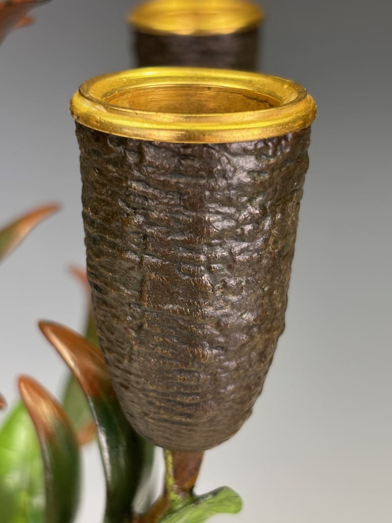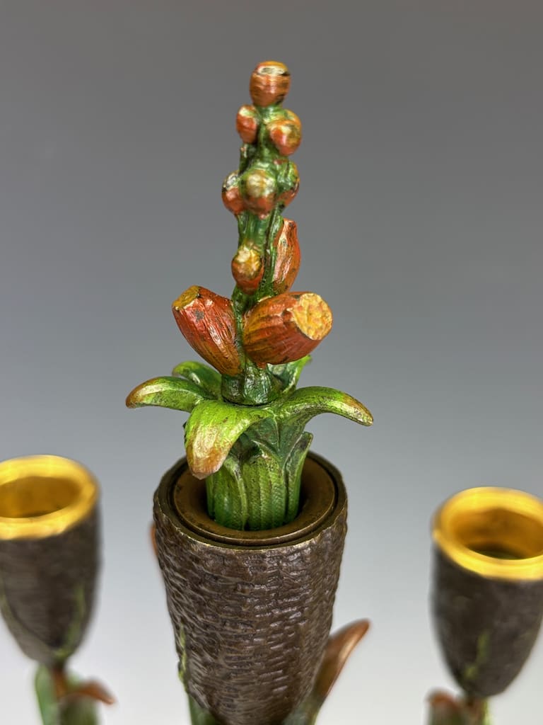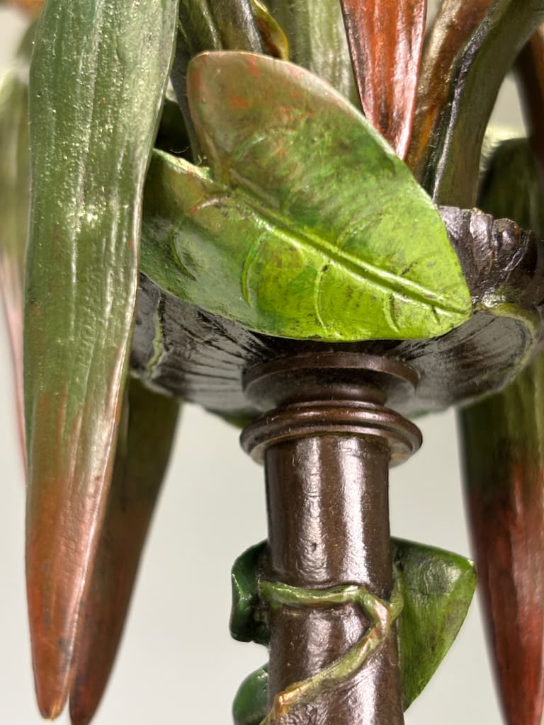 These candelabra exemplify the sophistication of his decorative output. Cast in bronze and finely cold-painted—a laborious technique that imparts subtle polychrome tonality to the surface—they achieve a richness of effect unattainable in plain patination. The design takes inspiration from nature: botanical stems rise elegantly from classical plinths, sprouting finely chased leaves and buds that support six candle arms apiece. Each nozzle is highlighted with gilt-rimmed detail, catching the light in striking contrast to the deeper patinated bronze.