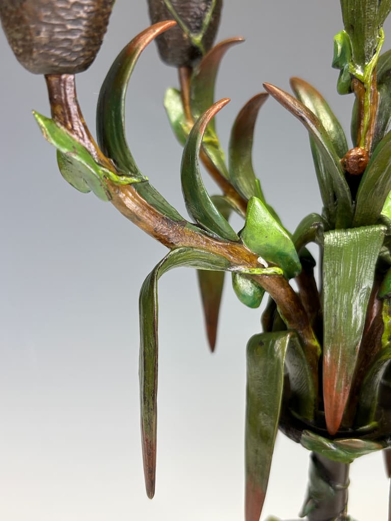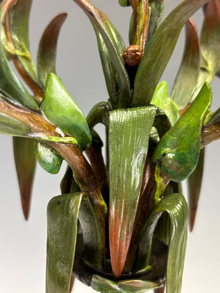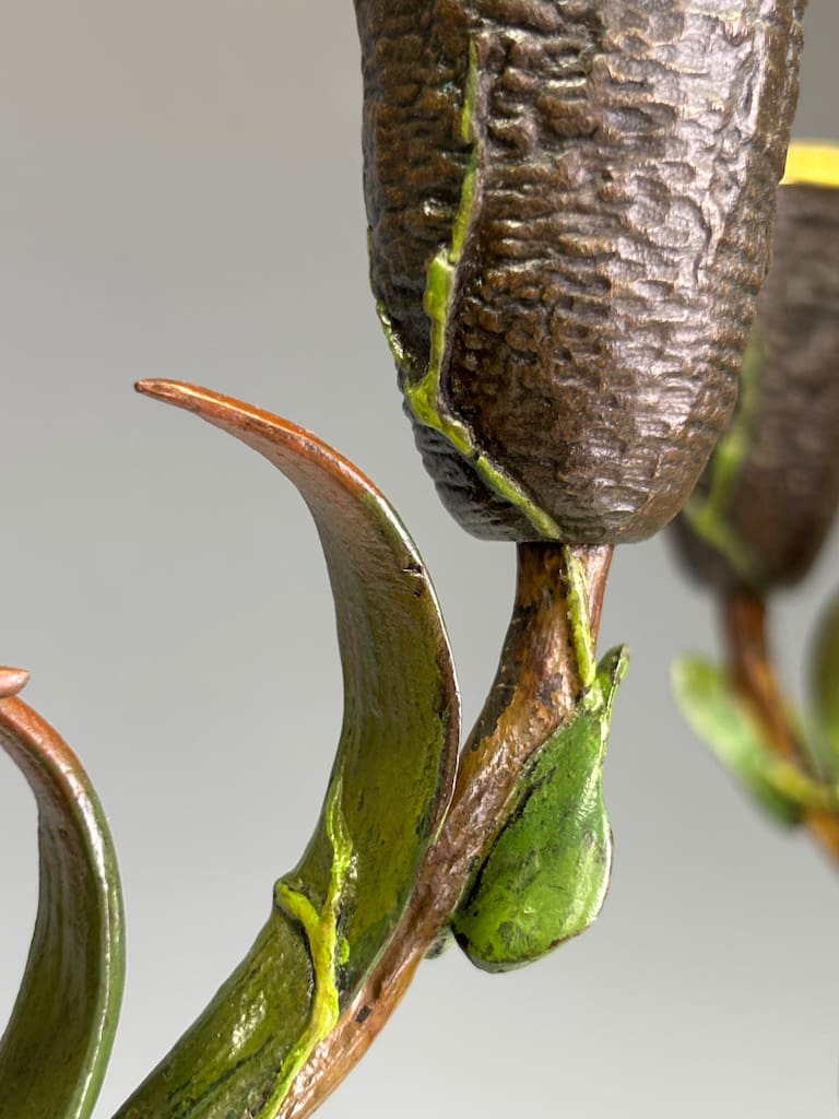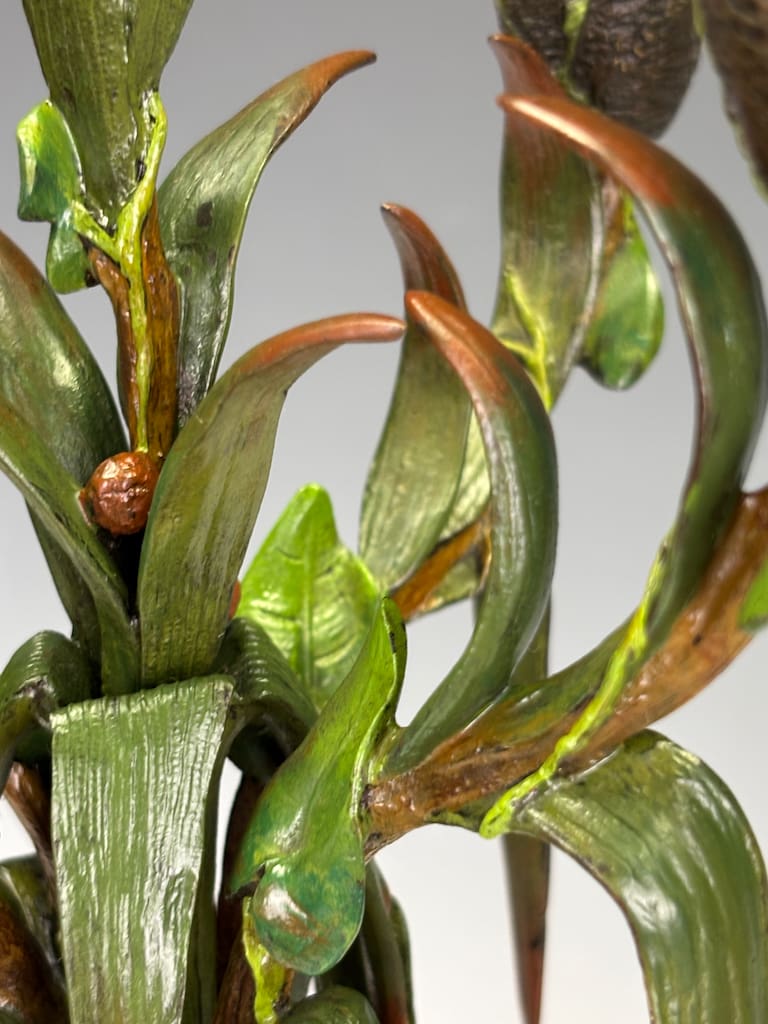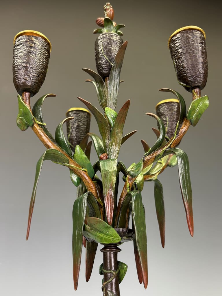 These candelabra exemplify the sophistication of his decorative output. Cast in bronze and finely cold-painted—a laborious technique that imparts subtle polychrome tonality to the surface—they achieve a richness of effect unattainable in plain patination. The design takes inspiration from nature: botanical stems rise elegantly from classical plinths, sprouting finely chased leaves and buds that support six candle arms apiece. Each nozzle is highlighted with gilt-rimmed detail, catching the light in striking contrast to the deeper patinated bronze.