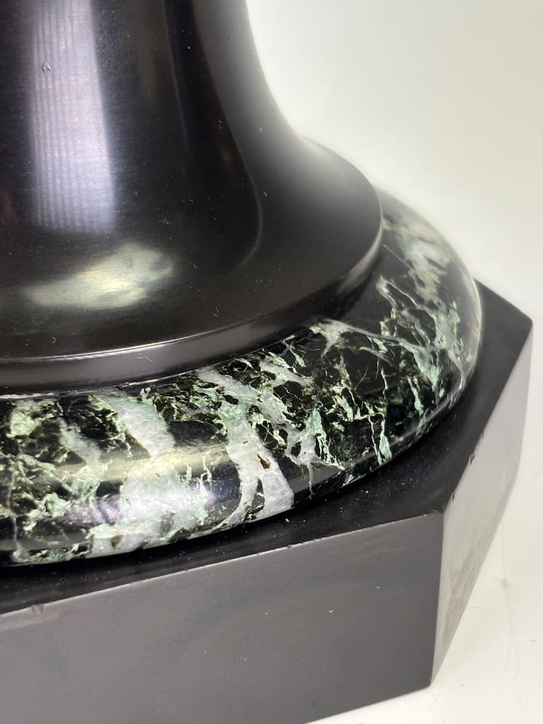 The black marble plinths are in excellent condition, with natural veining intact. No chips, cracks, or structural repairs are evident.