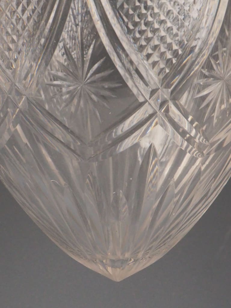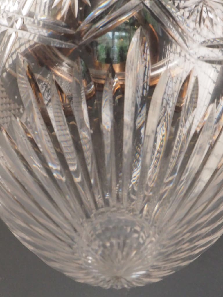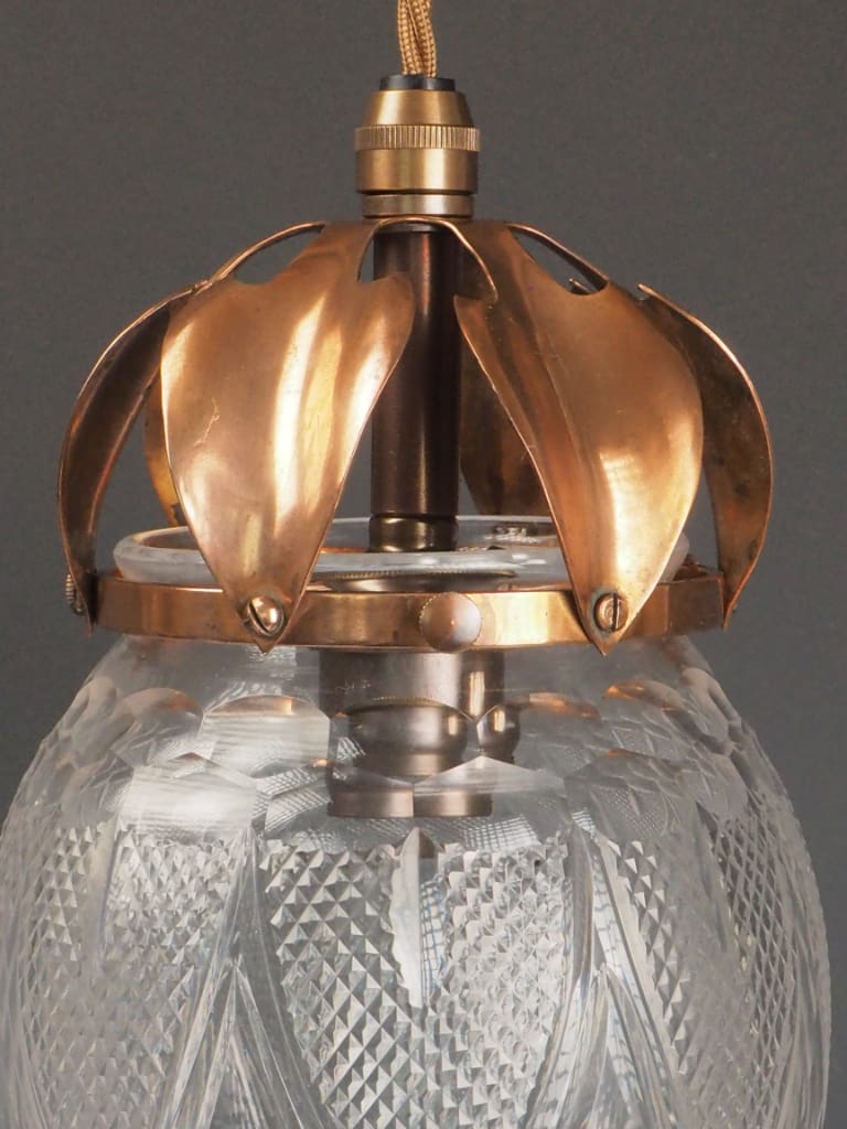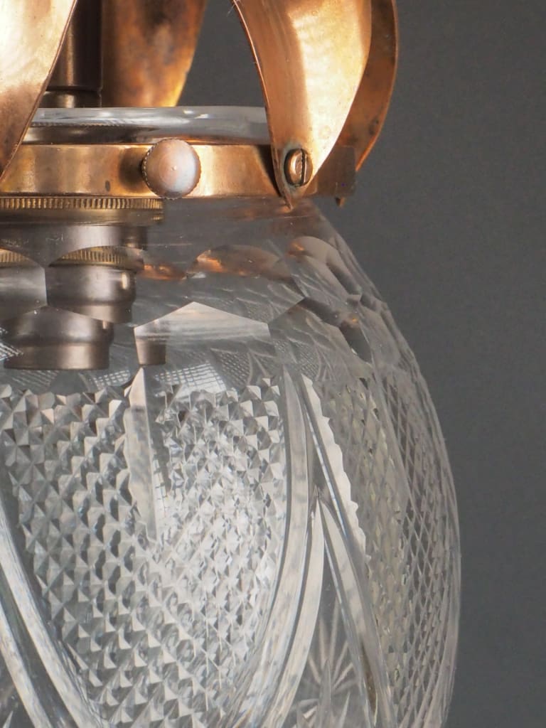 Excellent antique condition, with careful restoration and full functionality. Fully rewired and professionally tested to UK electrical standards using high-quality British-made components. The cut glass crystal globe is original and in excellent condition with no cracks, chips, or clouding. It displays light beautifully with intricate refraction. Original copper gallery with delicate openwork leaf detailing. Some light surface patina consistent with age, adding to its character. All structural fittings are secure. Suitable for interior installation.