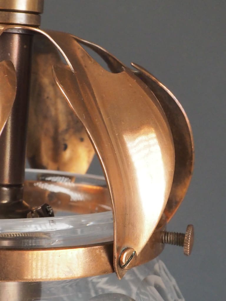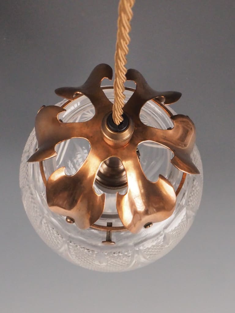 This refined antique pendant light showcases an original copper gallery adorned with intricate openwork leaf motifs, combining visual elegance with practical illumination. The cut glass crystal globe is finely detailed, expertly dispersing light to create a tapestry of soft shadows and radiant reflections that elevate the ambiance of any room.