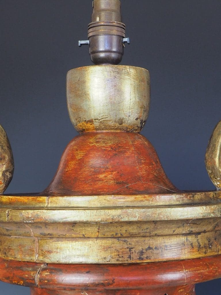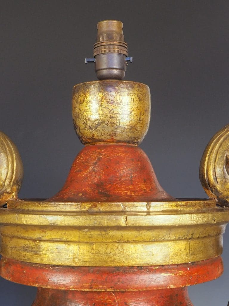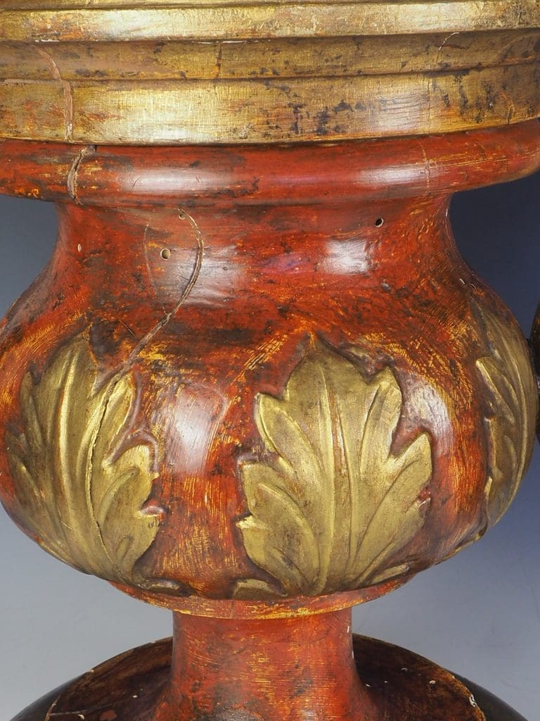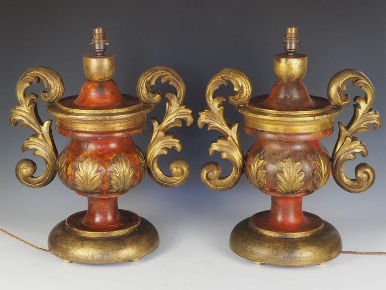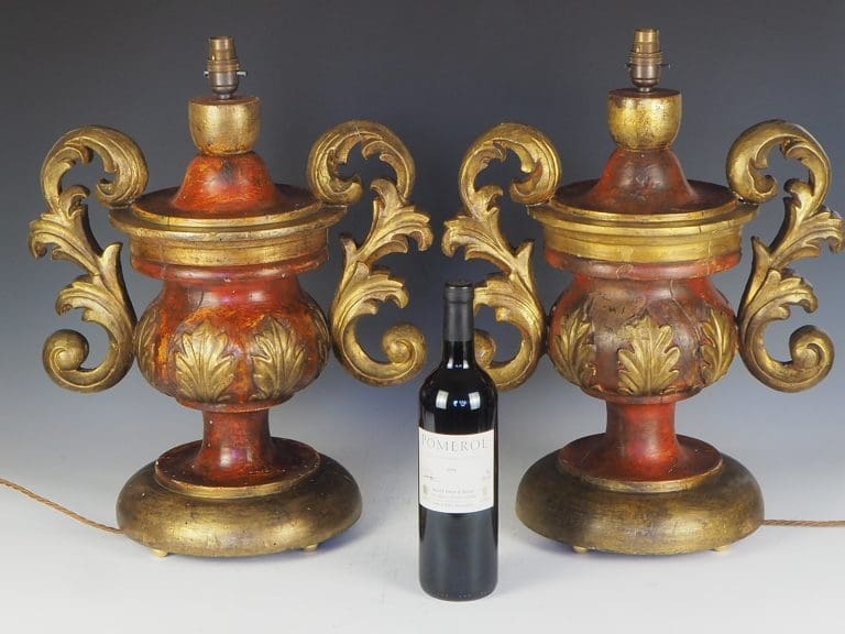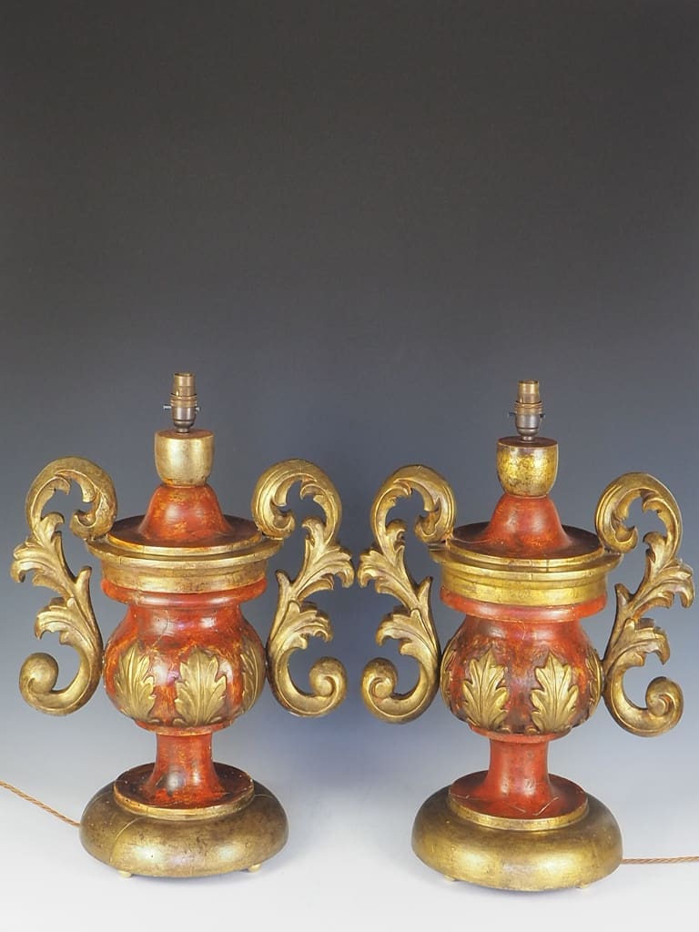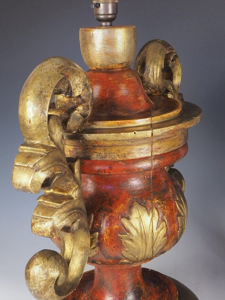 Exquisite Antique Rococo Polychrome and Giltwood Table Lamps (Pair) are a true testament to the craftsmanship of the era. Standing tall and commanding attention, these Rococo urns boast an impressive size and presence. The rich, patinated finish, meticulously hand painted over gesso, adds a touch of elegance to the lamps. Adorned with a delicate gilt leaf motif, these lamps exude opulence and sophistication. The hand carved relief decoration, featuring intricate details, is skillfully attached to acanthus leaf handles, further enhancing the lamps' beauty.Â