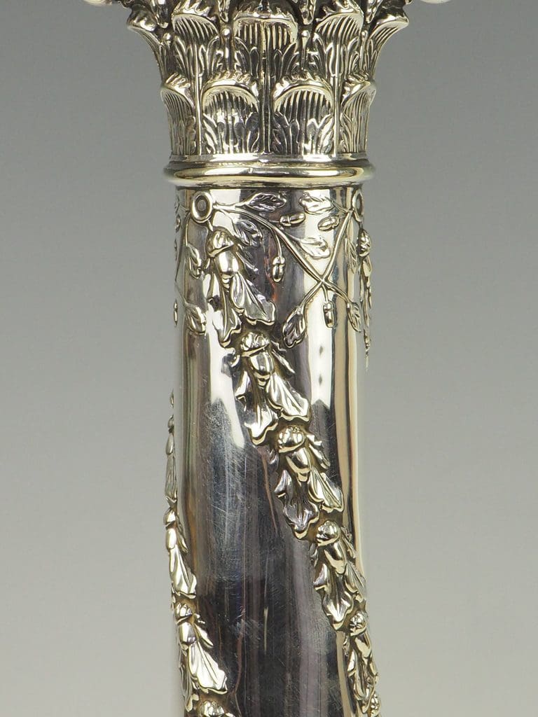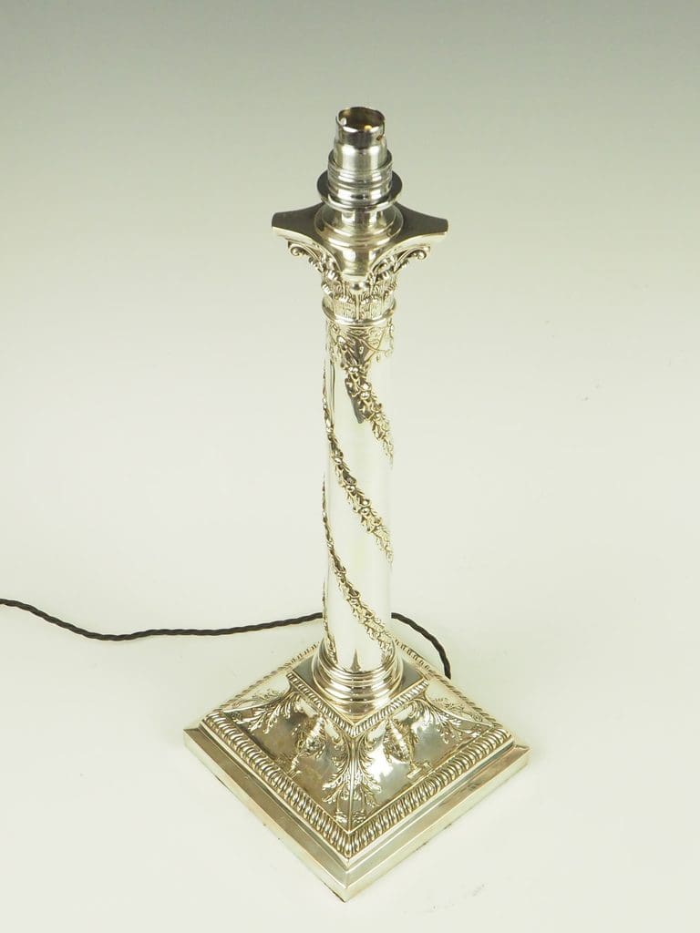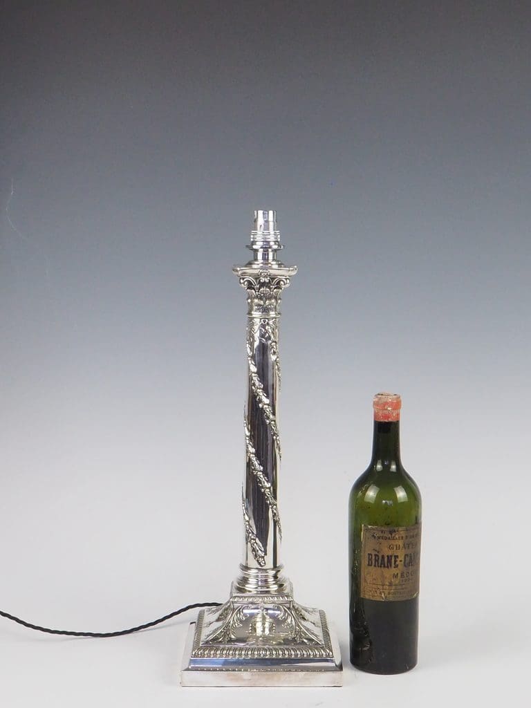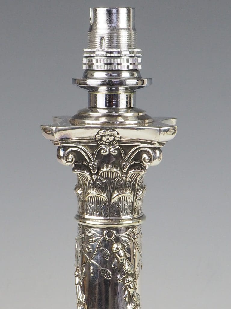Immerse yourself in the timeless allure of this exceptional Antique Silver Plate Corinthian Column Table Lamp, a piece that beautifully marries classical design with rich historical significance. This large, weighted table lamp is a captivating example of craftsmanship, adorned with a graceful twisted vine that ascends the fluted column, culminating in a richly detailed capital inspired by the grandeur of classical Corinthian architecture. Its base, with classical urn motifs and draped swags, further exudes refined opulence.