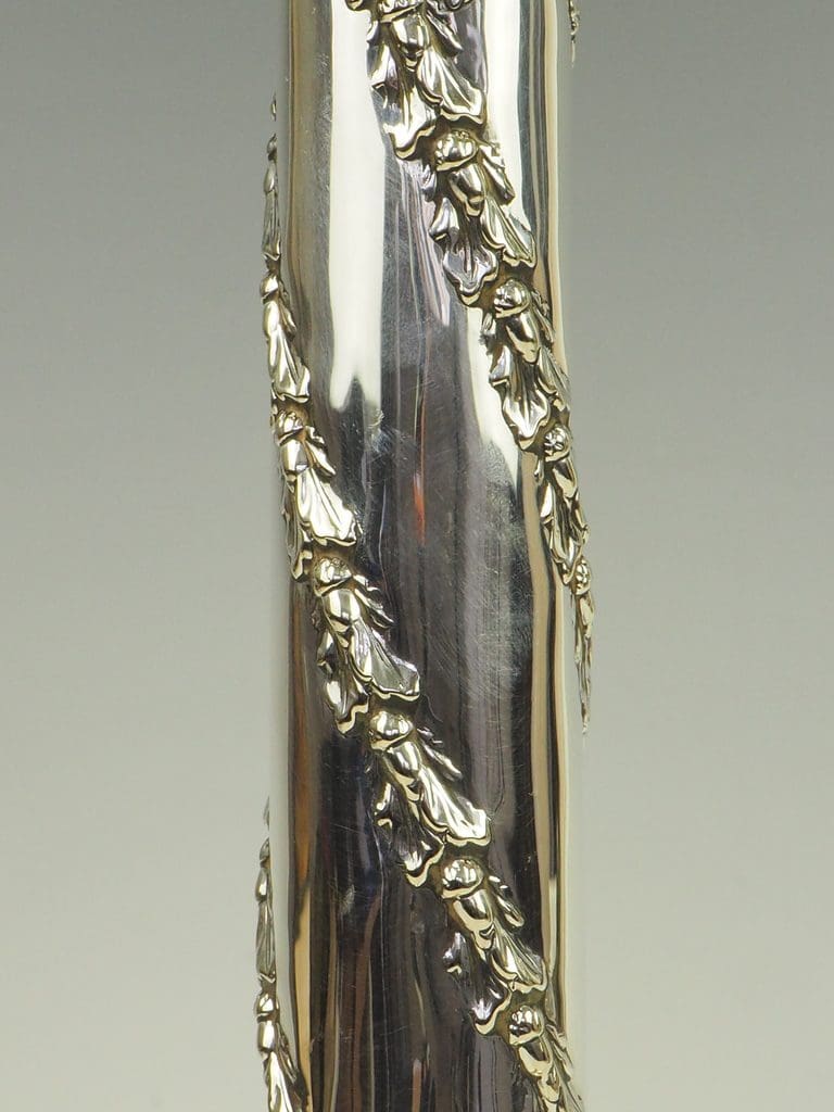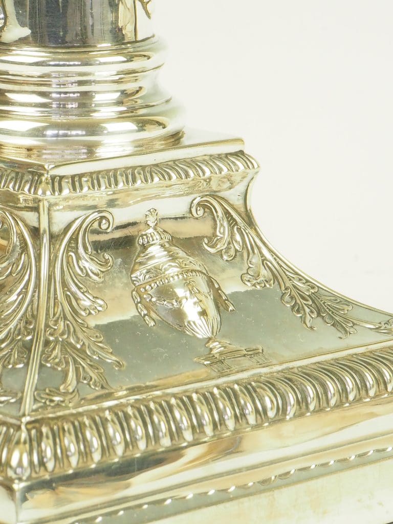 Silver plating, a popular technique in the 19th and early 20th centuries, allowed for the creation of visually striking pieces that were more accessible than solid silver items. The twisted vine and urn motifs on this lamp reflect the Victorian fascination with nature and classical revivalism, showcasing an era where artistry and craftsmanship flourished.