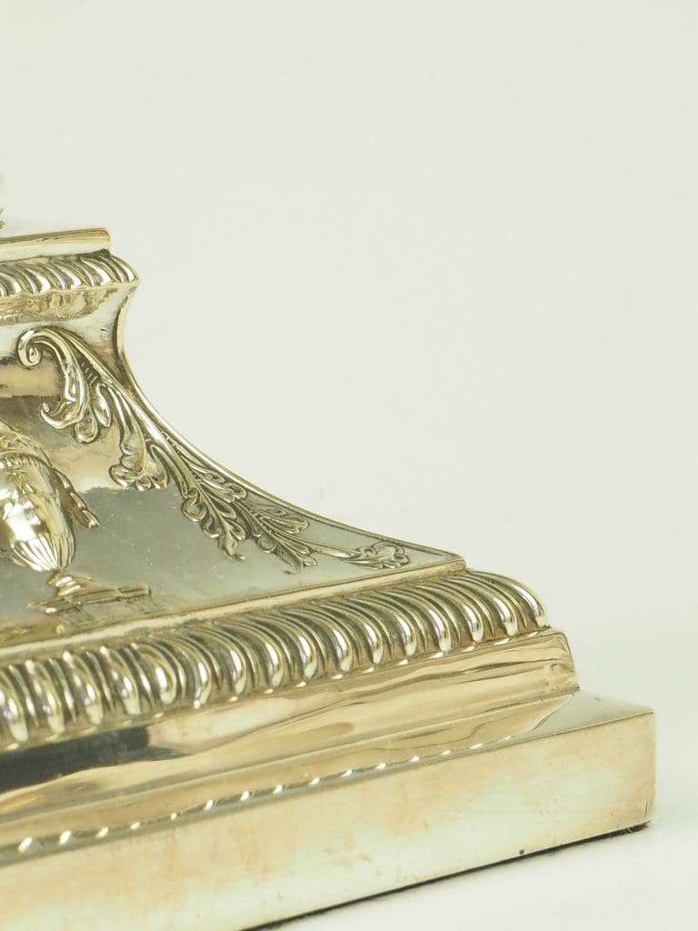 The silver plating is in good condition with minor tarnishing and some small areas of wear, particularly around the base edges, typical for a piece of this age.
