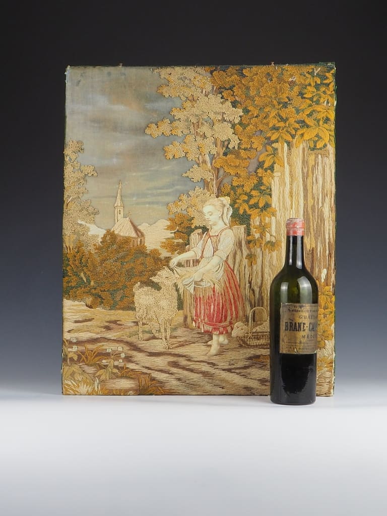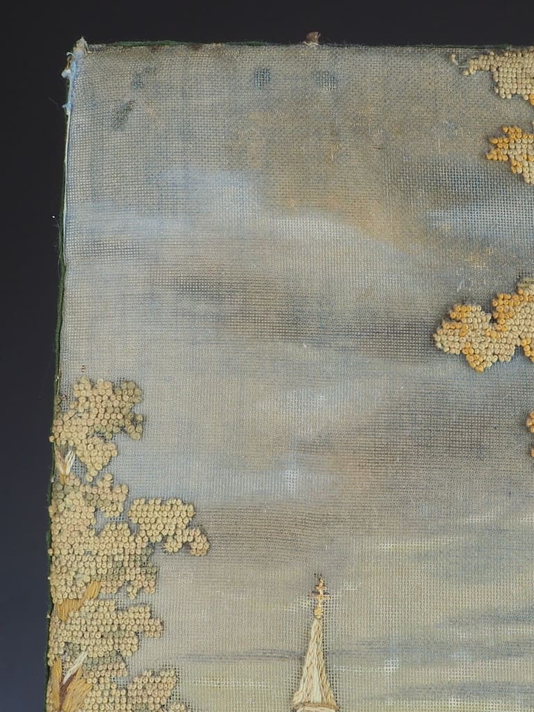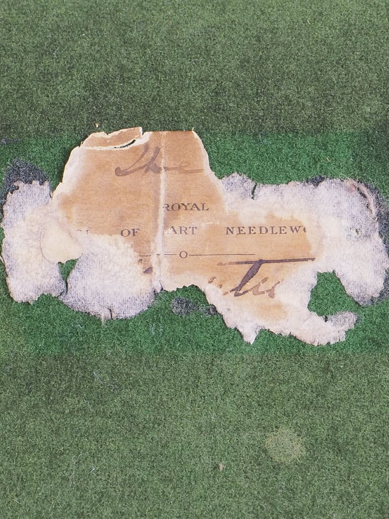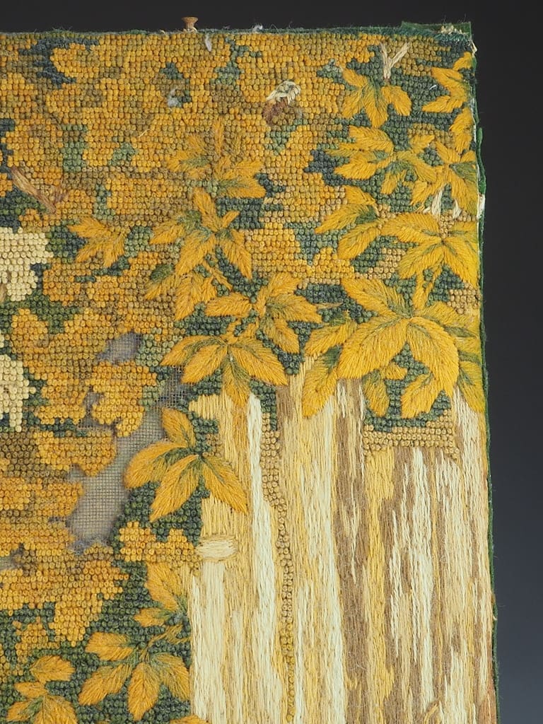 This is a very early tapestry with the 'Royal College of Needle Art' label on the reverse. We have made contact with them and it's an early label from when they opened in 1876 and was issuing needlepoint works and providing a cleaning service for other tapestry works.