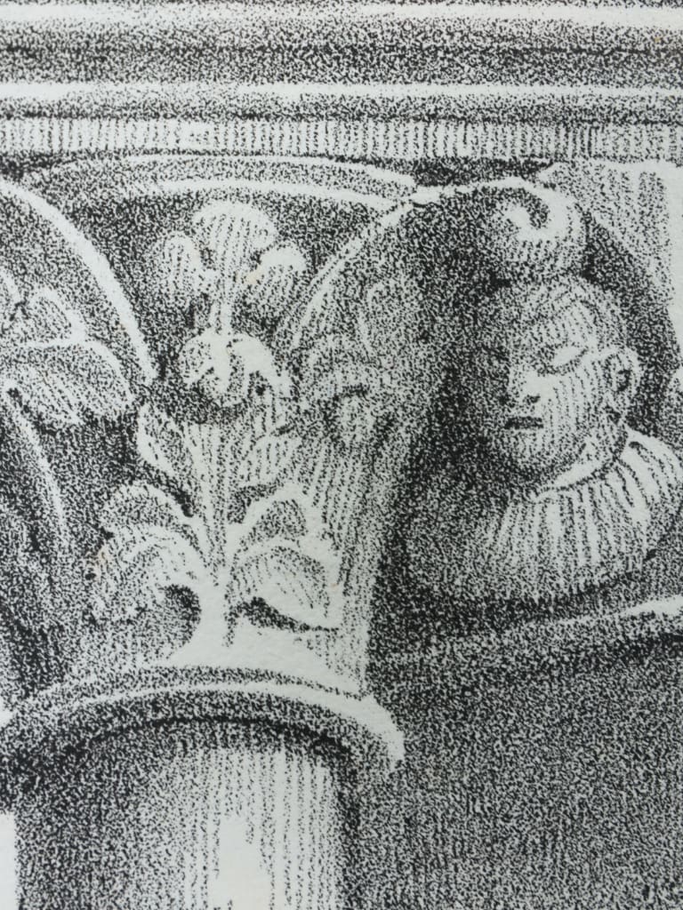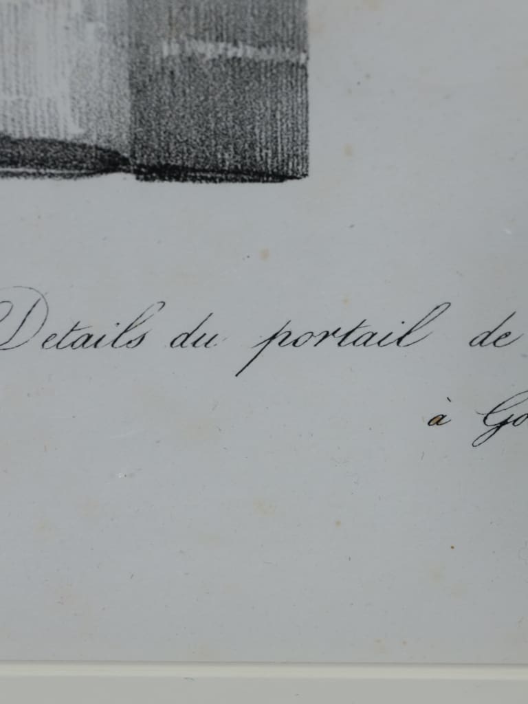 The work is dated in the plate Fragonard 1822. It masterfully captures the deep-set moldings and the weathered, tactile quality of the medieval stonework. Fragonard’s expertise is particularly evident in the subtle graduated shading, which conveys a sense of immense scale and the hushed, hallowed atmosphere of the Romanesque interior.