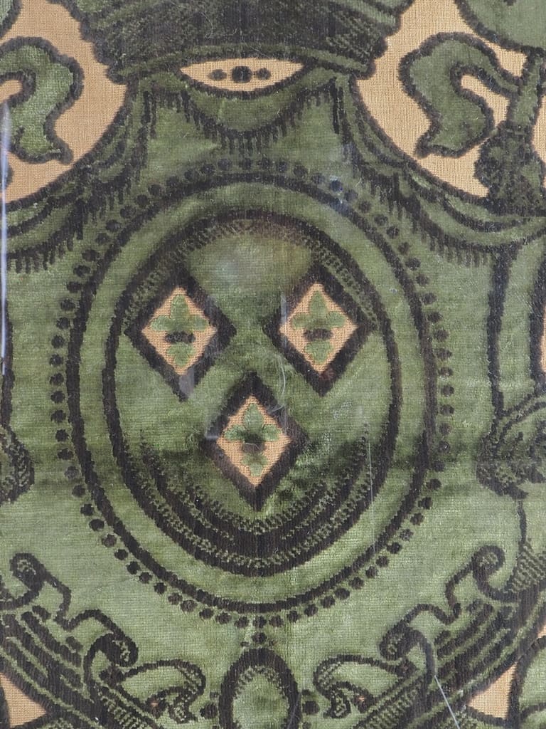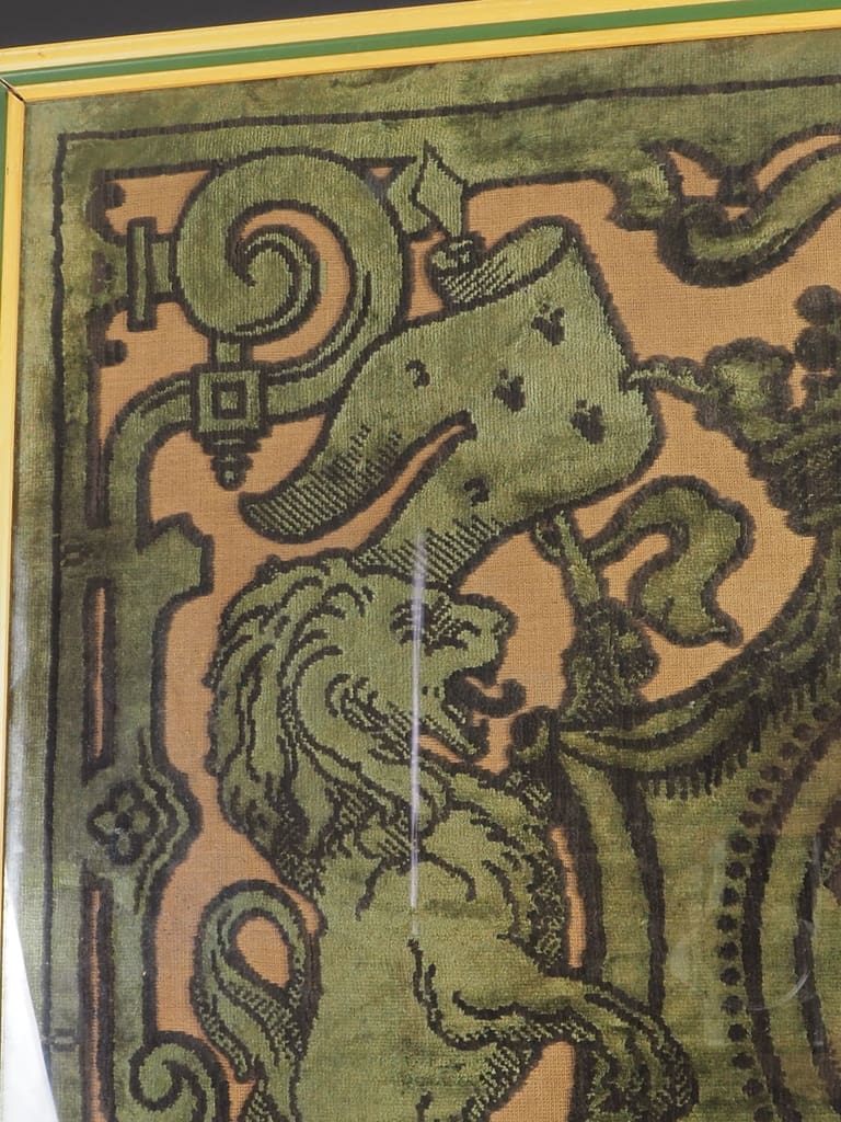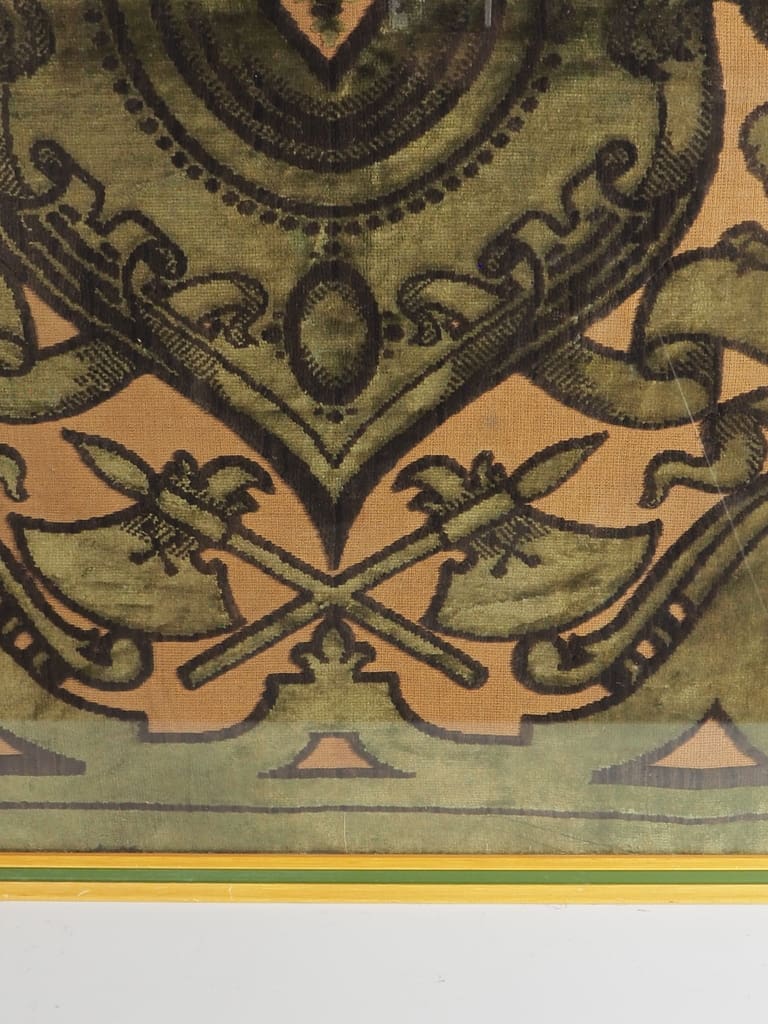 Velvet has long been cherished for its luxurious texture and rich hues, making it a preferred fabric for ceremonial and decorative purposes. During the 19th century, velvet tapestries were often used to showcase heraldic emblems, signaling nobility, lineage, or allegiance. This exquisite tapestry fragment exemplifies the opulence and craftsmanship of the era, likely serving as a decorative or commemorative piece within a prestigious setting.