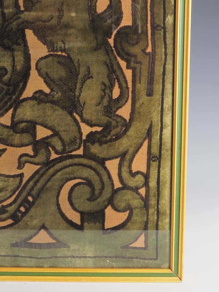 The tapestry has been carefully framed to preserve its intricate details. Despite gentle wear from age and past folding—visible in the subtle variations across the surface—it remains in remarkably good condition for its era. The vibrant shades of green on a natural background have been beautifully preserved, offering a vivid glimpse into the artistic prowess of its time.