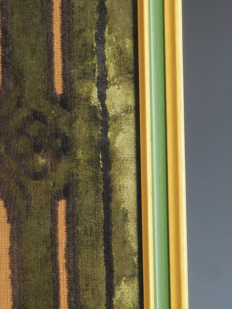 The tapestry has been professionally framed to protect its delicate velvet and maintain its structural integrity. The frame appears sturdy and suitable for continued preservation.