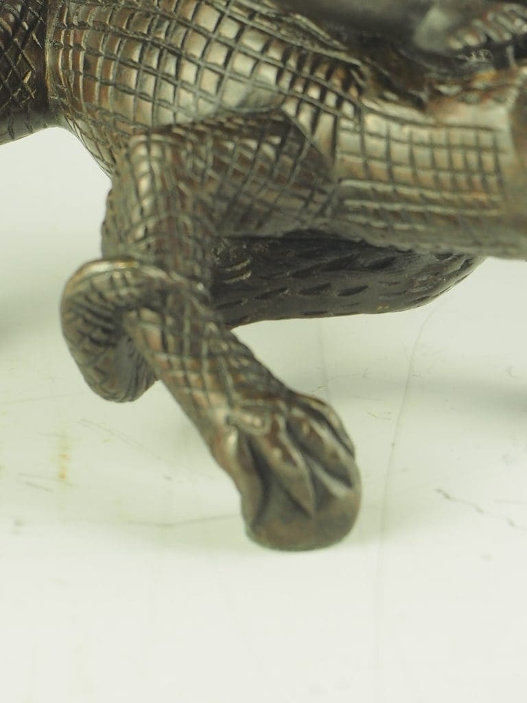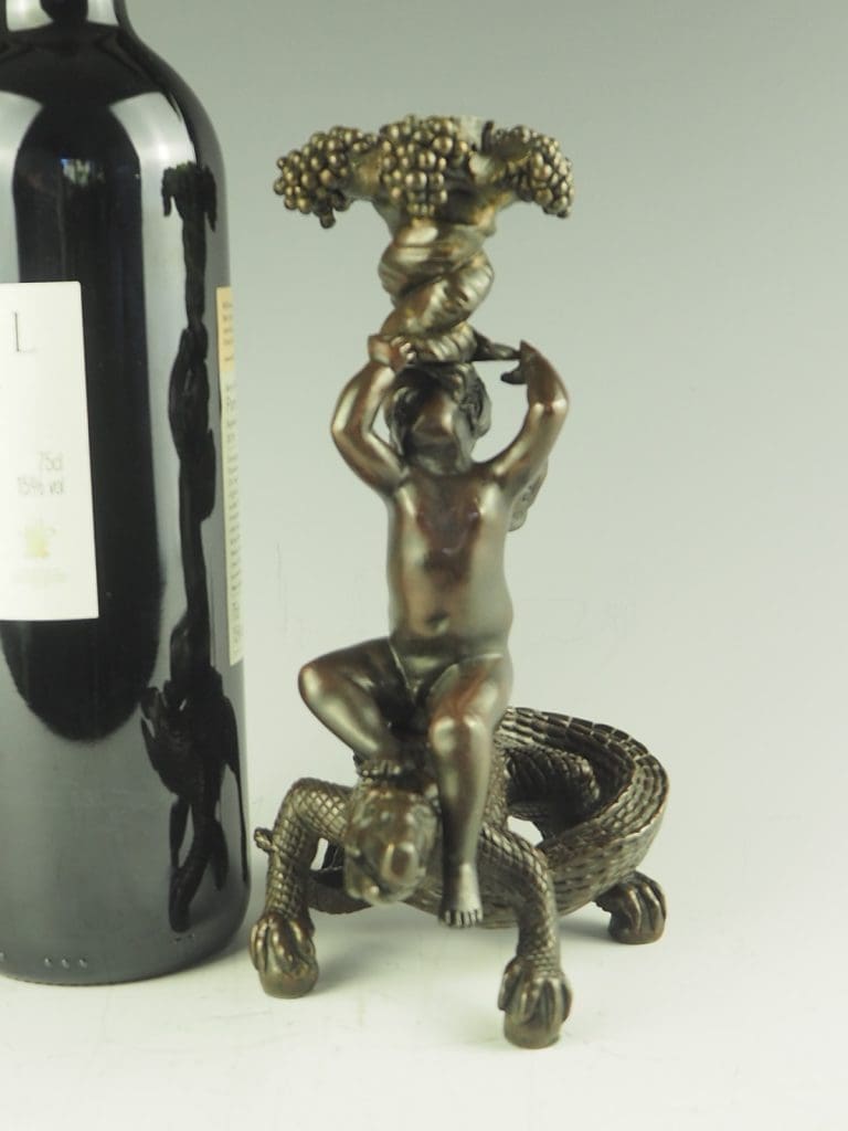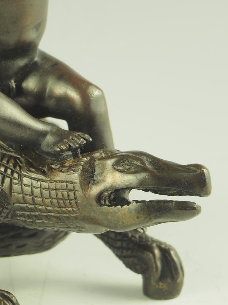 Antique bronze candlestick from the late 19th century showcases a captivating scene of a bacchanalian putto riding astride a crocodile or alligator.Â