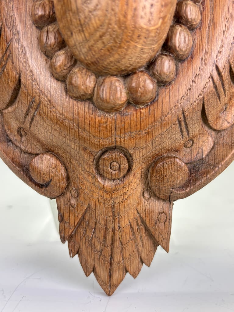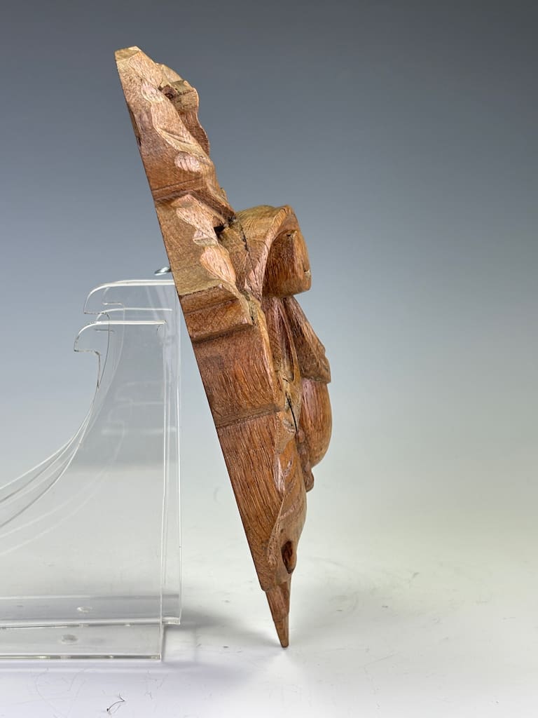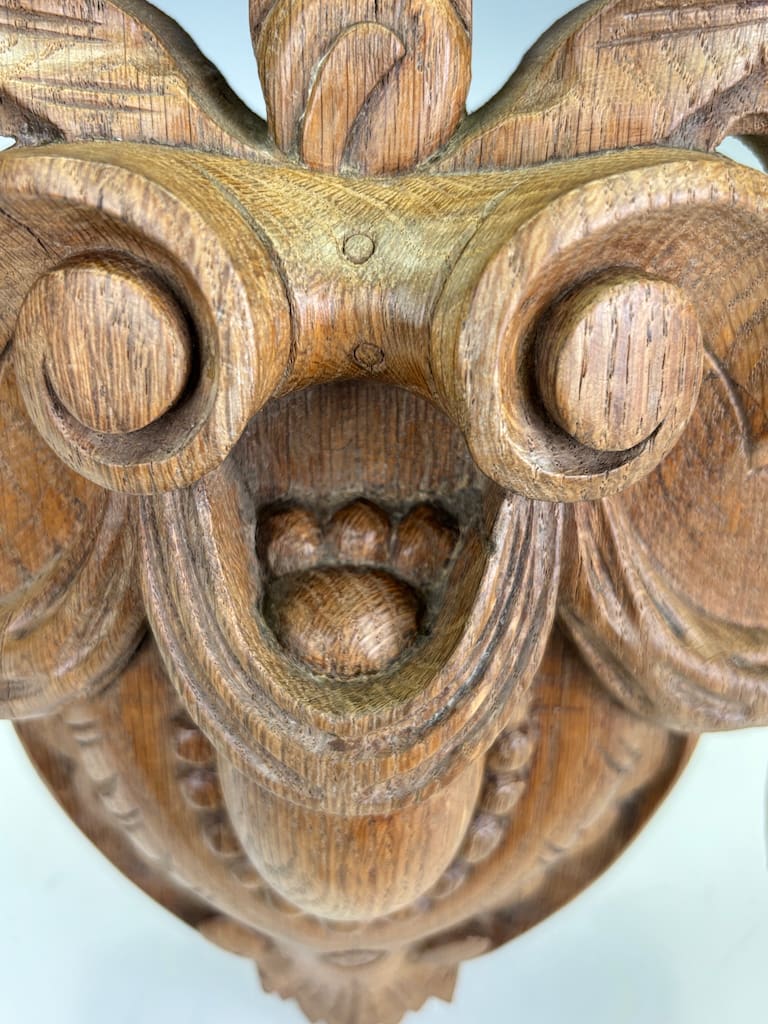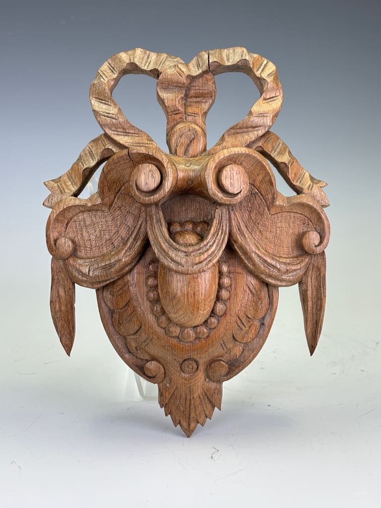 This carved oak cartouche is in excellent original condition, displaying a beautiful, rich patina consistent with its age. The wood has a warm, deep colour that highlights the fine details of the carving.