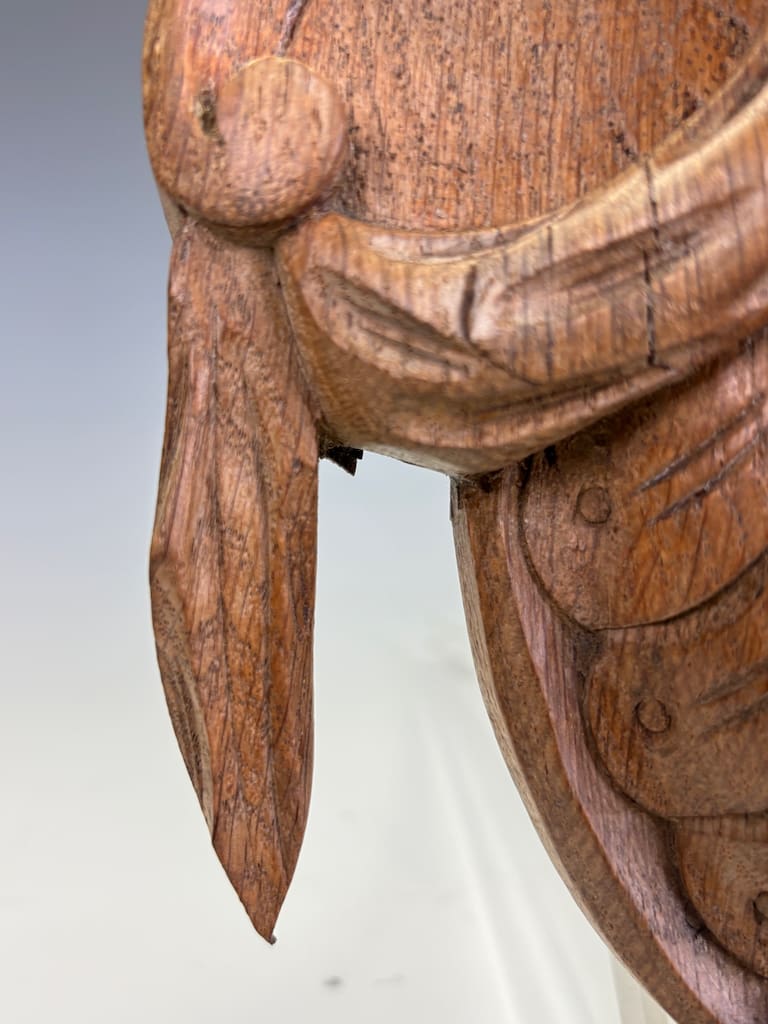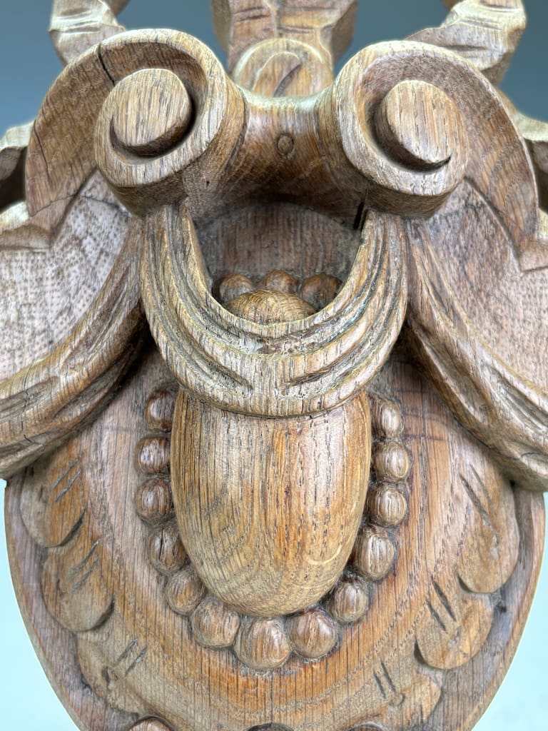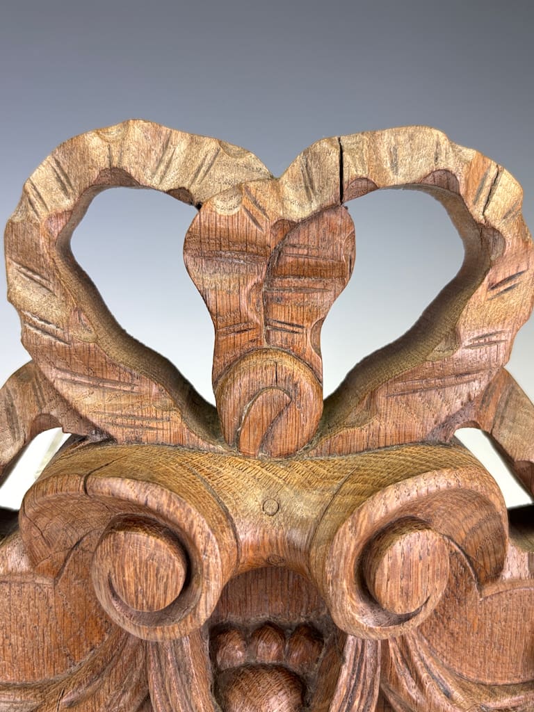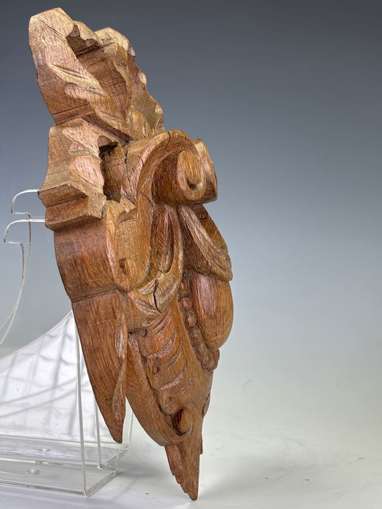 This carved oak cartouche is in excellent original condition, displaying a beautiful, rich patina consistent with its age. The wood has a warm, deep colour that highlights the fine details of the carving.