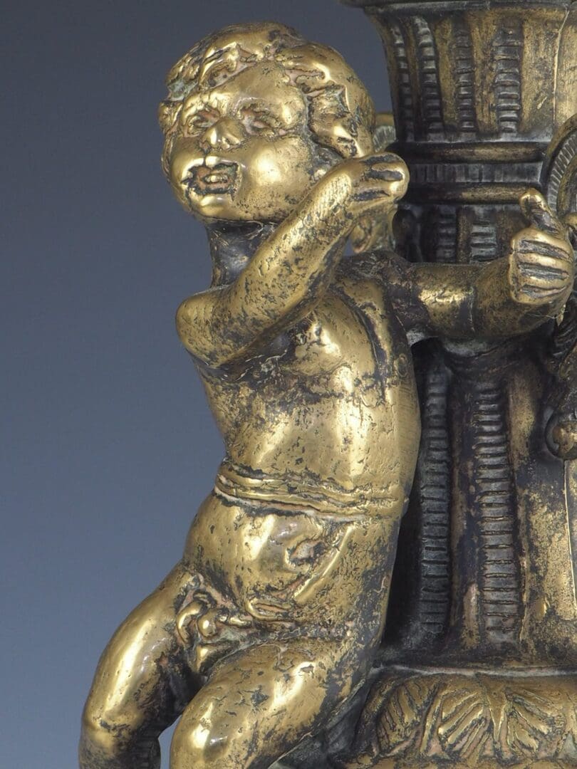 Description Gorgeous brass cherub / putti candlestick with beautiful detail. Ornate Cherub with Rams heads. Urn shaped with two decorative handles and four feet. Good quality and very heavy.