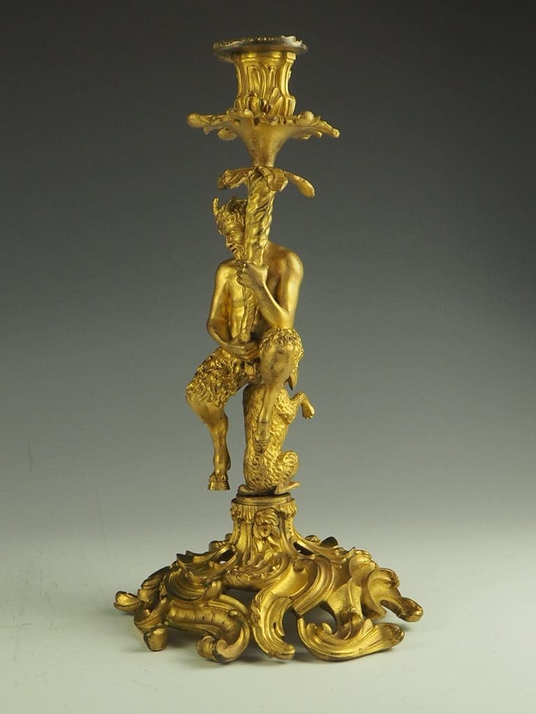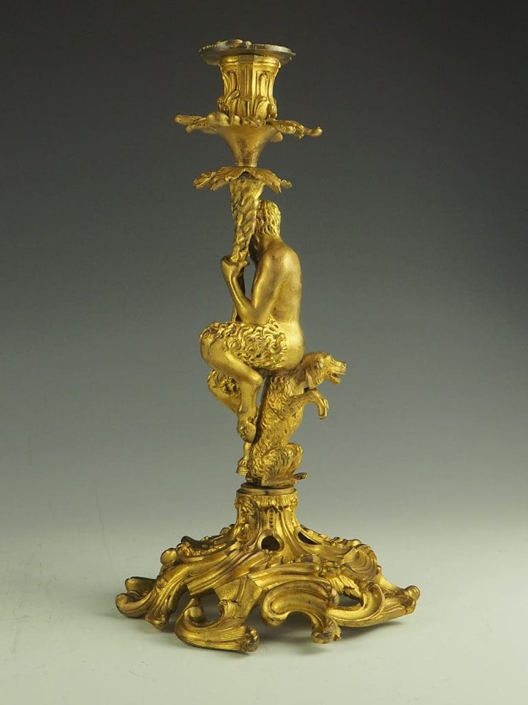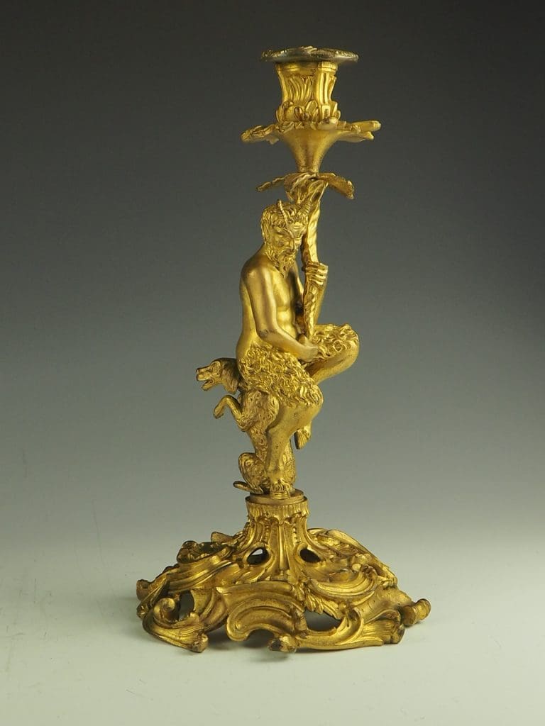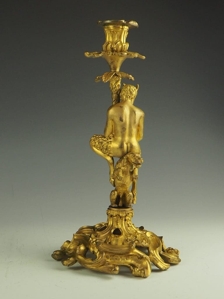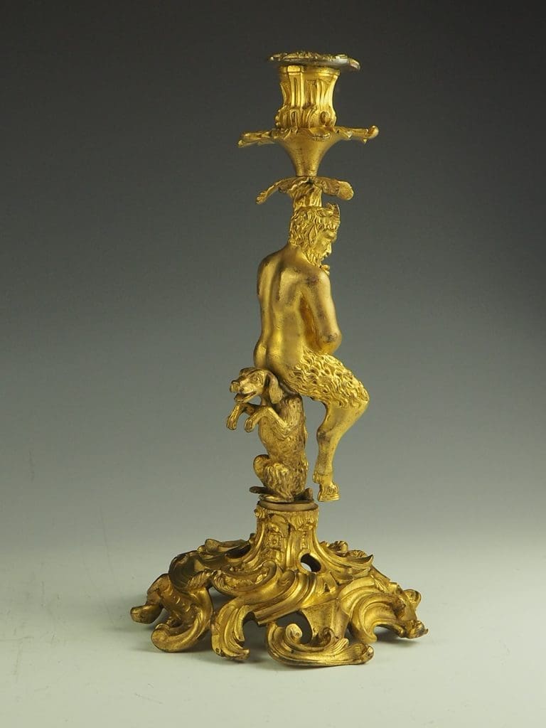 The candlestick formed as a Satyr seated on a dog and holding a cornucopia terminating in the candle sconce, raised on a heavy pierced rococo base. The design of this candlestick is a variant on a design by the French baroque sculptor Corneille Van Clève.