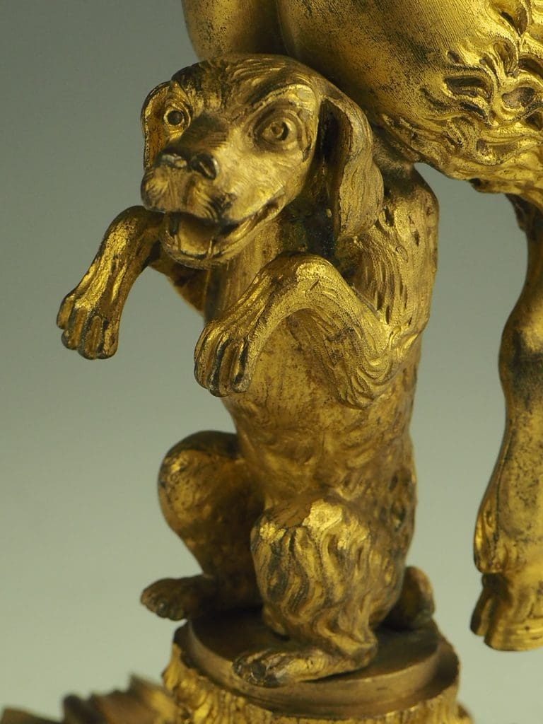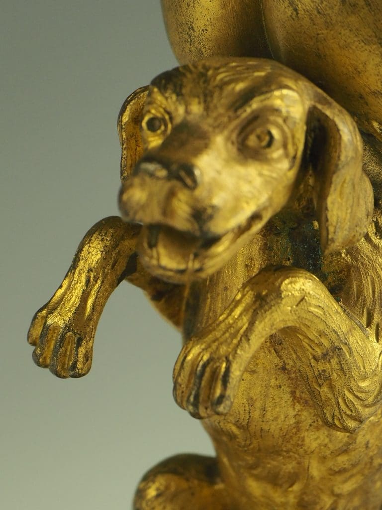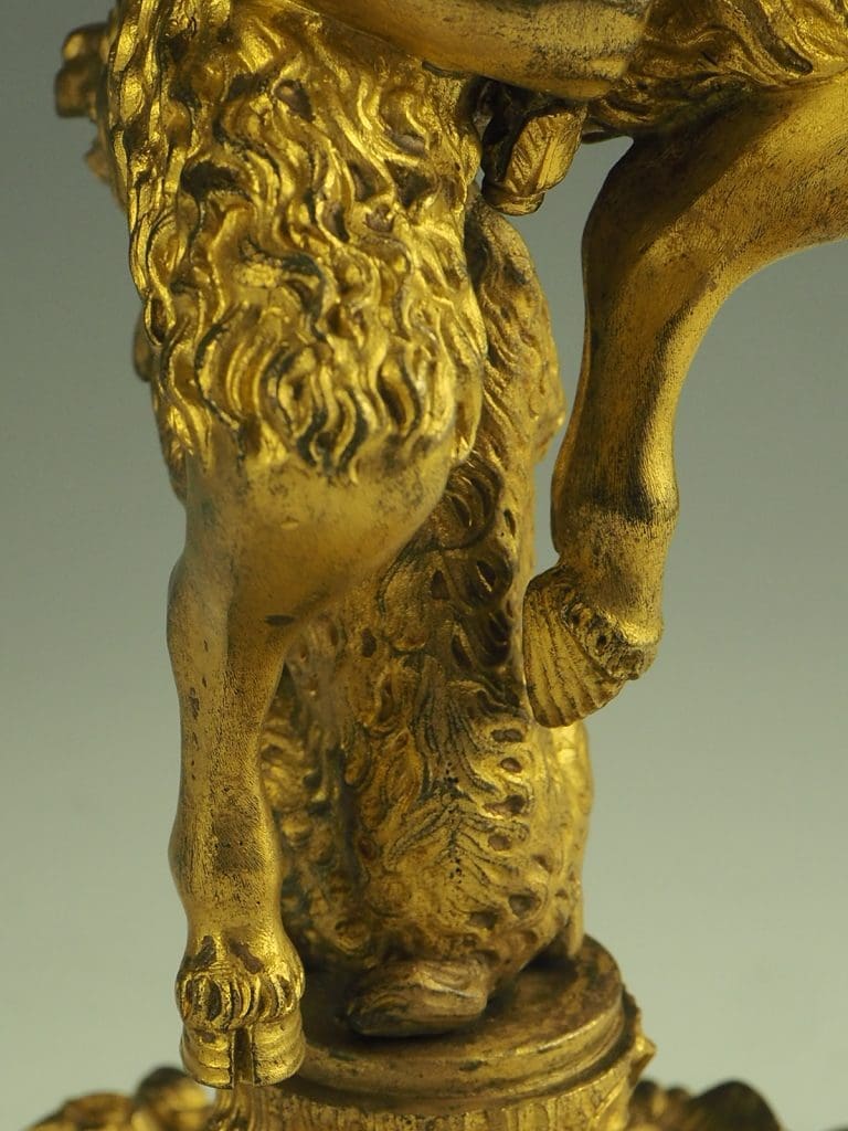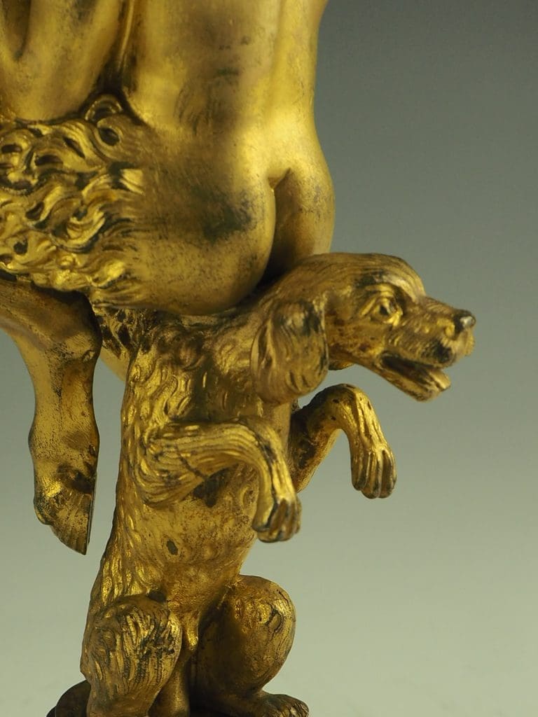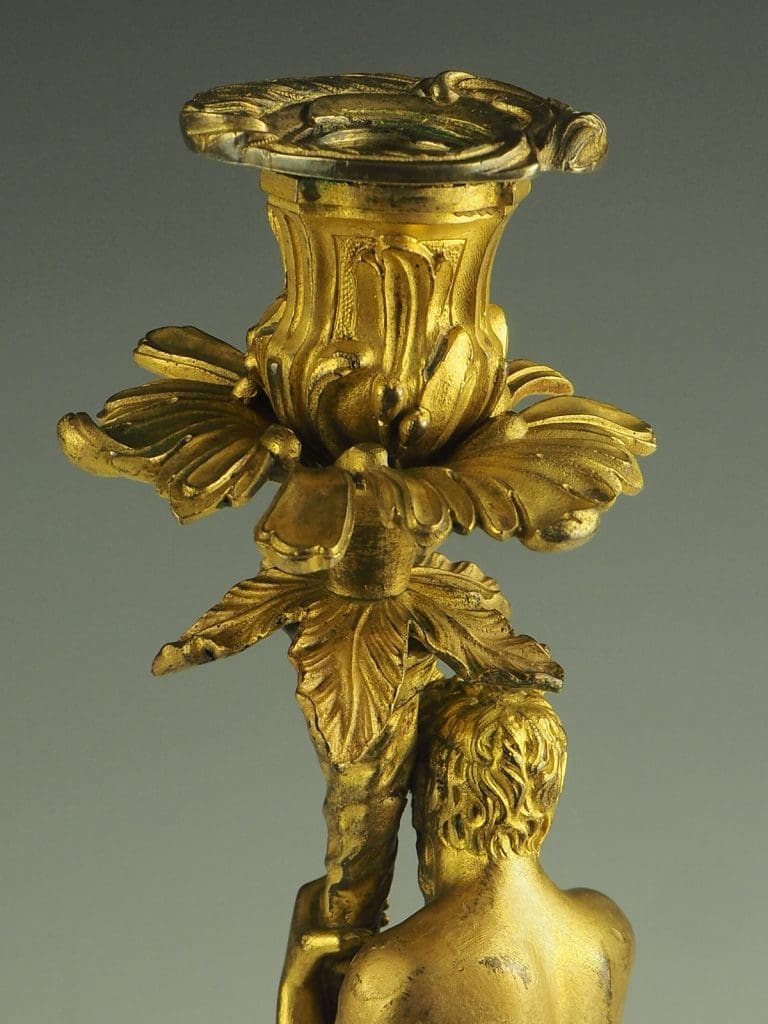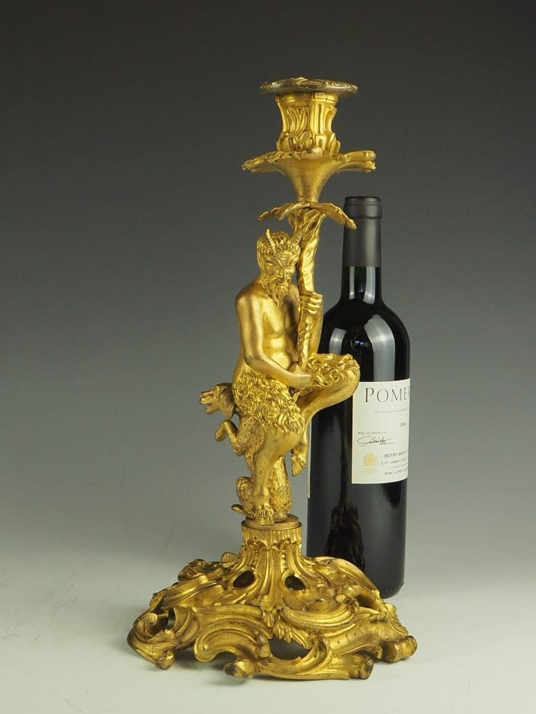 The candlestick formed as a Satyr seated on a dog and holding a cornucopia terminating in the candle sconce, raised on a heavy pierced rococo base. The design of this candlestick is a variant on a design by the French baroque sculptor Corneille Van Clève.