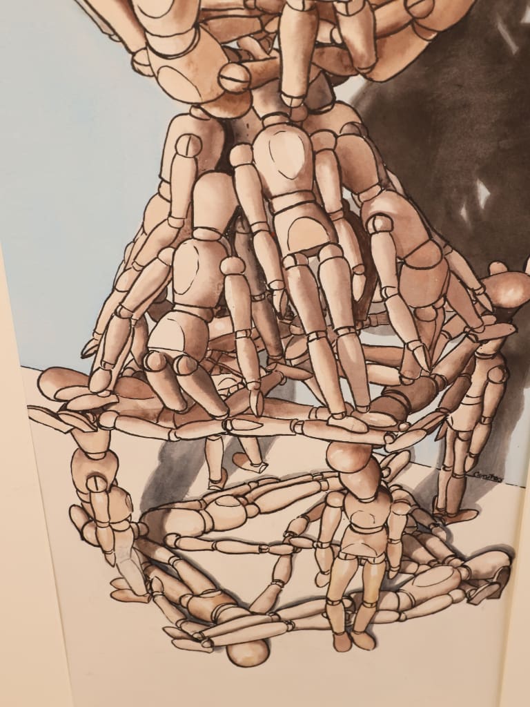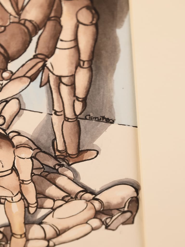 As the long-standing Head of Fine Art at Durham University, Carruthers used these mannequins as pedagogical tools to teach students about spatial relationships and form. In his later years, they became his primary subject, used to explore the "Human Comedy"—the way humans interact, conform, and exist within social structures.