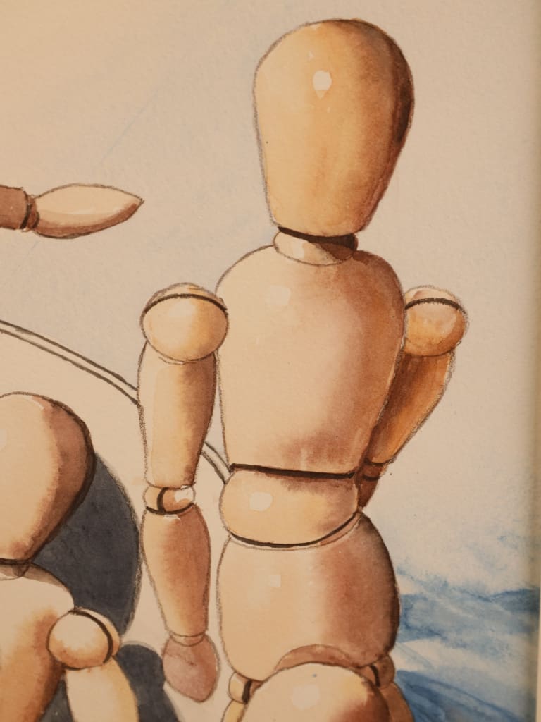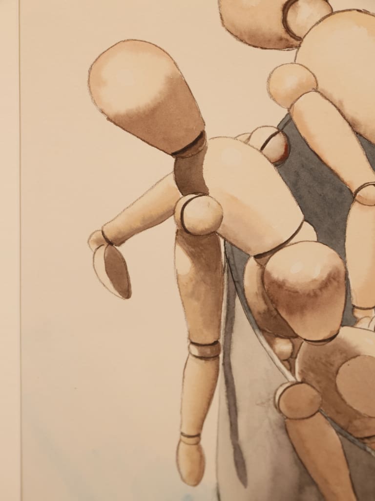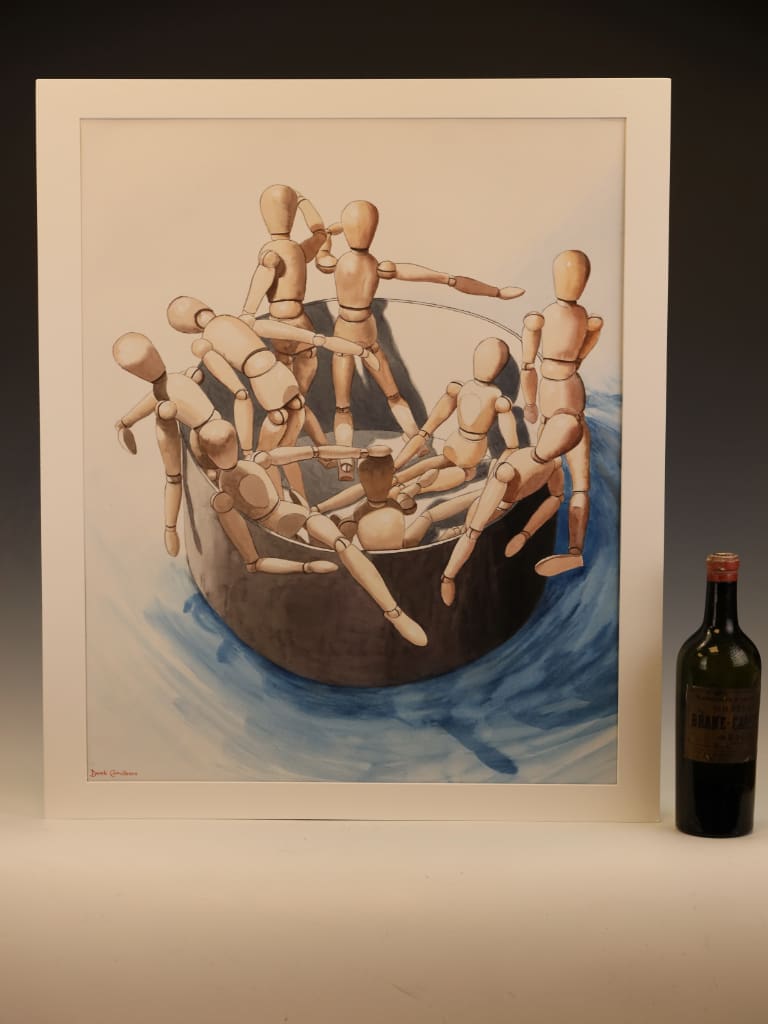 This exceptional original work, signed and dated October 1996, is a masterclass in draughtsmanship and atmospheric composition. Executed in watercolour and fine ink, the painting depicts a complex, rhythmic arrangement of articulated artists’ mannequins congregating around a dark, central vessel.