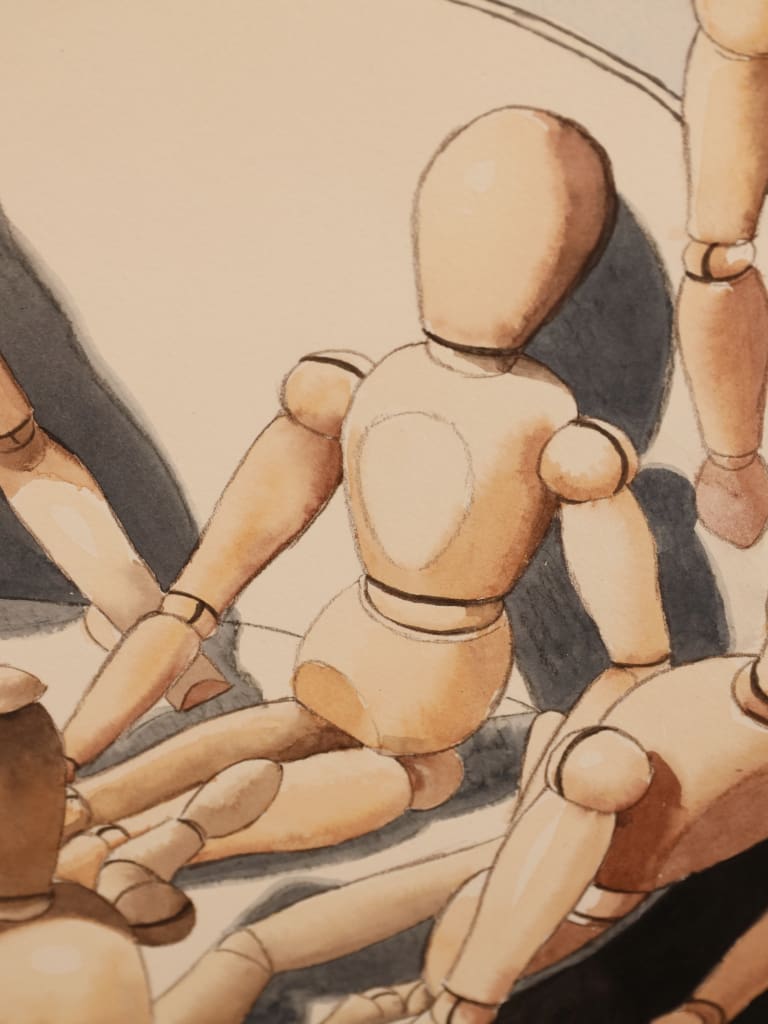 Carruthers held the prestigious position of Head of Fine Art at Durham University. It was here that he frequently utilised articulated artists’ mannequins as pedagogical tools to teach his students about form, scale, and spatial relationships. In his later career, these mannequins transitioned from humble studio aids to his primary subject matter. He painted these figures to explore the "Human Comedy," using their anonymous, articulated forms to represent social structures and collective human behaviour without the distraction of individual identity.