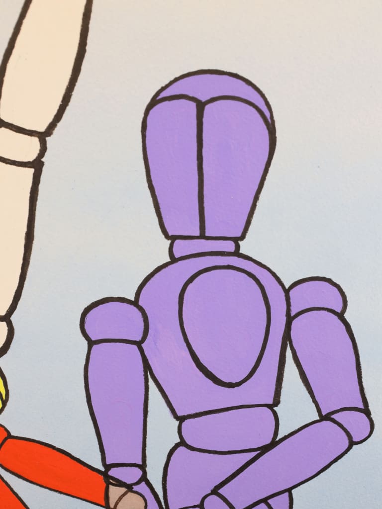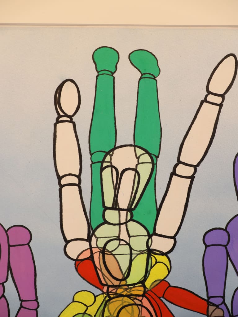 This original watercolour, dated February 2004, is by the British artist Derek Carruthers (1935–2021). The composition depicts a central articulated artist’s mannequin flanked by overlapping, colour-segmented mannequin forms rendered in vivid hues of purple, green, yellow and red, set against a pale blue ground.