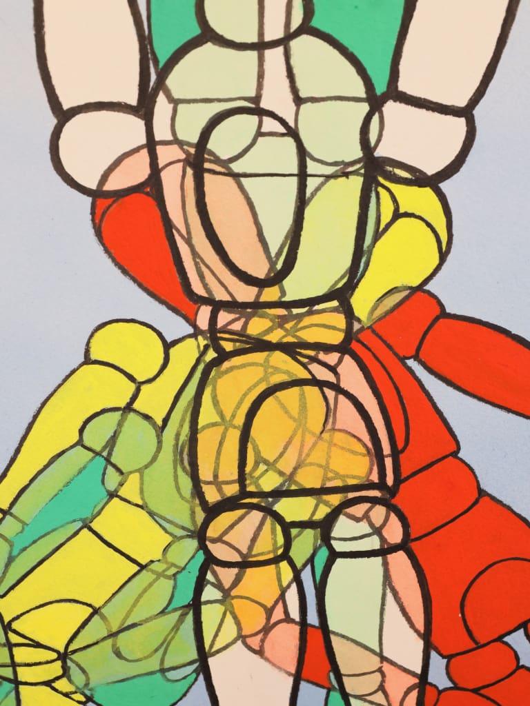 The superimposition of figures suggests movement through space and time, creating a rhythmic interplay between repetition and variation. Carruthers’ use of colour serves both a formal and conceptual purpose, distinguishing individual positions while reinforcing the underlying uniformity of form. The work explores themes of identity, multiplicity and collective presence, while maintaining the artist’s characteristic removal of personal features.
