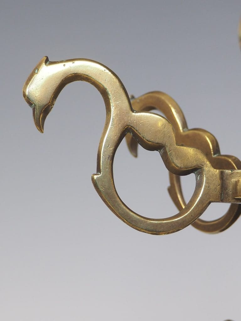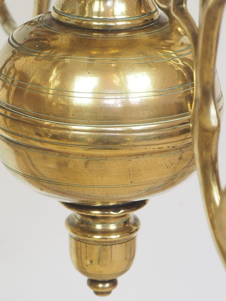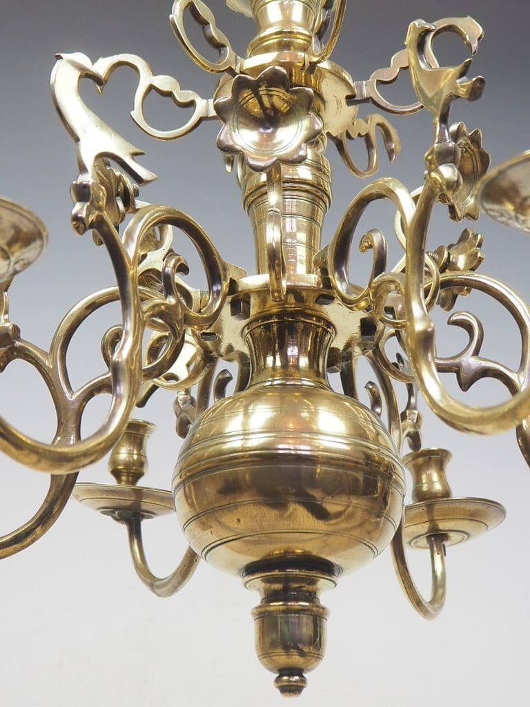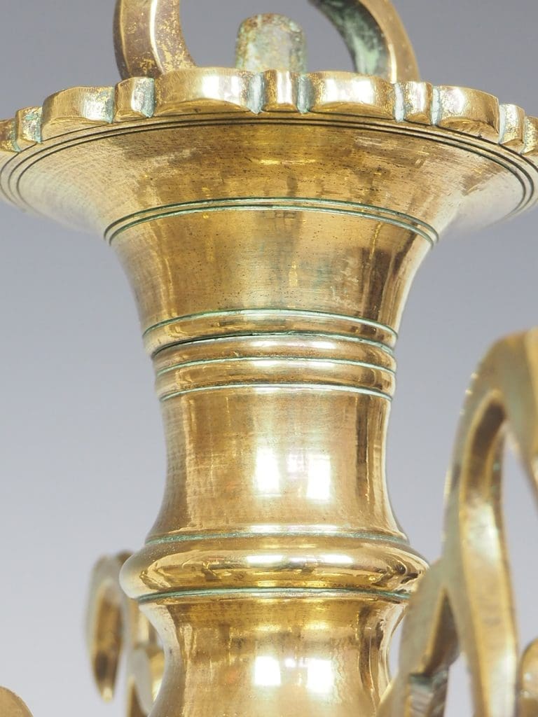 The central stem surmounted by a trefoil suspension loop over a domed ceiling rose, the baluster, knopped and ringed stem with decorative borders of stamped circles, with a dot numbered disc issuing eight decorative removable scrolling arms, above the main disc issuing the eight scrolling branches with birds perching terminating in circular drip pans and urn shaped nozzles, also dot marked