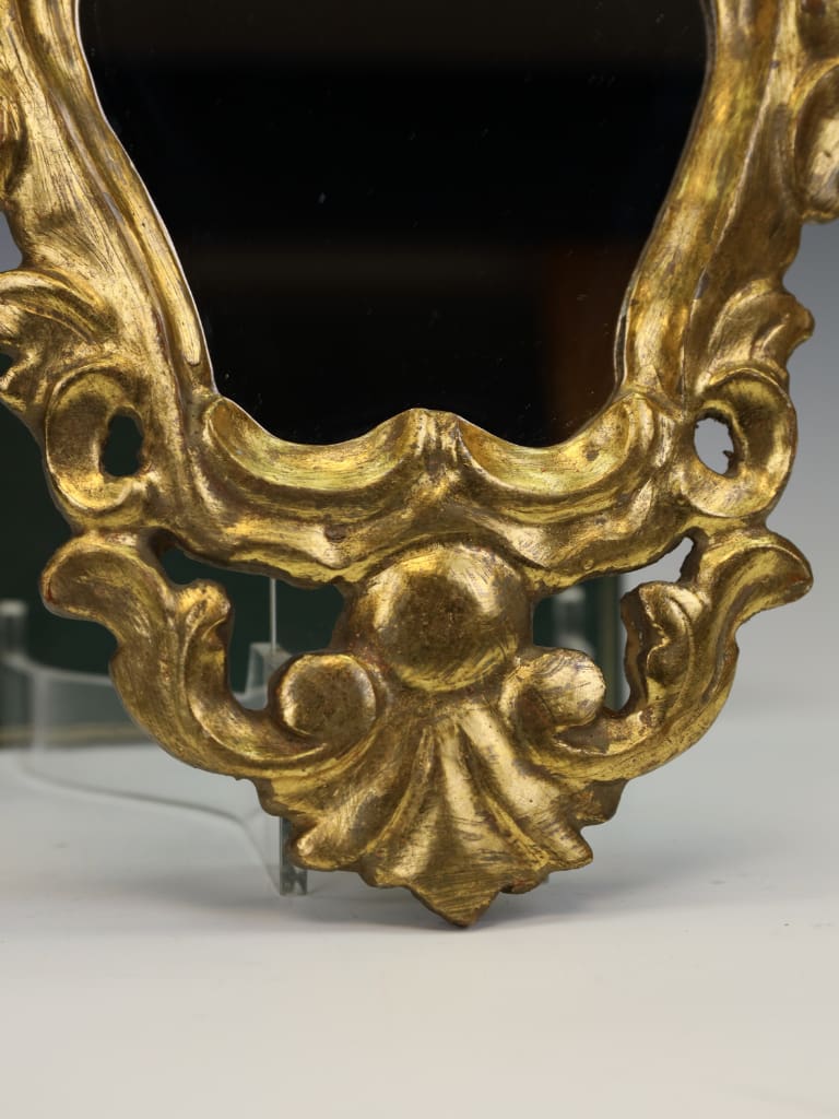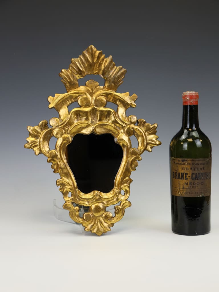 "In the world of French decorative arts, scale is everything. This mirror manages to pack the theatricality of a palace ballroom into a mere 41 centimeters. It is the perfect 'jewel' for a small gallery wall or an intimate powder room. What I find most appealing is the authentic wear to the gilding—you can see the red bole and the timber peeking through the high points, which provides that unmistakable 'shabby-chic' veracity that simply cannot be manufactured."