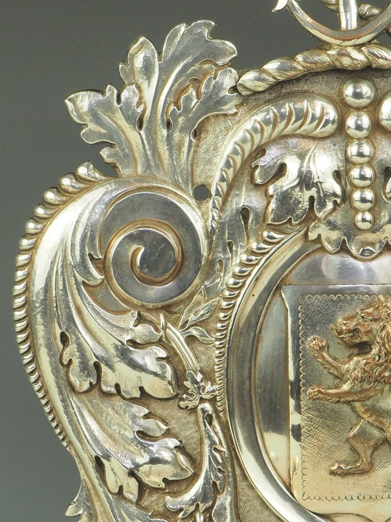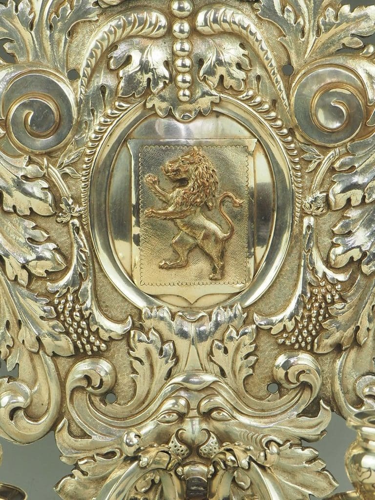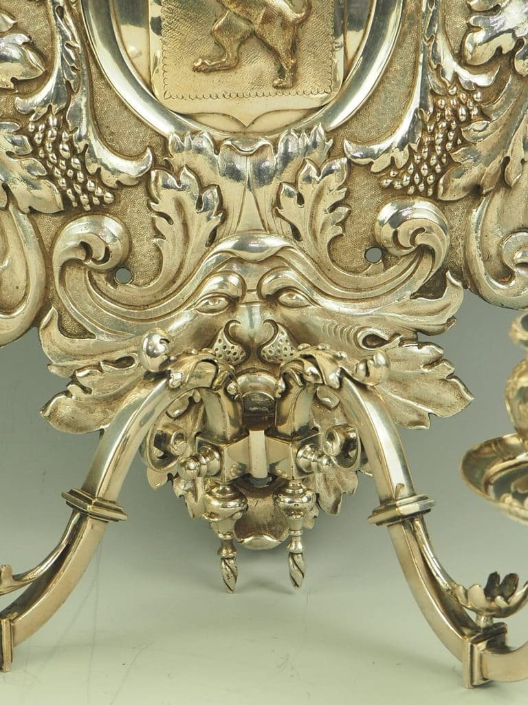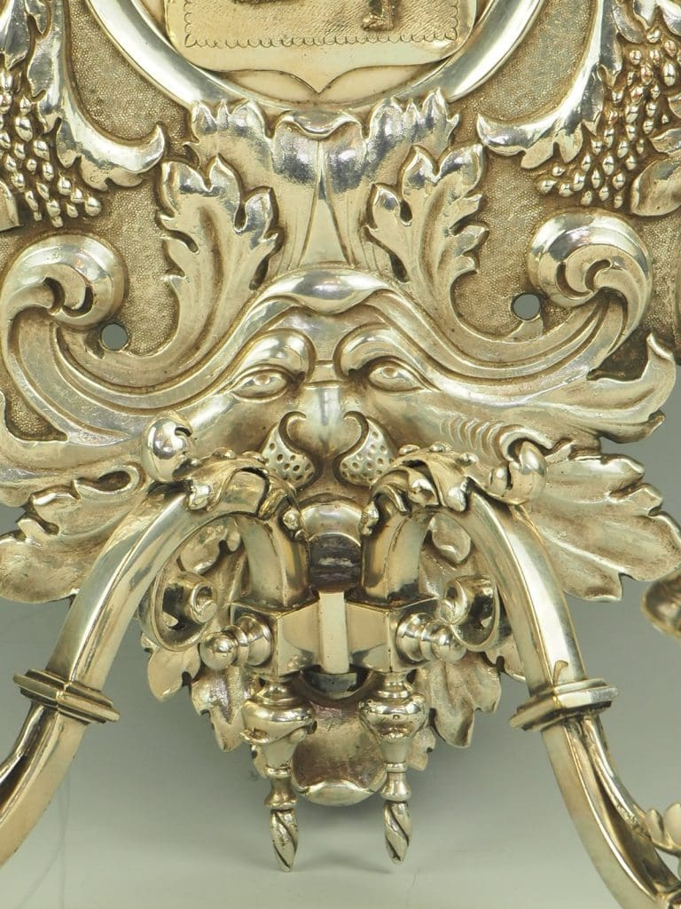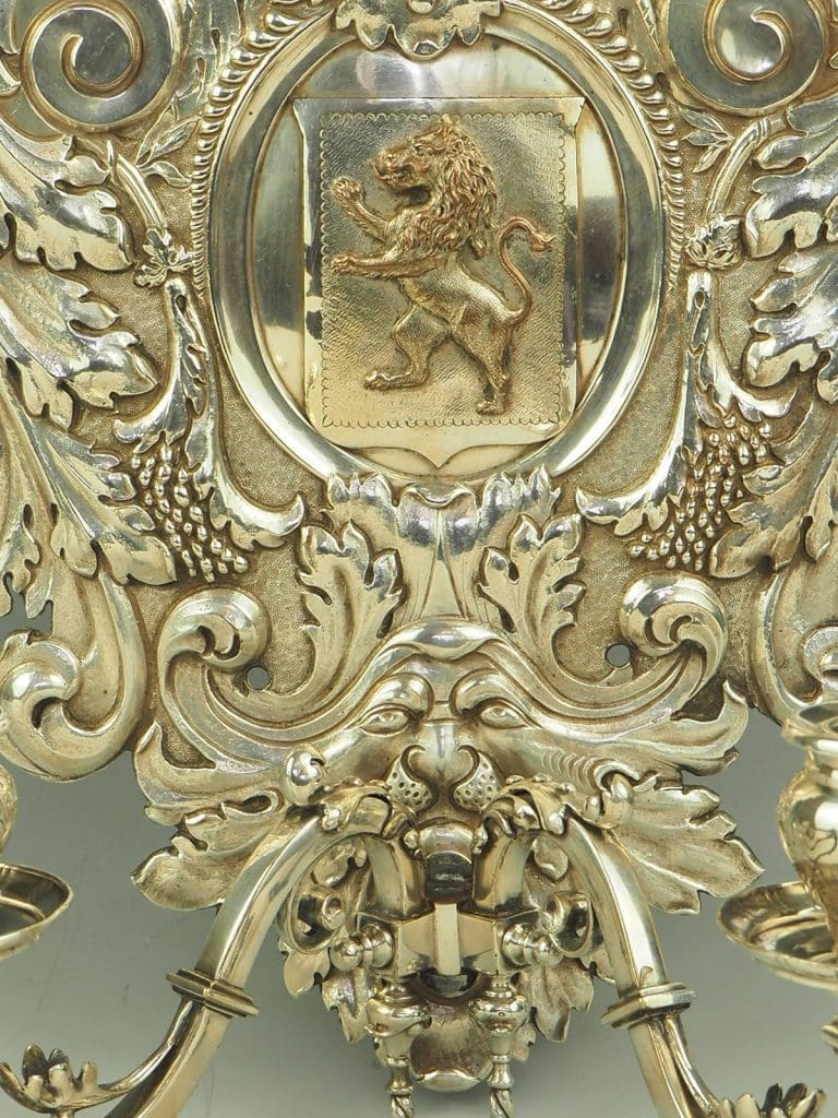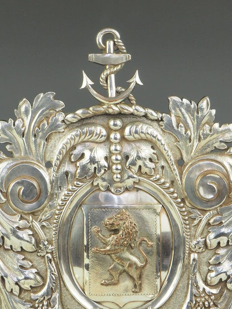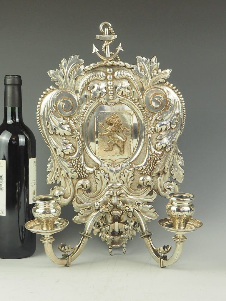 Shield shaped back decorated with an anchor and heraldic lion, mounted with two candle sconce arms