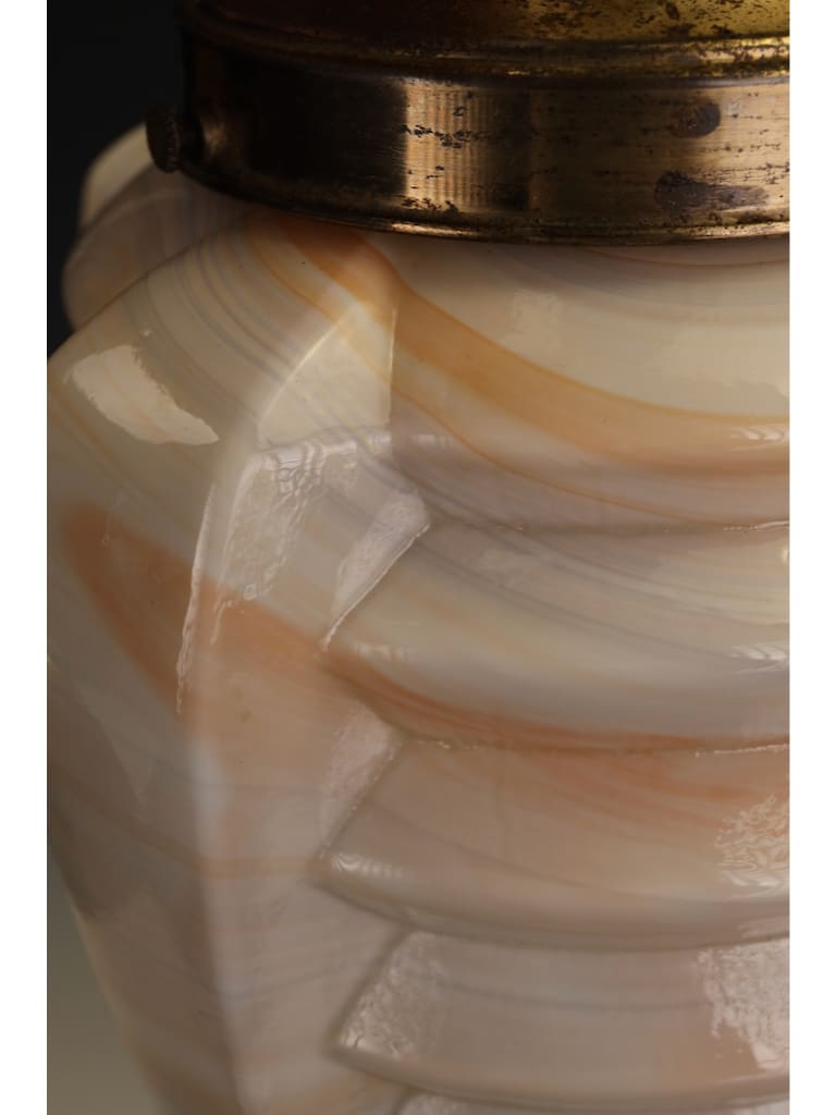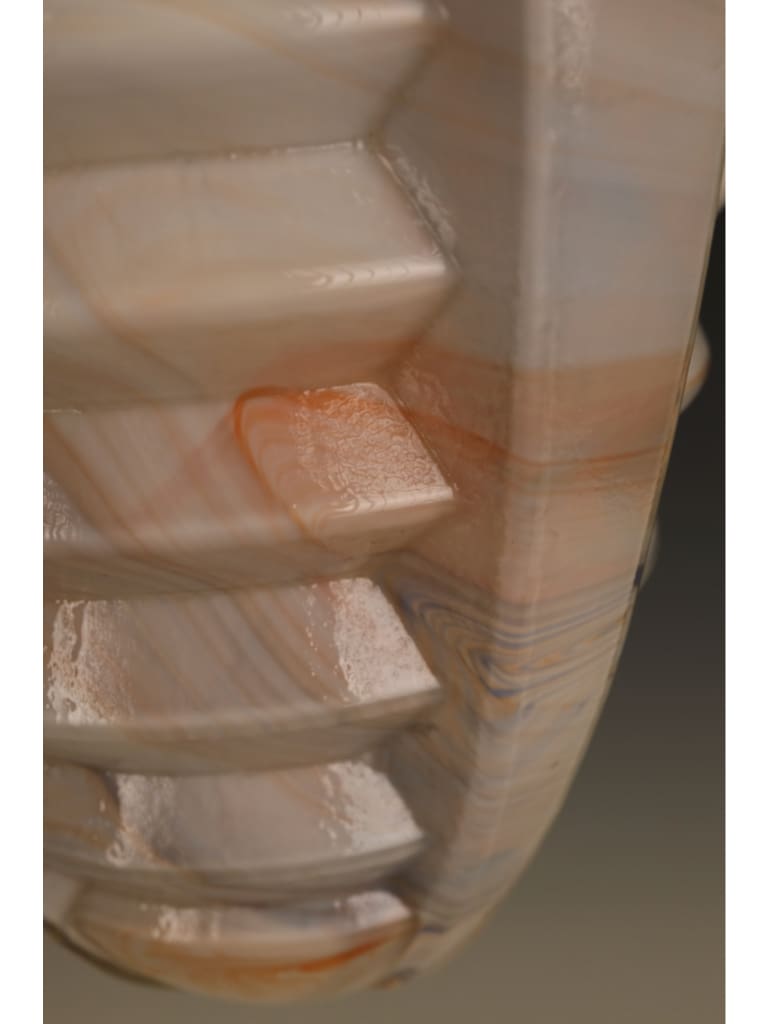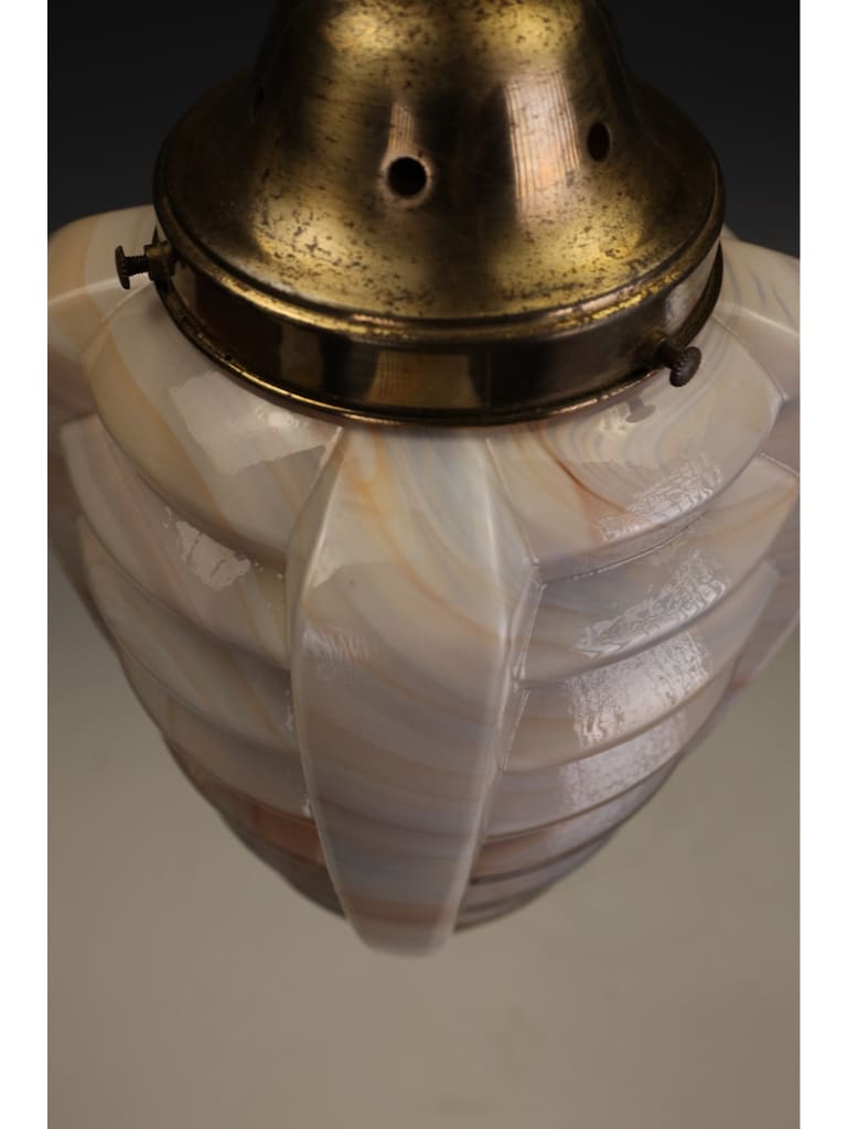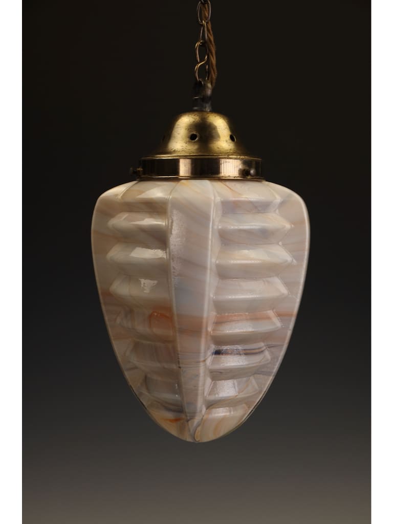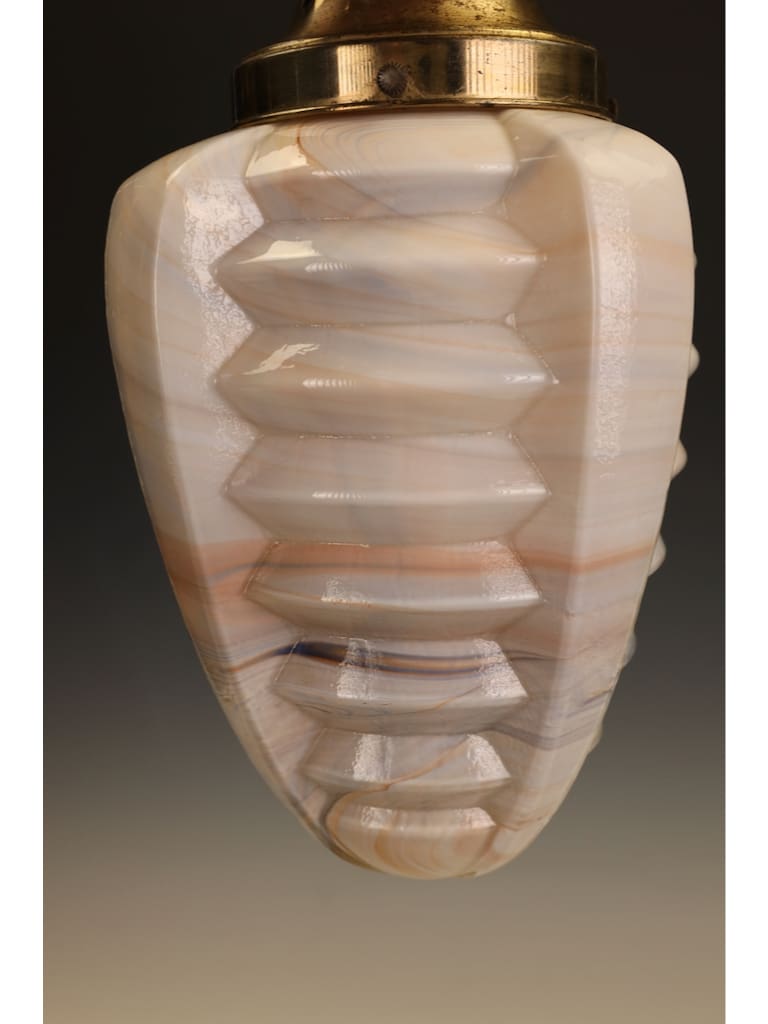 The pendant is beautifully formed, its bold geometric body worked with pronounced ribbed facets that capture and reflect the light, enhancing the natural swirling patterns within the glass. The glass itself displays the characteristic warm tones and subtle translucence for which high-quality slag glass is so admired, producing a soft yet atmospheric glow when lit.