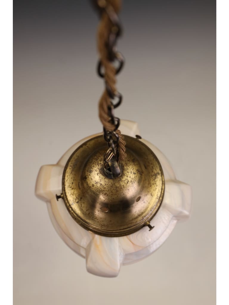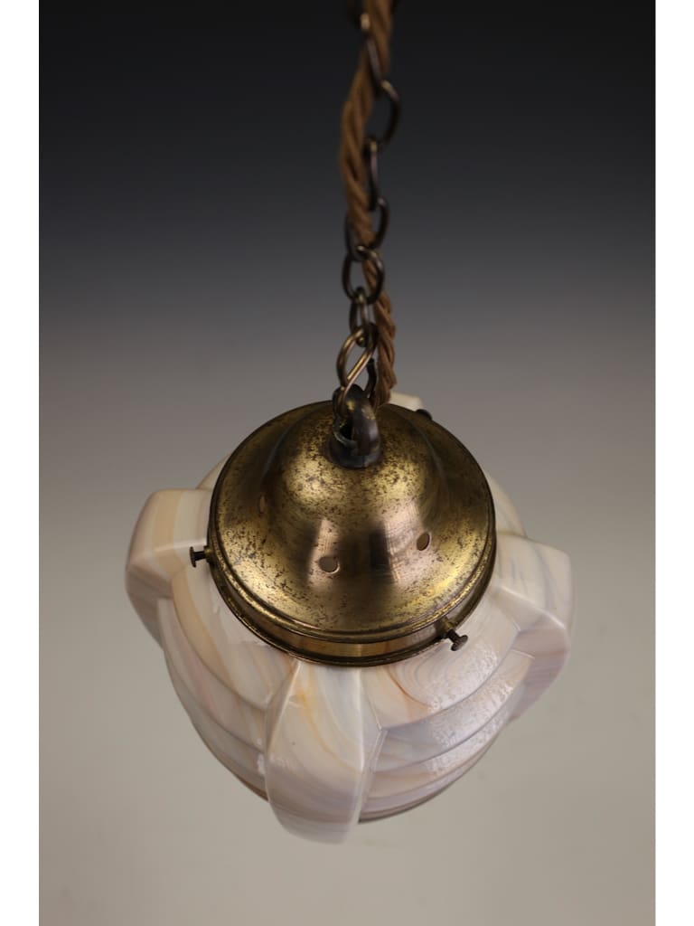 A striking and rare example of early 20th century lighting, this large ceiling pendant is crafted from exquisite slag glass, composed of three distinct layers – a lustrous opaline, richly veined slag marble glass, and a clear glass outer surface which lends depth and vibrancy when illuminated.