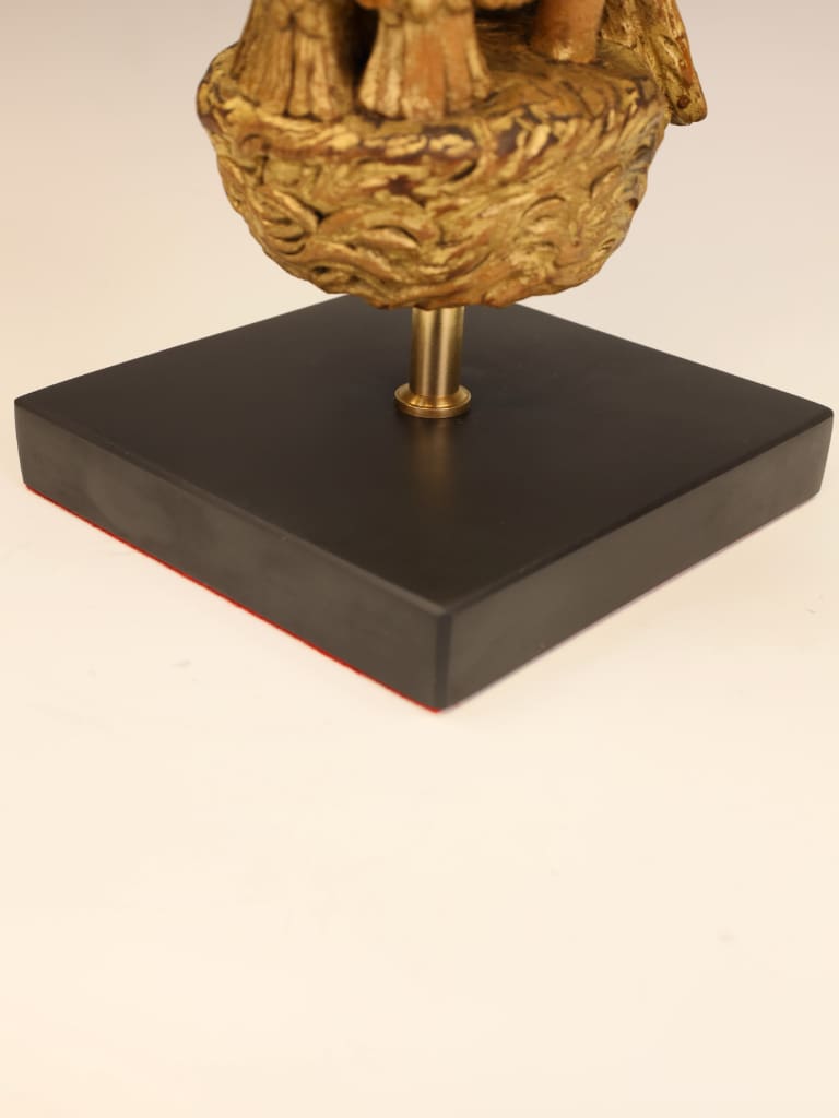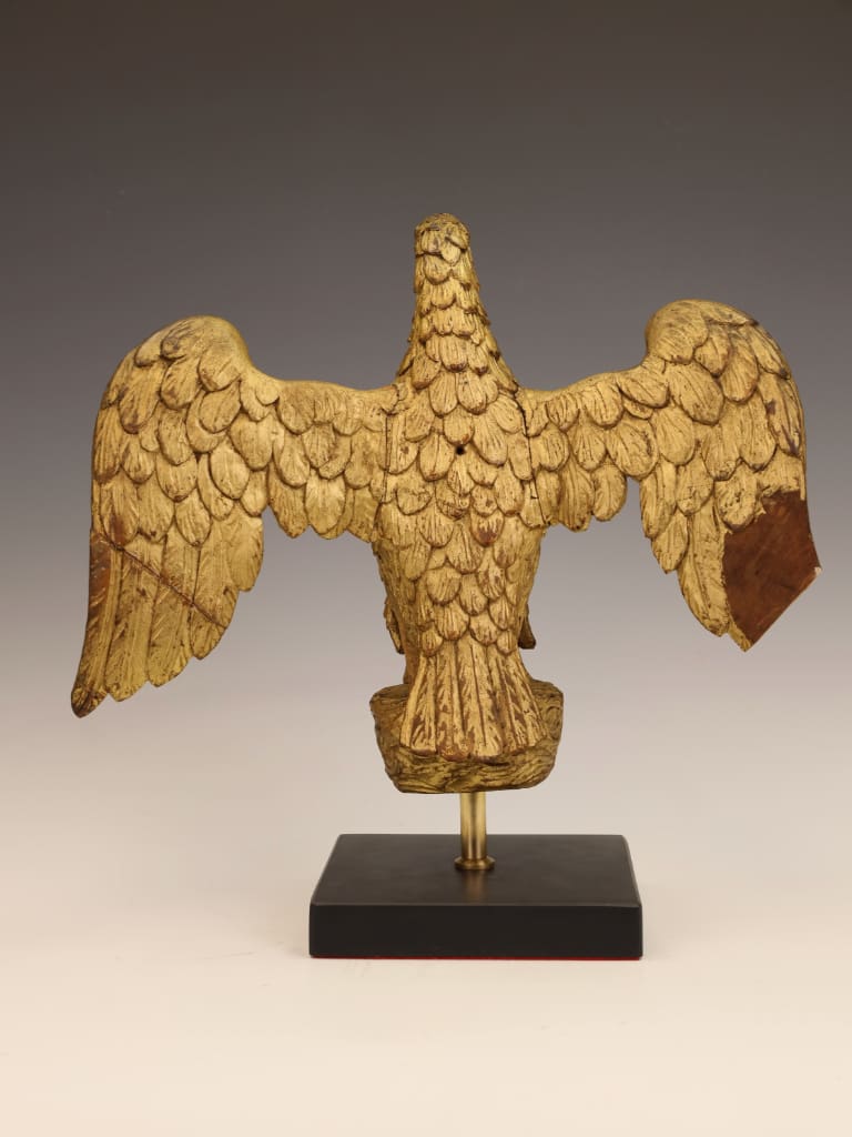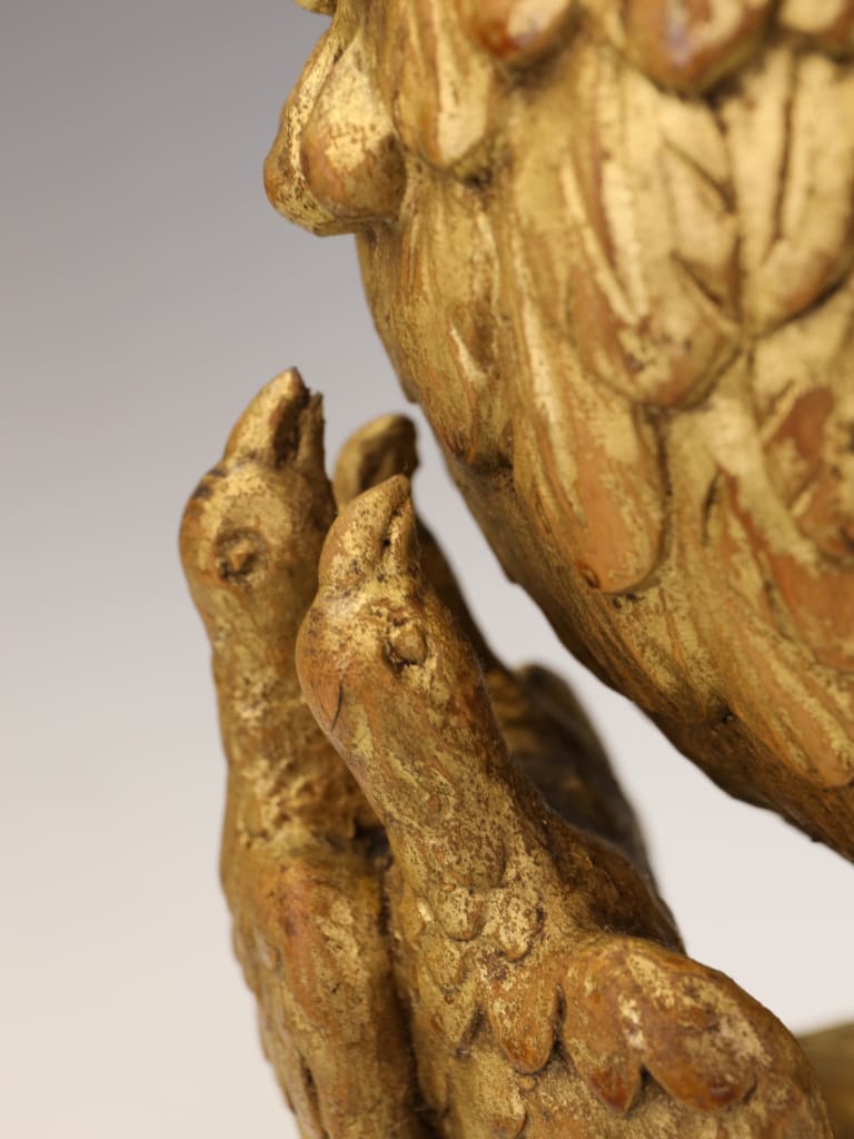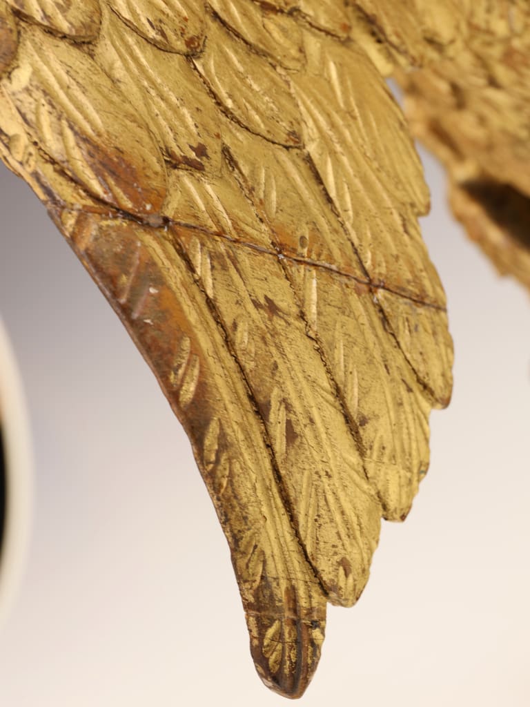 The carving remains structurally sound and retains its original gilded surface with an attractive aged patina. Both wings, however, show historical damage: one wingtip is lacking, and the opposing wing has an old break which has been rejoined. The repair is visible, though stable. Minor rubbing and age-related wear to the gilding throughout, consistent with its period and use. No evidence of modern overpainting. The piece is well-presented on its later stand and remains an impressive and well-preserved example despite the noted losses.