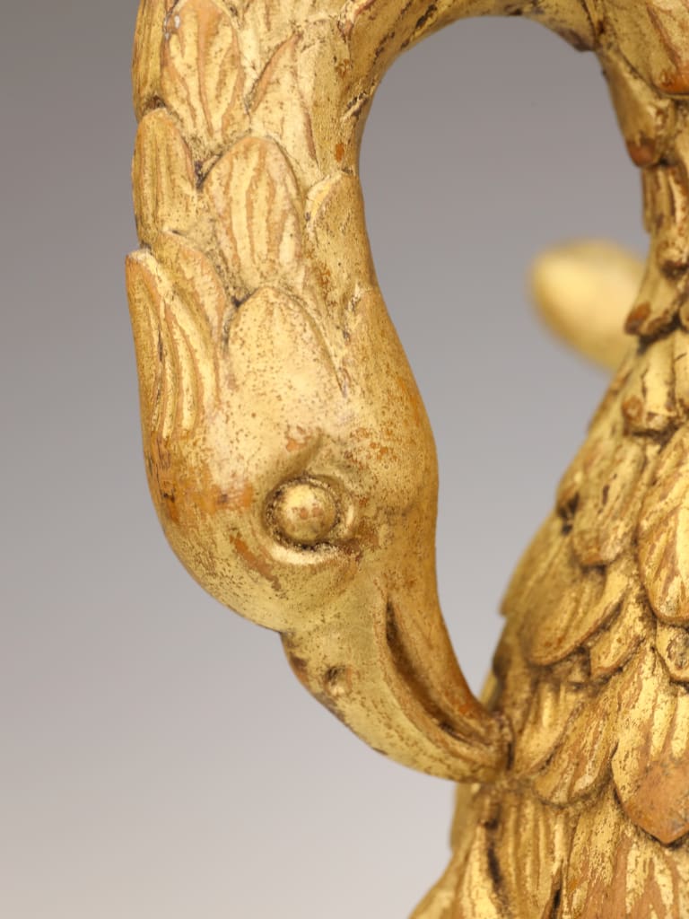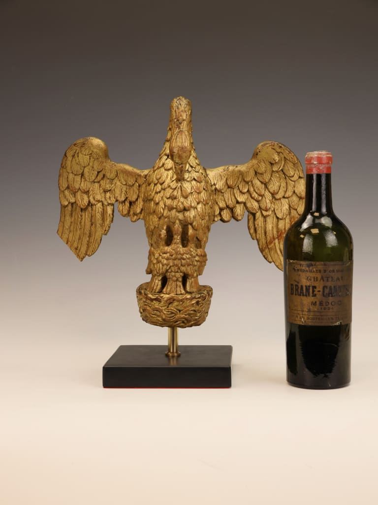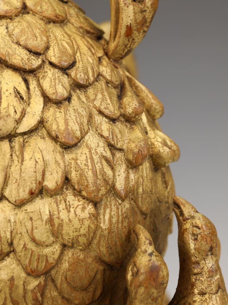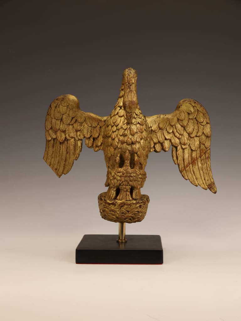 The carving remains structurally sound and retains its original gilded surface with an attractive aged patina. Both wings, however, show historical damage: one wingtip is lacking, and the opposing wing has an old break which has been rejoined. The repair is visible, though stable. Minor rubbing and age-related wear to the gilding throughout, consistent with its period and use. No evidence of modern overpainting. The piece is well-presented on its later stand and remains an impressive and well-preserved example despite the noted losses.