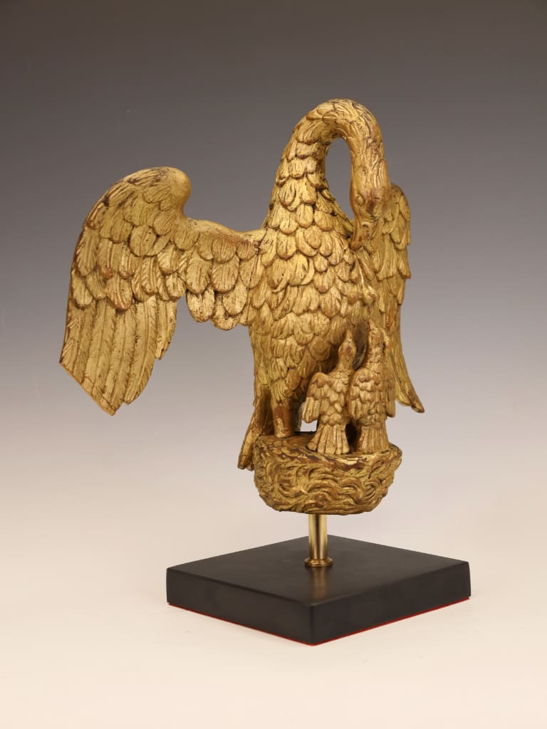 A beautifully carved and richly gilt wooden figure depicting the venerable motif of the Pelican in Her Piety, mounted on a later museum-style stand. This exceptional piece, most likely late 18th to early 19th century, exemplifies the highly symbolic devotional carvings once found in ecclesiastical interiors across Britain and Continental Europe.