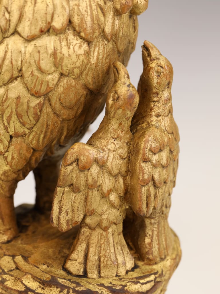 The subject of the Pelican in Her Piety has been associated with Christian symbolism since medieval times, representing self-sacrifice, divine love, and resurrection. According to medieval bestiaries, the pelican was believed to pierce her own breast to nourish her young with her blood—an allegory for Christ’s sacrifice. Carvings of this type were often placed on church lecterns, altarpieces, or within clerical furnishings to underscore themes of devotion and spiritual renewal.