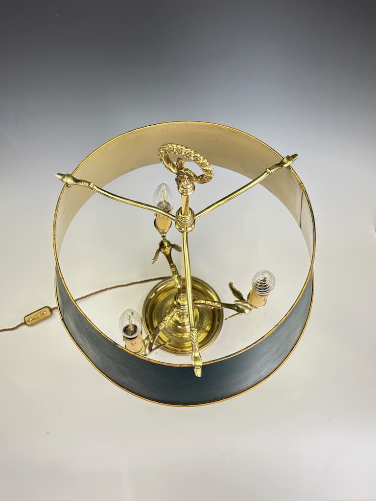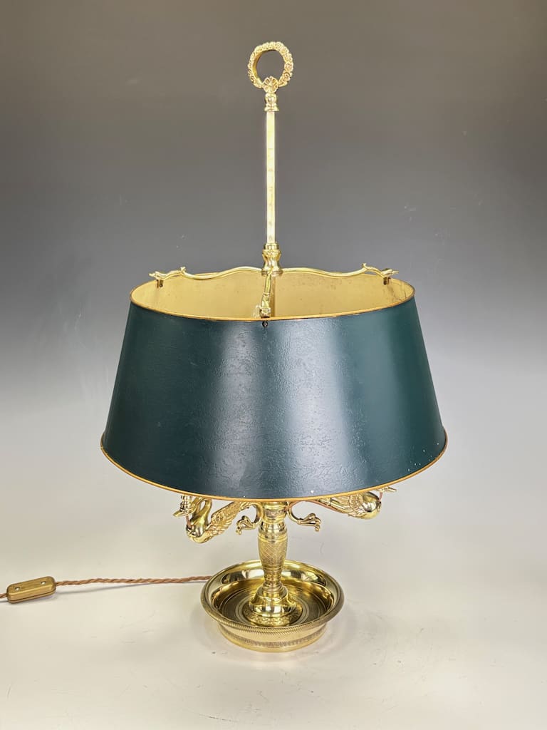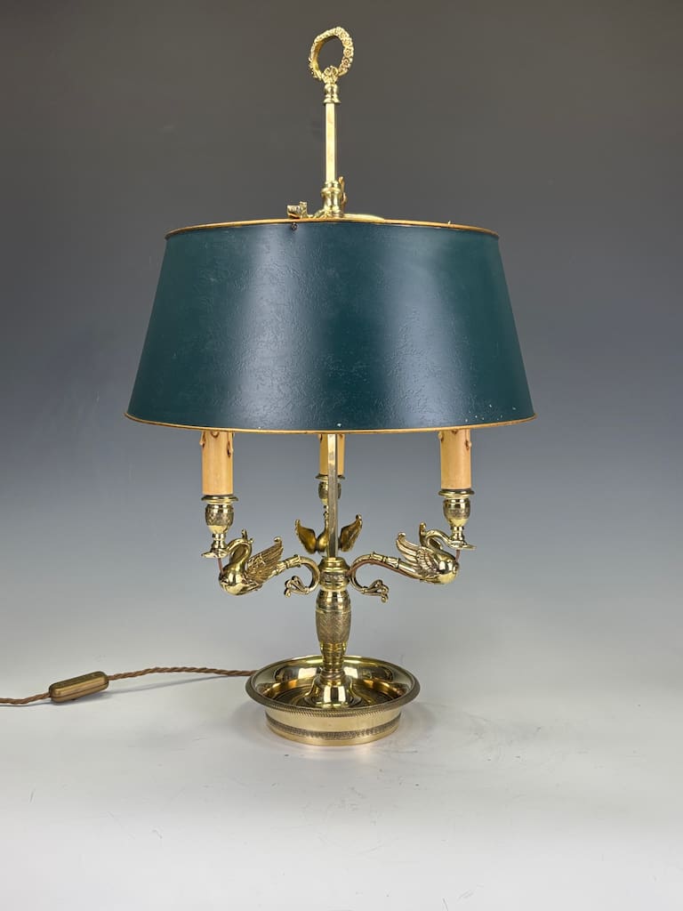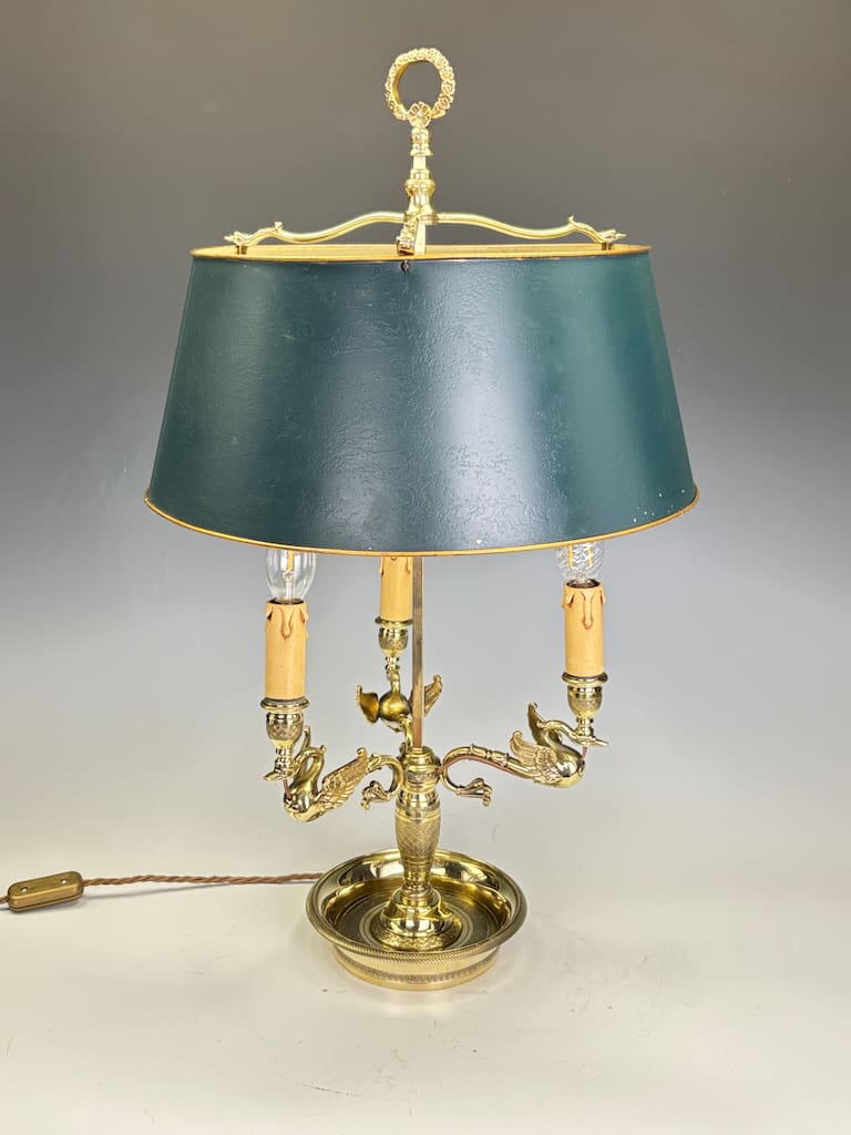A highly refined French bouillotte-style table lamp, dating to circa 1900, cast in gilt brass with elegant neoclassical detail. This exceptional piece features three finely modelled swan-form arms, each supporting faux candle sockets in the traditional Empire manner. Above rests the original green-painted tole shade, trimmed with a gilt edge, adjustable via the central stem — a hallmark of true bouillotte design.