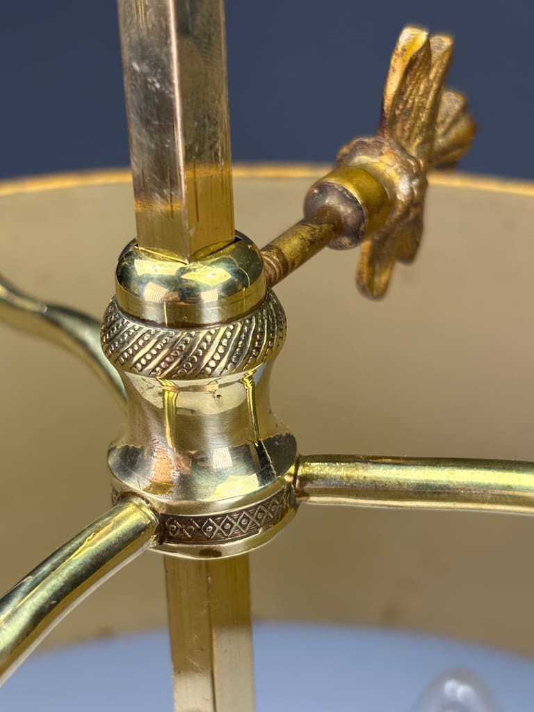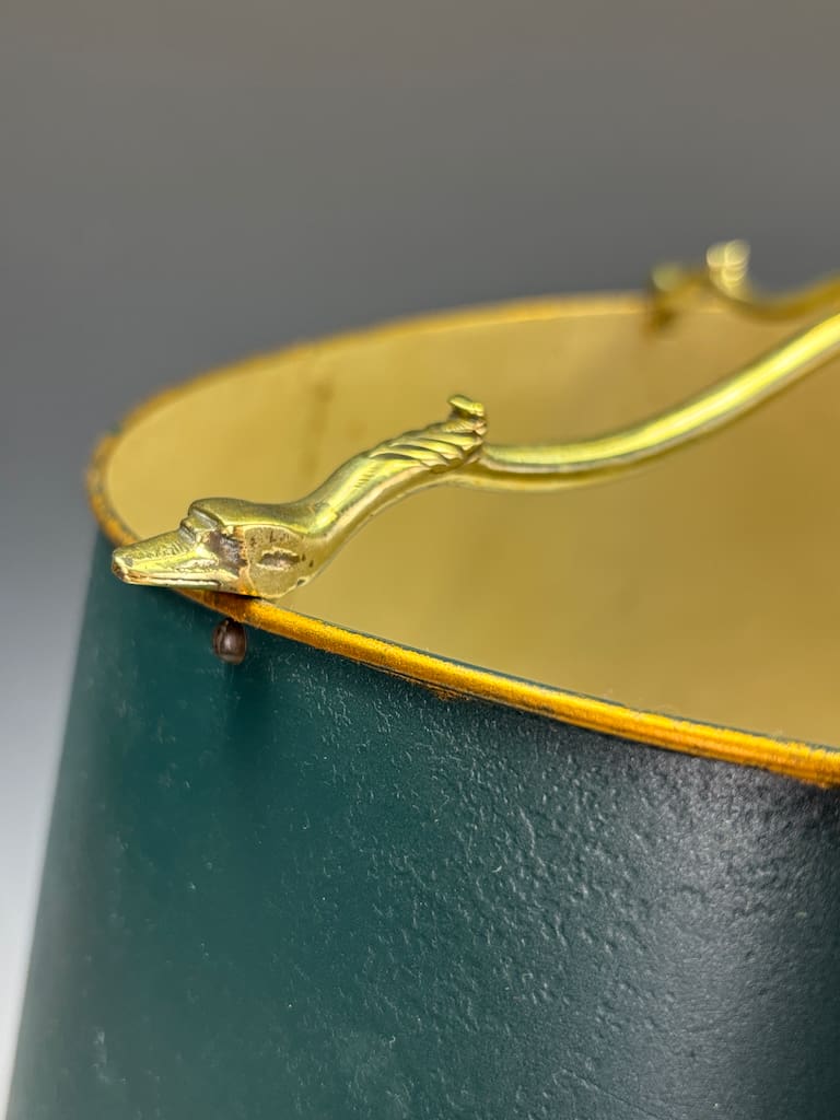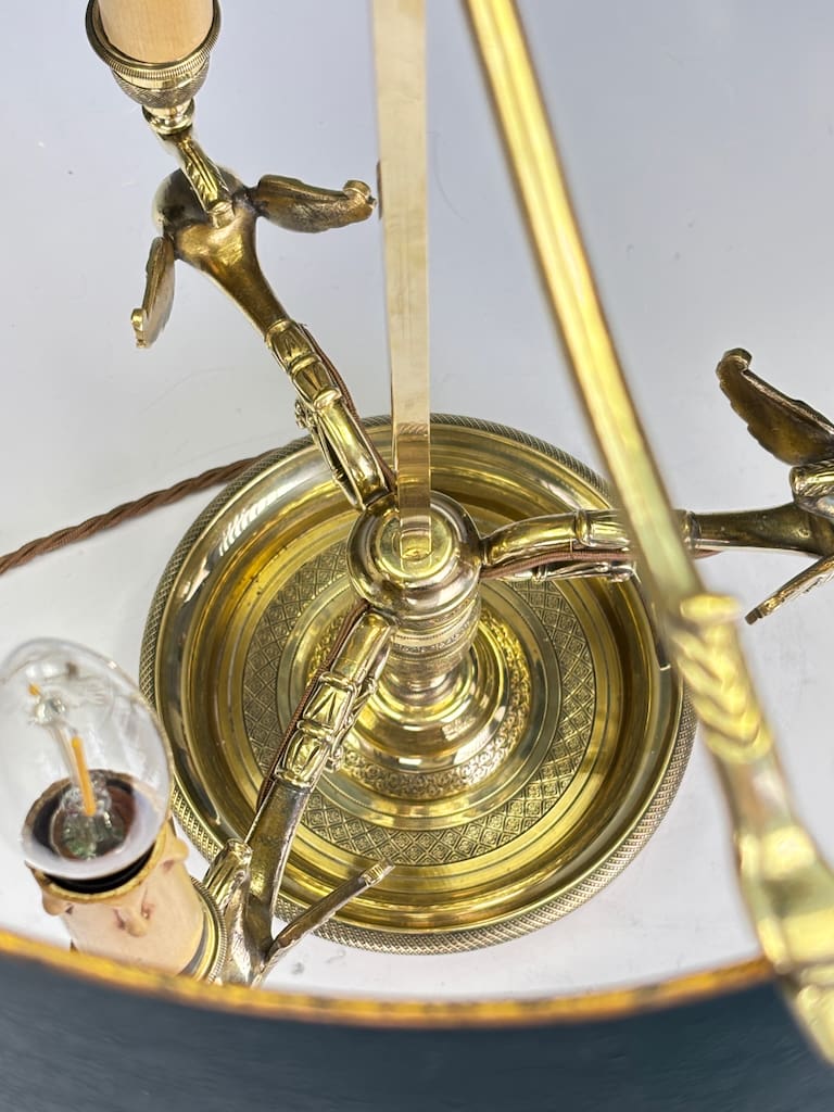 Bouillotte lamps were originally conceived in late 18th-century France to accompany the popular card game bouillotte, and their characteristic adjustable tole shades were designed to control light. This example belongs to the next wave of such pieces, around 1900, when the Empire style saw a refined revival during the Belle Époque — blending classical taste with modern electric functionality.