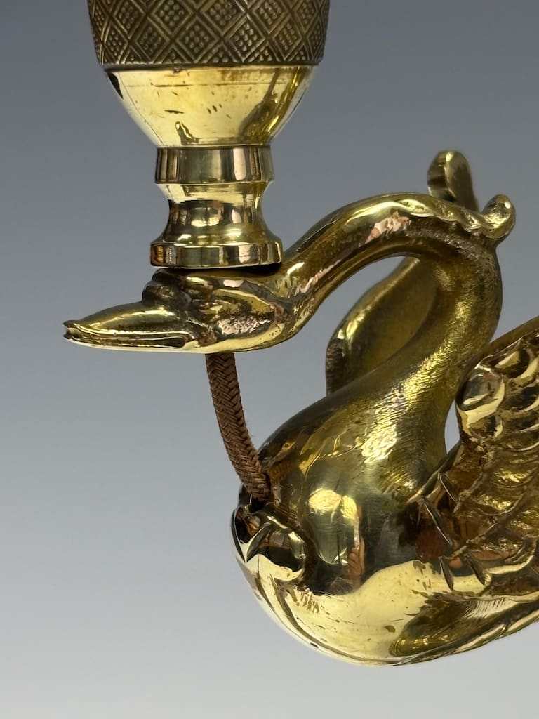 The detailing is exemplary: swan motifs, associated with the Empress Joséphine and the decorative grandeur of the First Empire, are sharply defined and ornately rendered. The lamp retains its original gilt finish and presents with a rich, warm patina throughout.