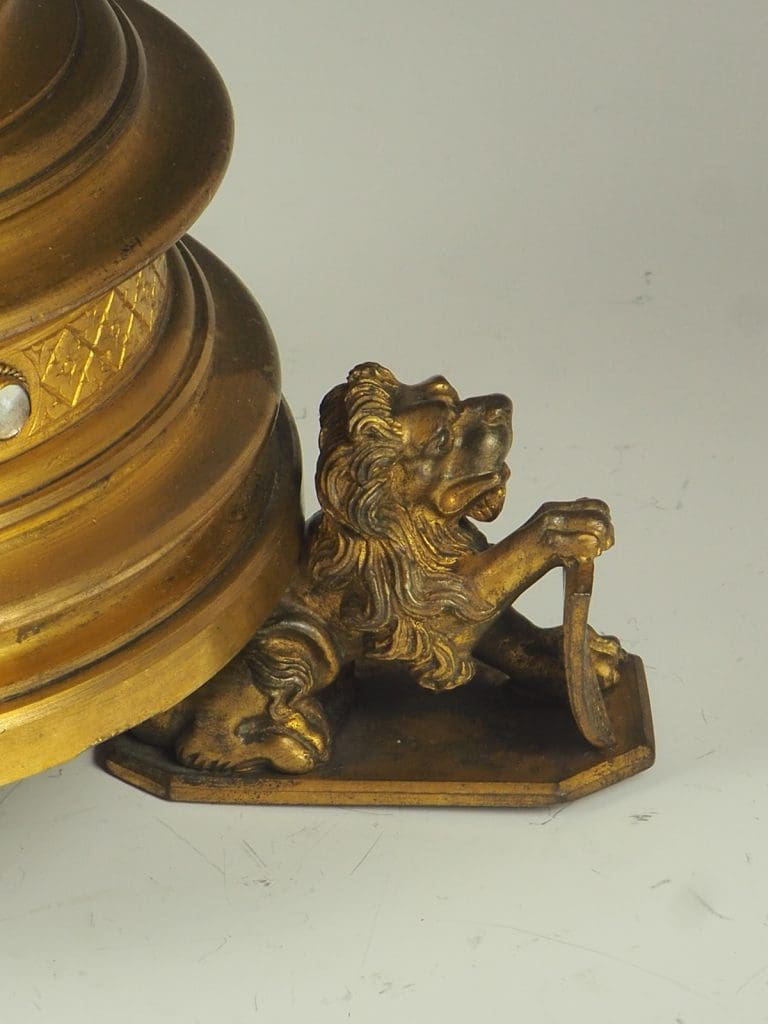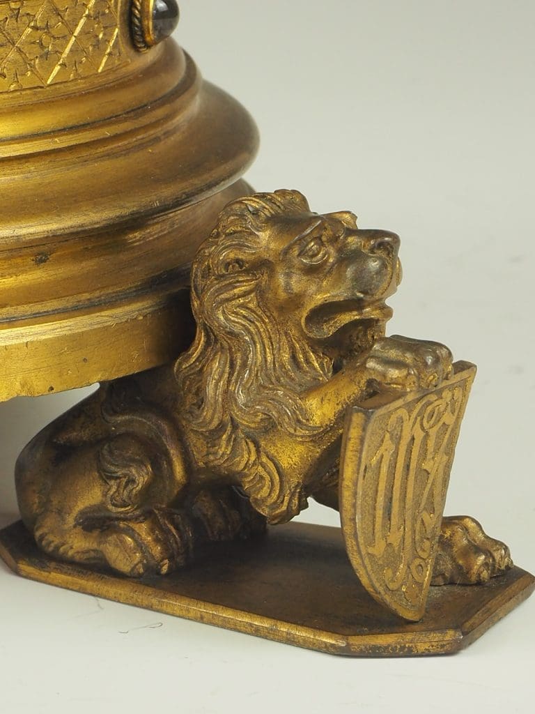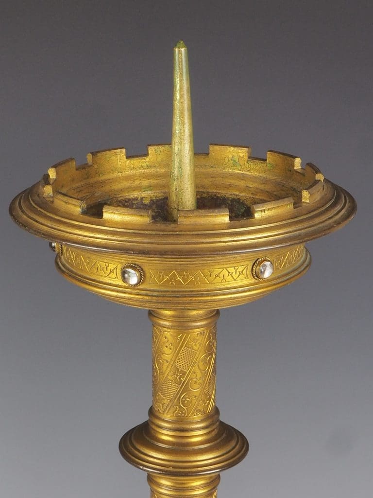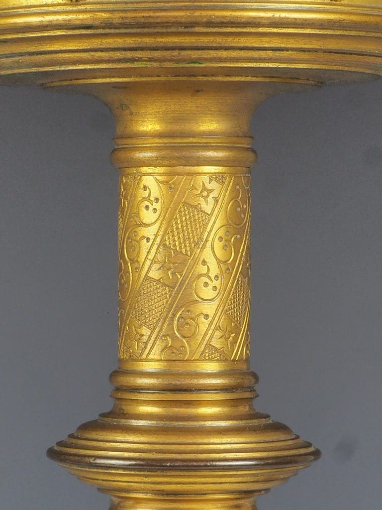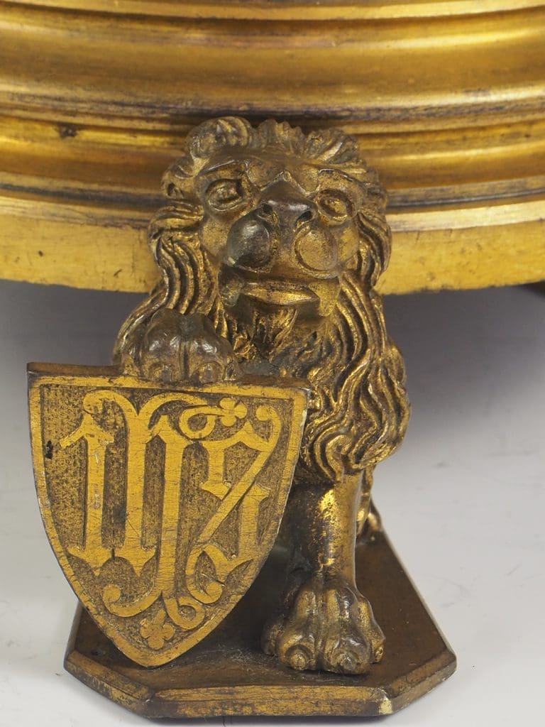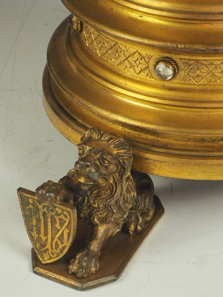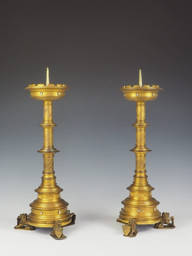 Description Truly exquisite pair of gilt bronze Gothic Revival church candleholders from the 19th century is a remarkable addition to any religious or antique collection. Crafted with meticulous attention to detail, these candleholders feature a stunning design that showcases the grandeur of the era. At the base of each candleholder, three majestic lions stand proud, holding shields, adding a touch of regality to the overall aesthetic.