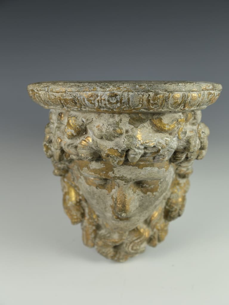 This vintage decorative gilt cast concrete Alexander the Great dispaly shelf is in good condition, displaying a natural aged patina that enhances its classical charm.