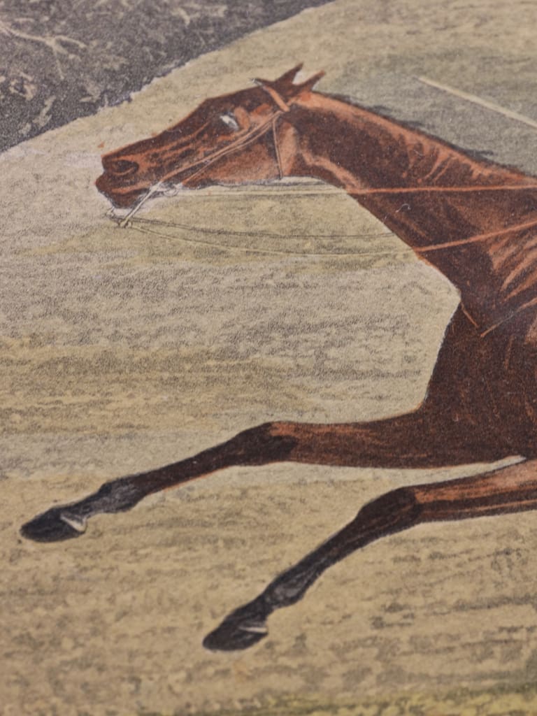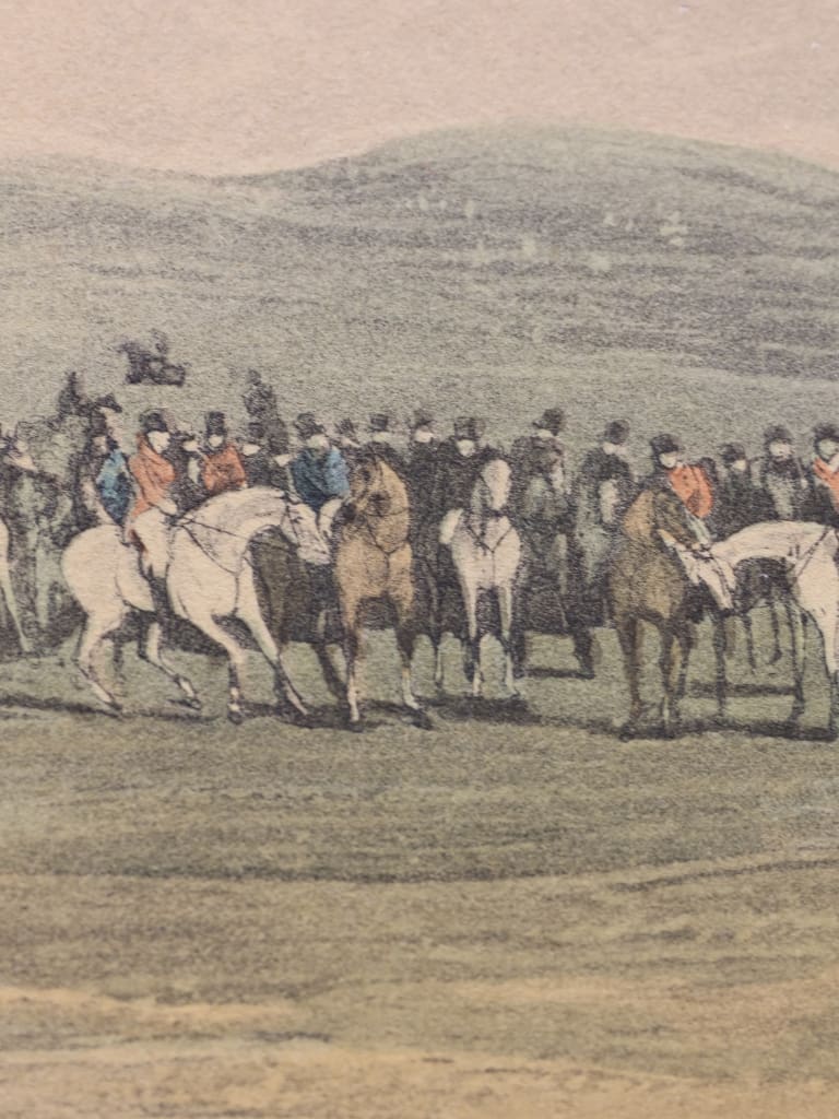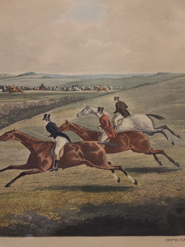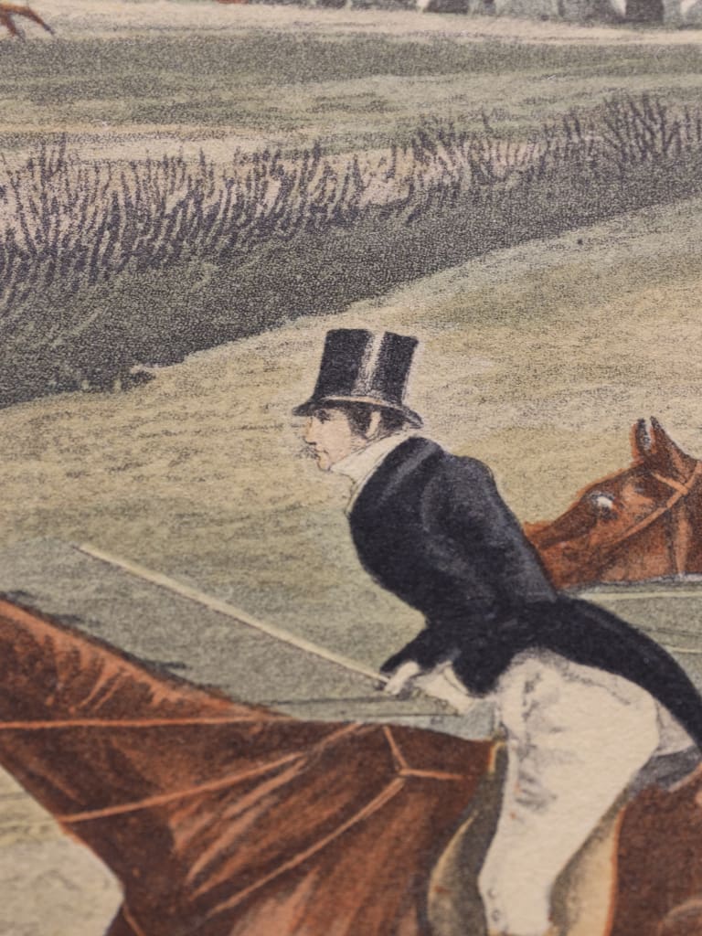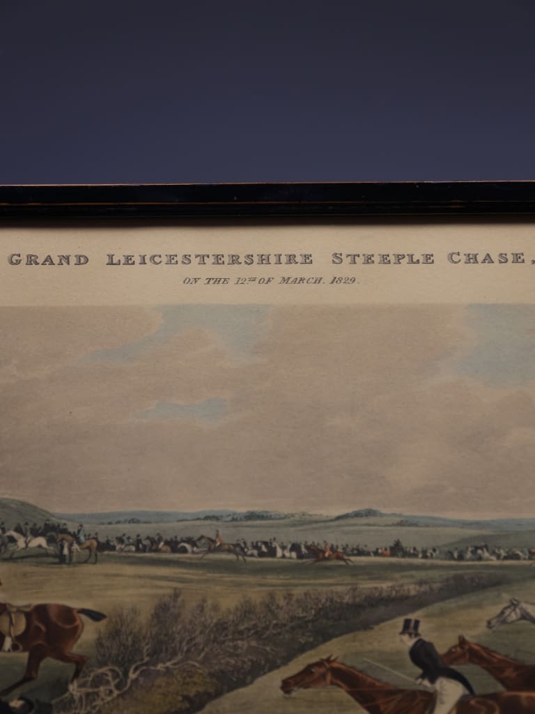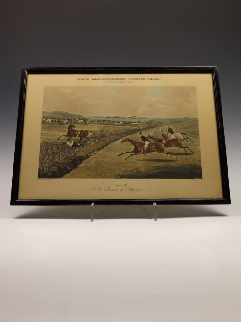 This print is a superb example of a sporting classic, detailing the exhilarating moment of misfortune in the inaugural Grand Leicestershire Steeple Chase—the precursor to the Grand National. The action-packed scene, combined with the clear hand-colouring, makes this a truly engaging historical document and a highly decorative piece for any enthusiast of equestrian sports or fine Georgian/Regency period collecting. Presented in a sympathetic later frame.
