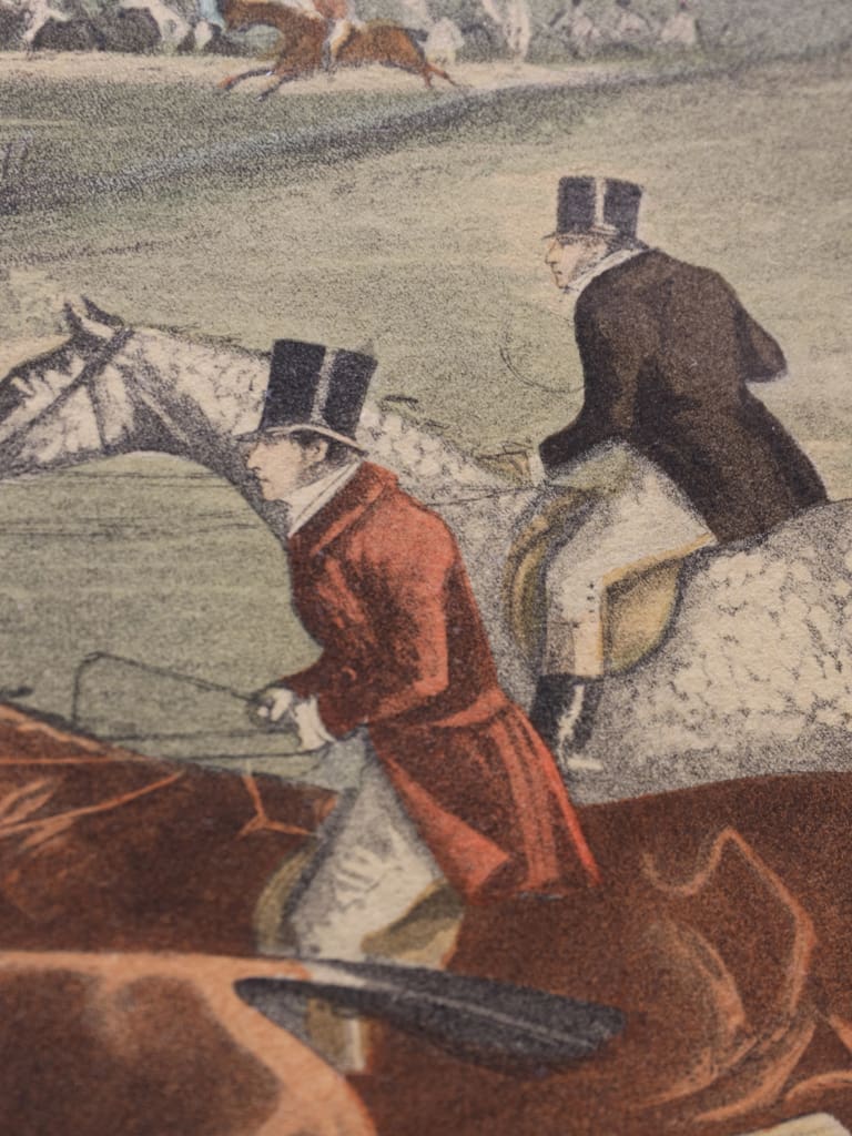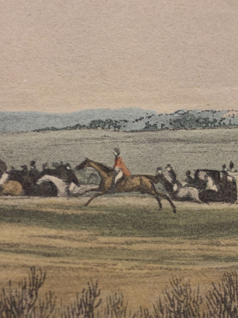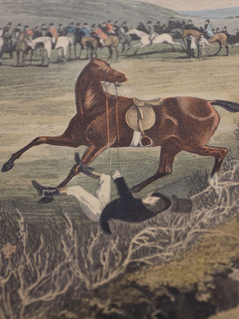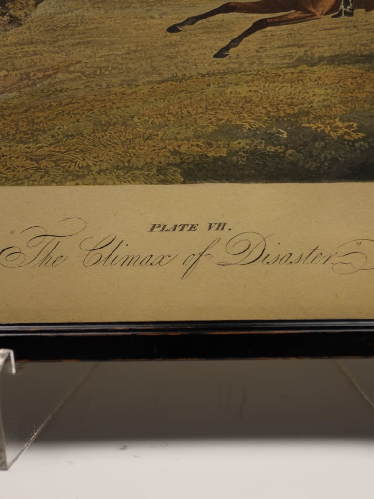 We are delighted to offer this exceptional hand-coloured aquatint, "The Climax of Disaster," Plate VII from the famous series The Grand Leicestershire Steeple Chase, On the 12th of March, 1829. This print captures the dramatic and often humorous chaos of early English steeplechasing, making it a compelling piece of British sporting art.