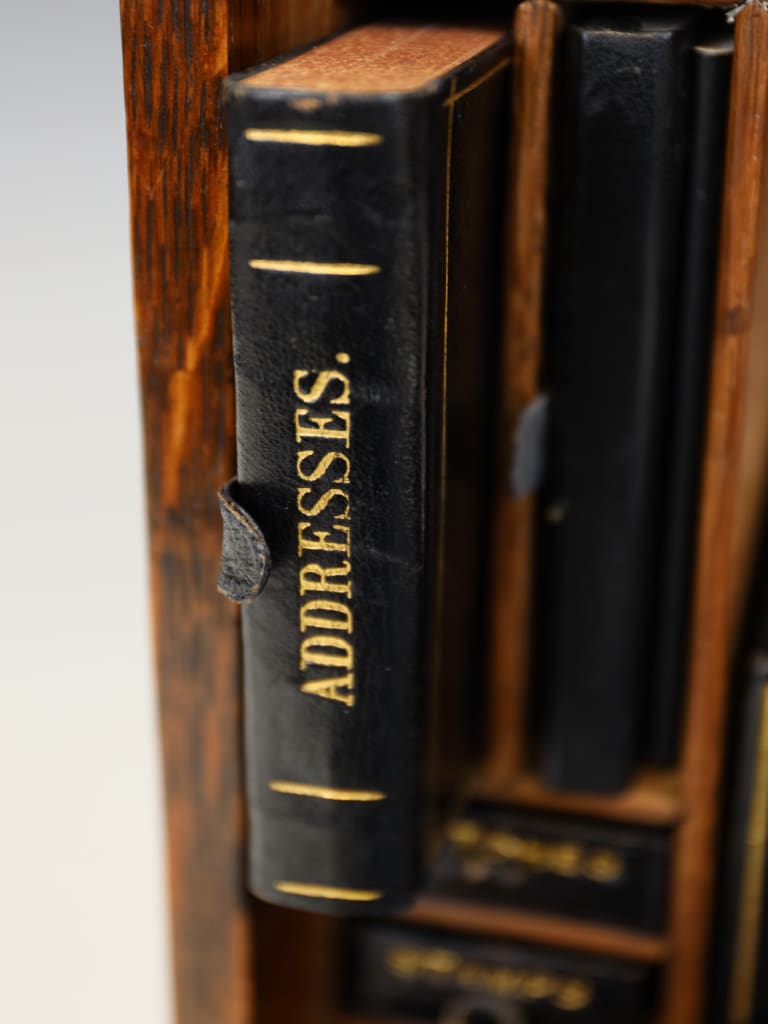 The paper ephemera shows expected age-toning. The bindings of the books show minor historical wear but remain structurally sound and entirely legible. One original book has been replaced with a blank.
